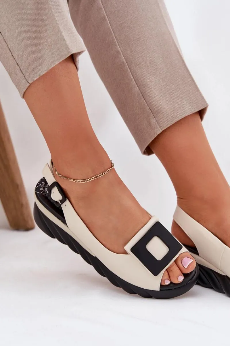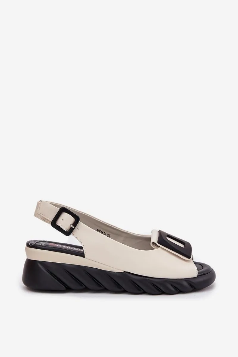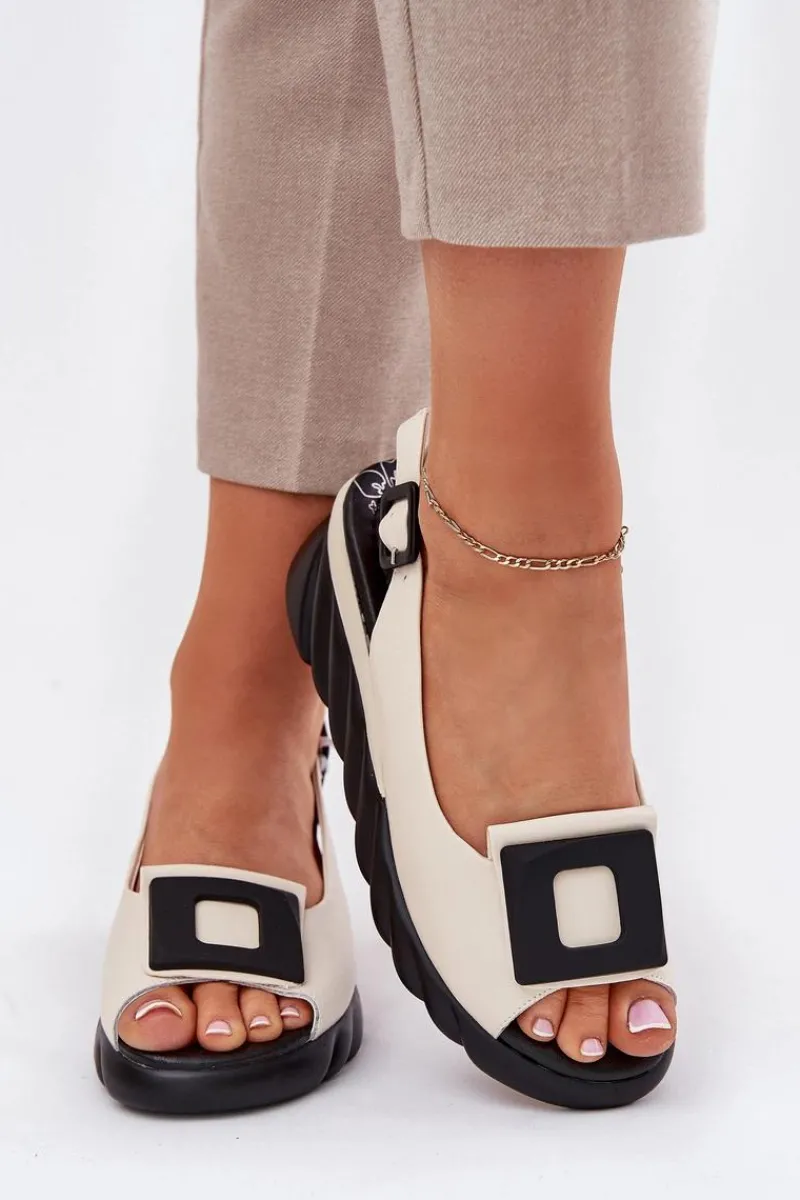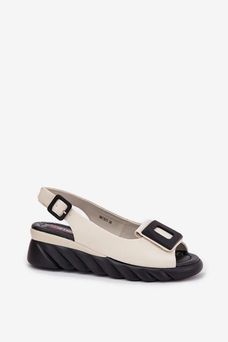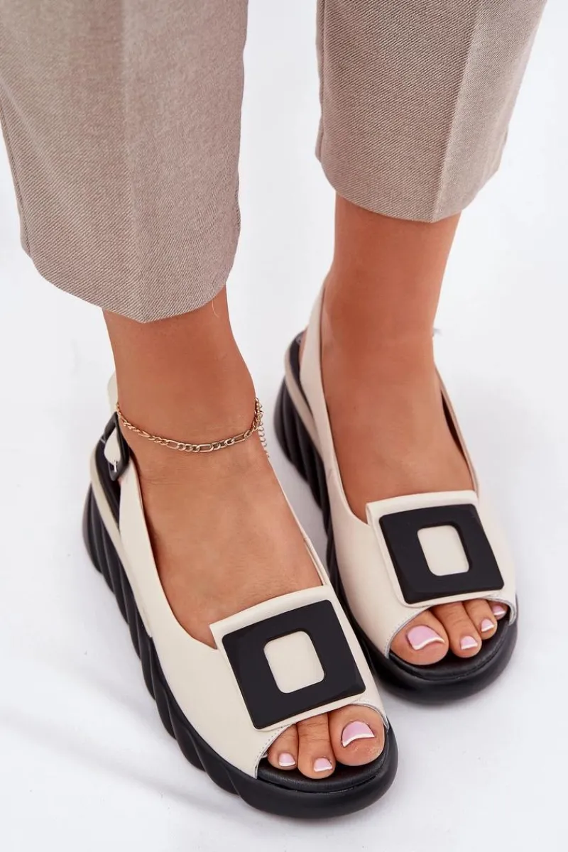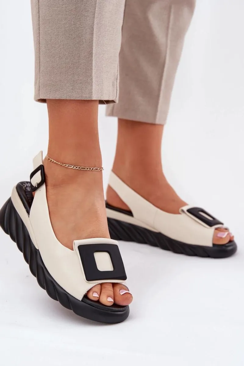 Damskie sandały z naturalnej skóry, osadzone na koturnie, to elegancki wybór na ciepłe dni. Model wyróżnia się ozdobą z przodu, która nadaje im wyjątkowego charakteru. Zapinane na klamrę z regulowanym paskiem, zapewniają idealne dopasowanie do stopy. Dodatkowo miękka wkładka gwarantuje komfort przez cały dzień. Te sandały będą doskonałym wyborem do letnich stylizacji, łącząc elegancję z wygodą. Przy wyborze rozmiaru prosimy sugerować się tabelą rozmiarów.