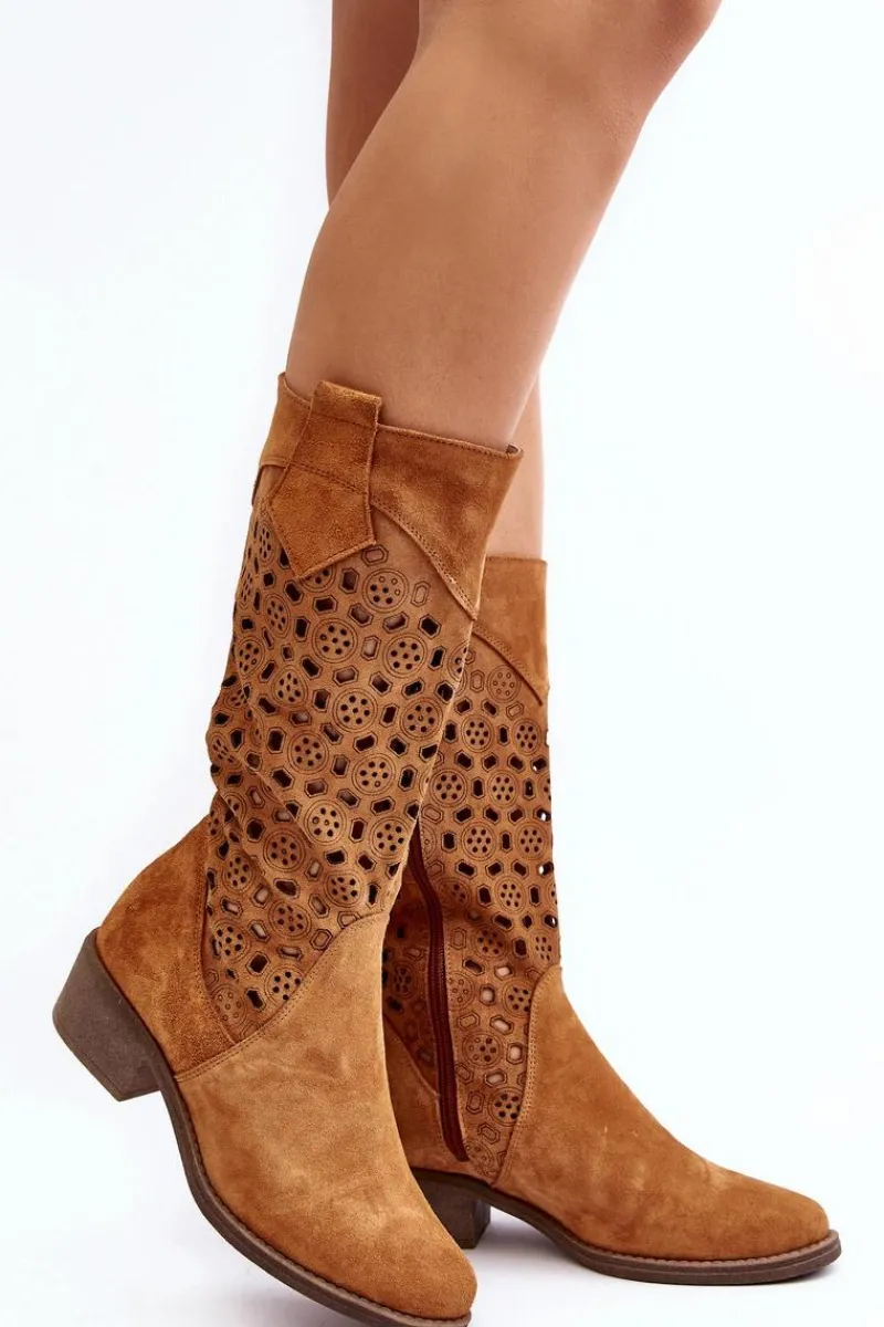 Kozaki damskie z cholewką do połowy łydki. Wykonane z naturalnego zamszu. Osadzone na niskim obcasie. Zapinane na suwak z boku. Noski w migdał. Usztywniony zapiętek. Skórzana wkładka zapewni komfort użytkowania obuwia. Ten modny model w ażurowy wzór wykorzystasz do wielu jesiennych stylizacji! Przy wyborze rozmiaru prosimy sugerować się tabelą rozmiarów.