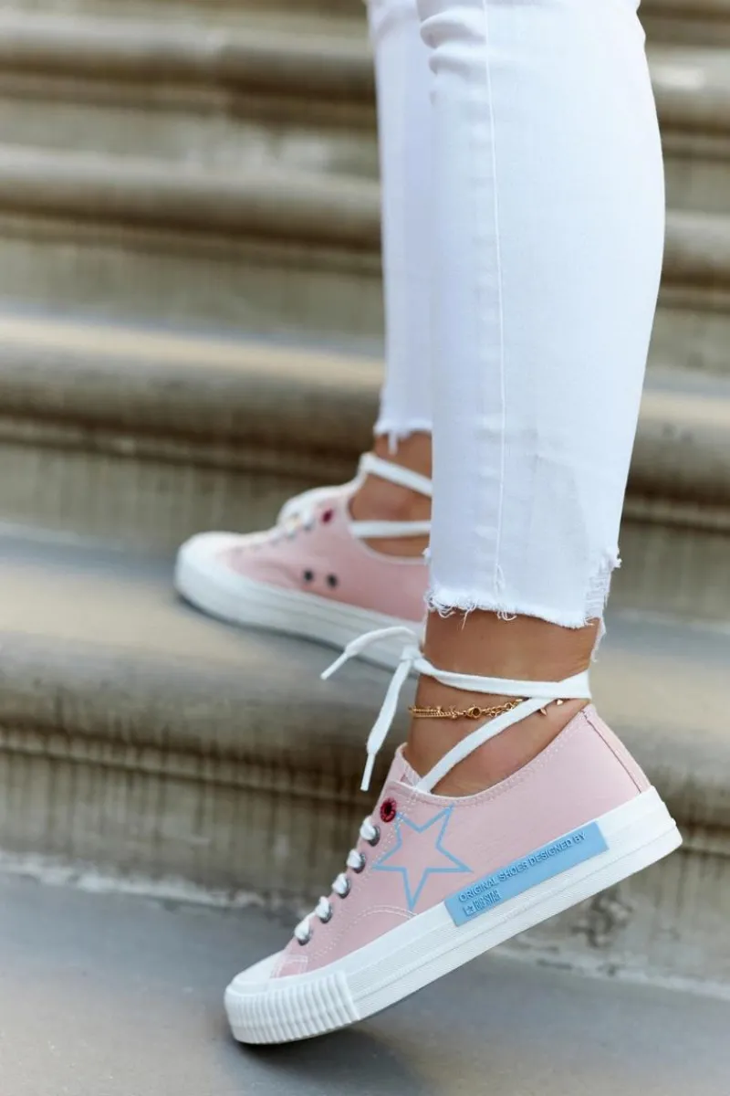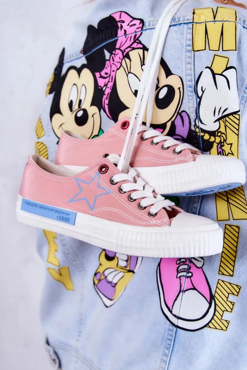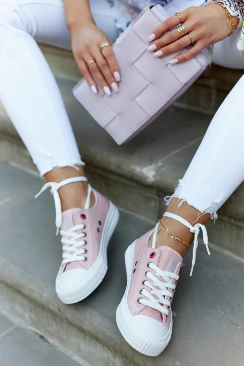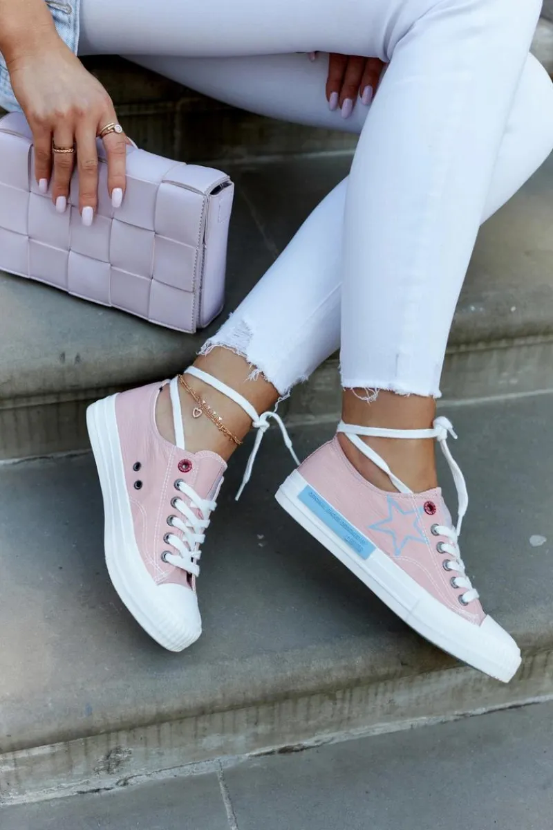 Damskie, klasyczne trampki idealne do wielu stylizacji! Posiadają klasyczne wiązanie. Model wykonany z gładkiego, śliskiego materiału tekstylnego, który jest łatwy w utrzymaniu czystości. Nosek jest wzmacniany gumowym tworzywem. Podeszwa jest elastyczna oraz antypoślizgowa. Miękka wkładka gwarantuje wygodę podczas długich spacerów czy pieszych wycieczek. Przy wyborze rozmiaru prosimy sugerować się tabelą rozmiarów.