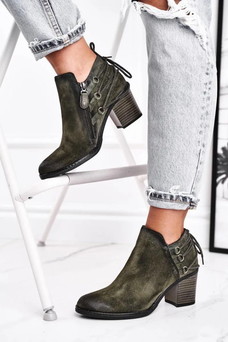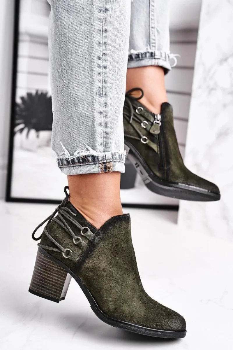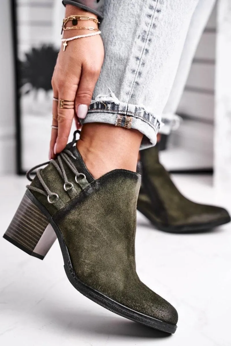 Discount Botki Damskie Na Słupku Wiosenne Skóra Oliwkowe 04812-24 Damskie Botki Wiosenne|Botki Maciejka