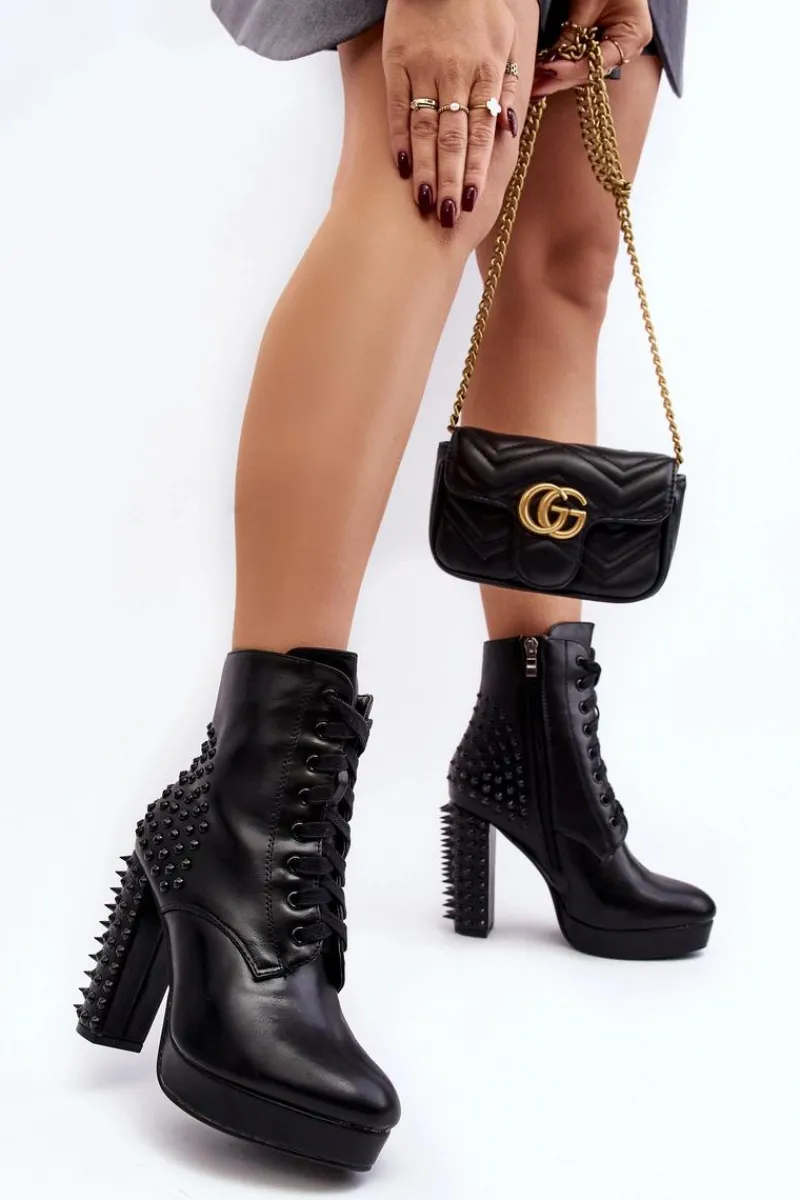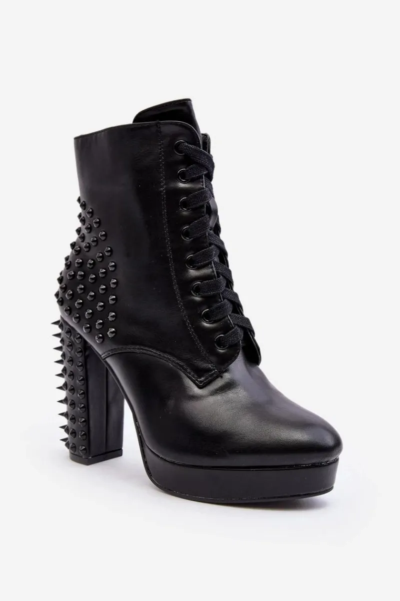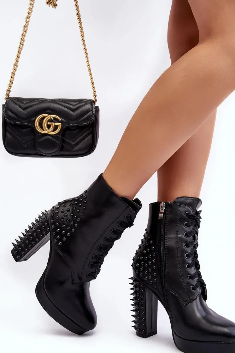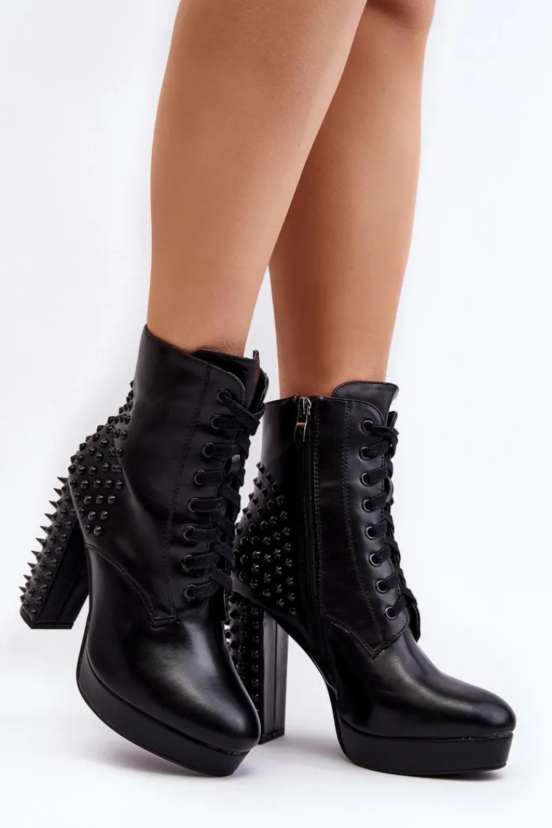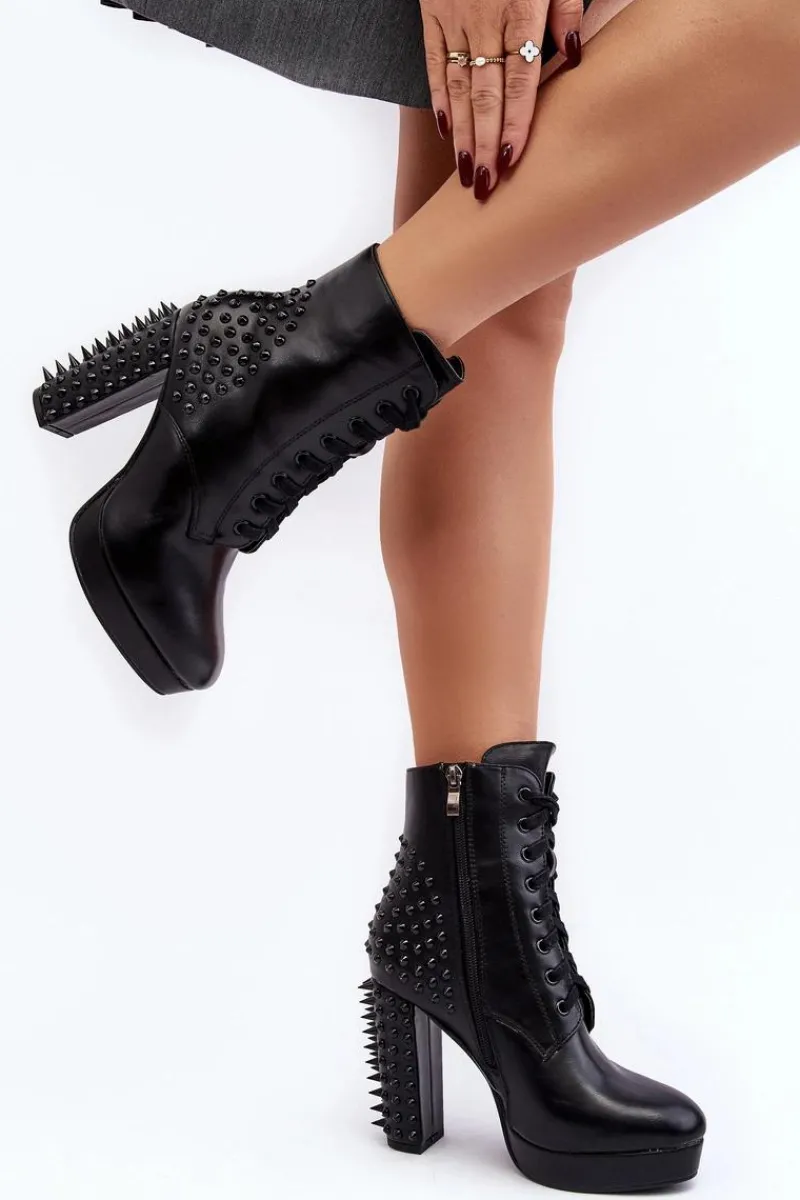 Botki damskie wykonane ze skóry ekologicznej. Cholewka oraz obcas są ozdobione ćwiekami, które dodają im wyjątkowego charakteru. Obcas w formie wysokiego słupka i platforma nadają modny i stylowy wygląd. Nie czekaj, aż znikną. Zrób wrażenie nie tylko na sobie, ale również na innych! Przy wyborze rozmiaru prosimy kierować się tabelą rozmiarów