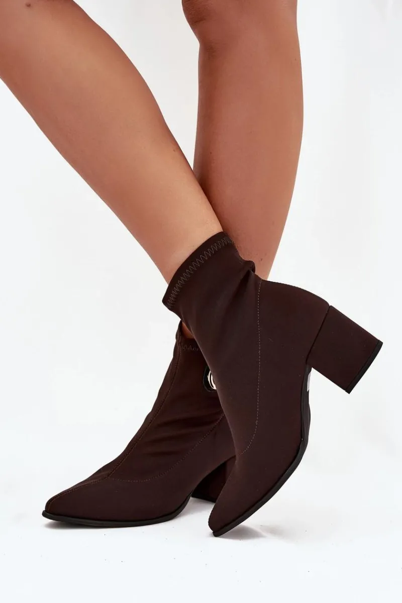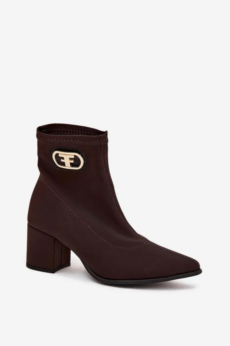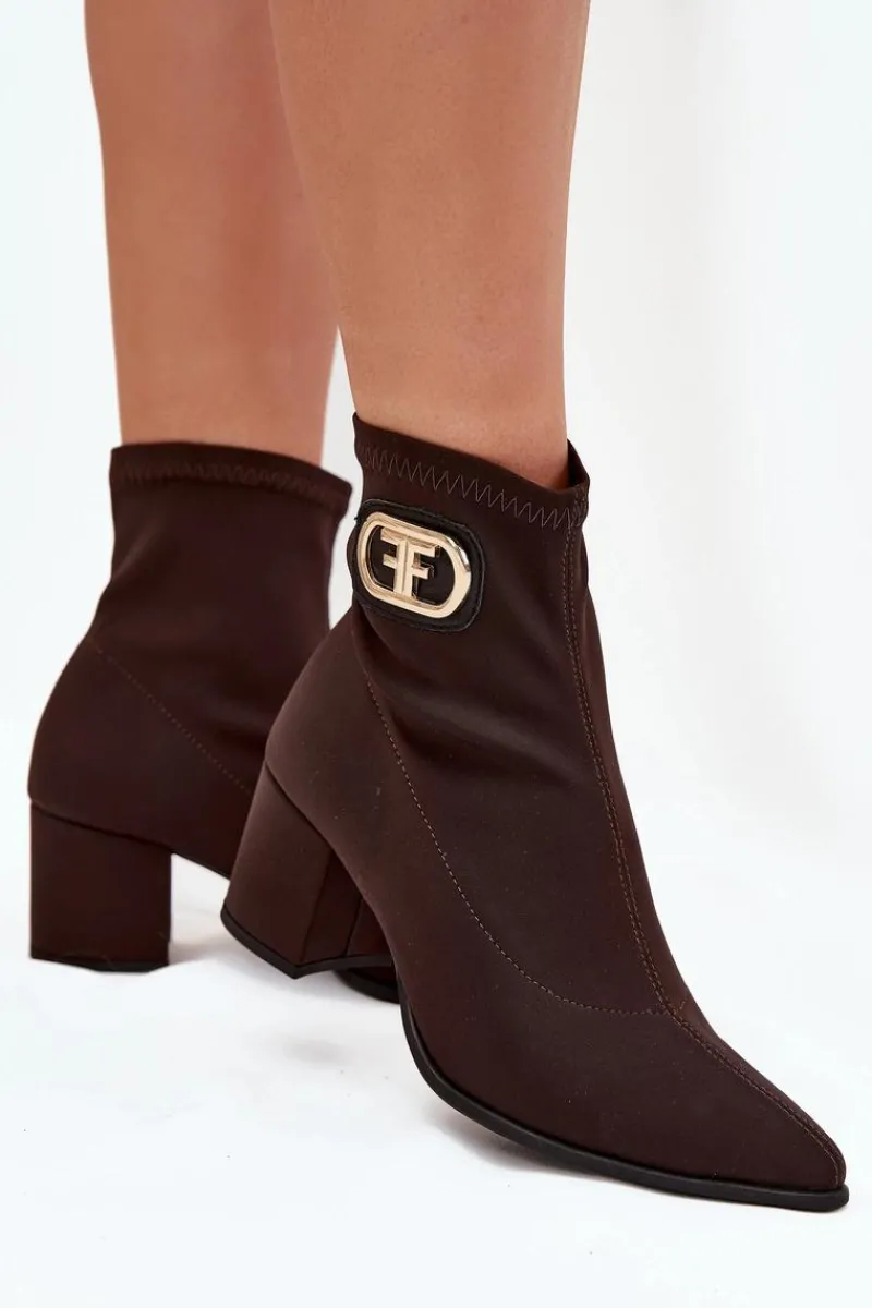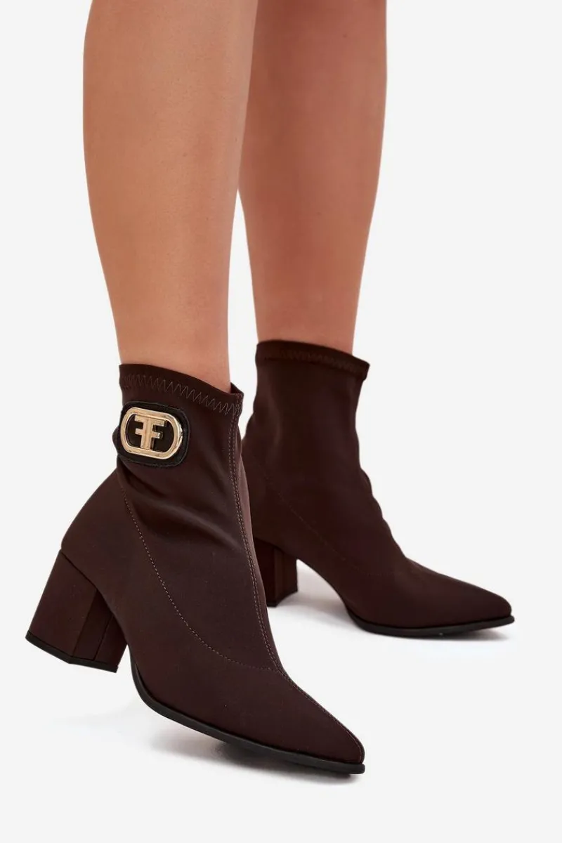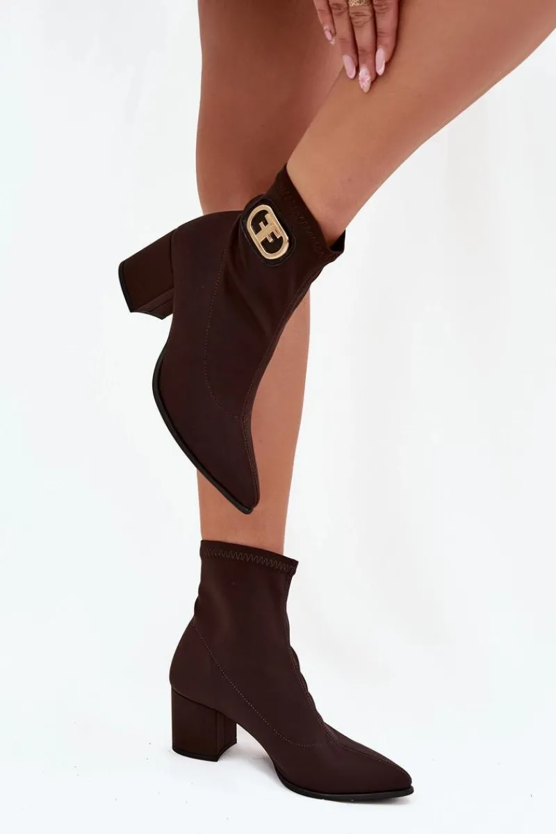 Eleganckie botki damskie wykonane z materiału tekstylnego, osadzone na słupkowym obcasie. Noski w szpic wydłużają nogi, a ozdobny złoty detal na boku cholewki dodaje im wyjątkowego charakteru. Model wsuwany zapewnia łatwość zakładania, a całość doskonale komponuje się z eleganckimi sukienkami, spódnicami czy spodniami, tworząc elegancki look na różne okazje. Przy wyborze rozmiaru prosimy kierować się tabelą rozmiarów