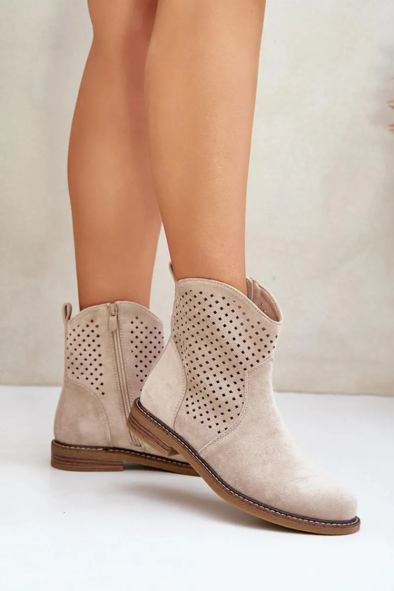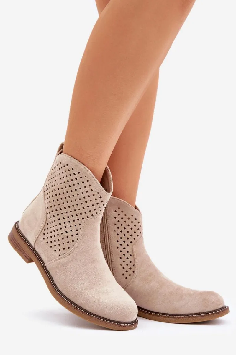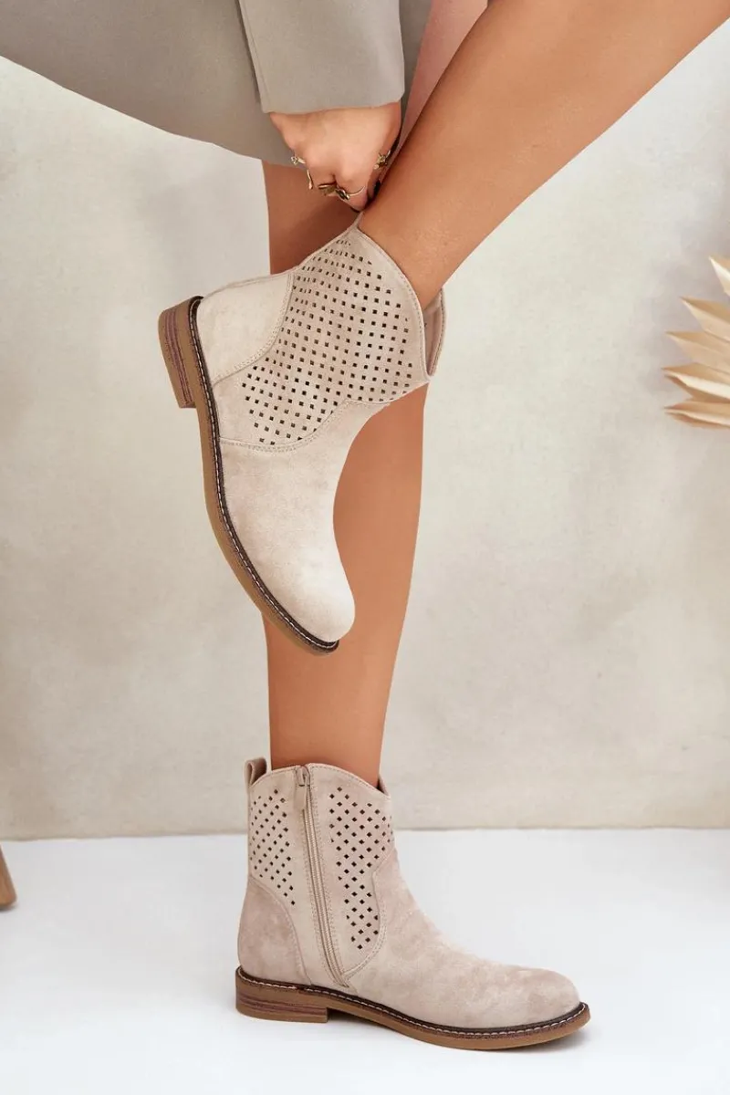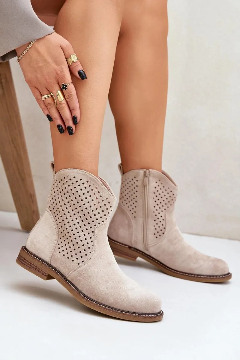 Botki damskie wykonane z eko zamszu to idealny wybór na wiosenne dni. Ażurowa cholewka nadaje im lekkości i zapewnia przewiewność, a zaokrąglone noski dodają subtelności. Model osadzony na płaskim obcasie gwarantuje wygodę noszenia przez cały dzień. Dzięki praktycznemu zapięciu na zamek zakładanie i zdejmowanie butów jest niezwykle łatwe. Skórzana wkładka dba o komfort stóp, czyniąc te botki doskonałym rozwiązaniem zarówno do codziennych, jak i bardziej eleganckich stylizacji. Połączenie stylu i funkcjonalności w jednym! Przy wyborze rozmiaru prosimy sugerować się tabelą rozmiarów.