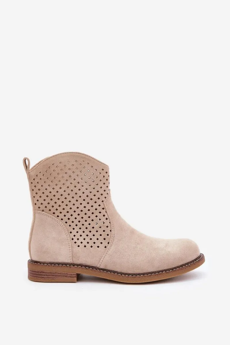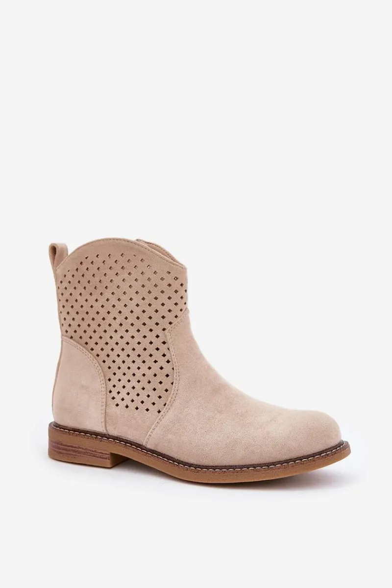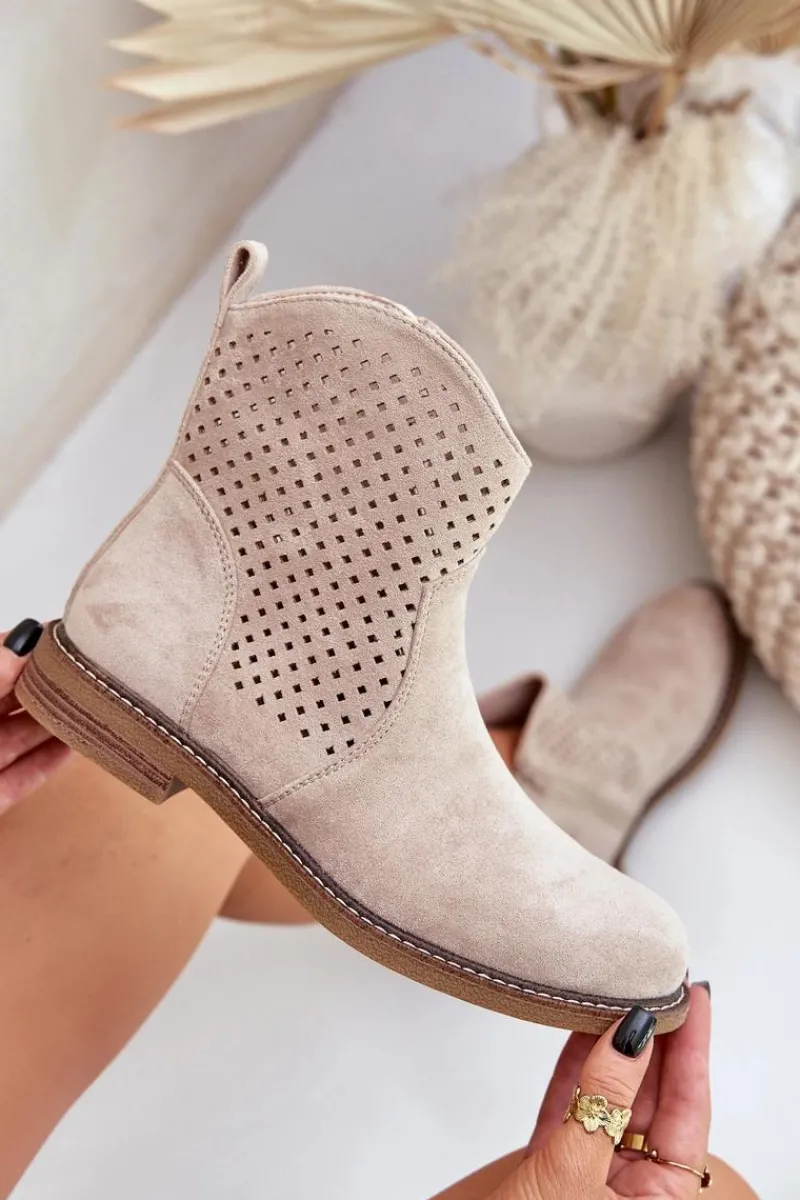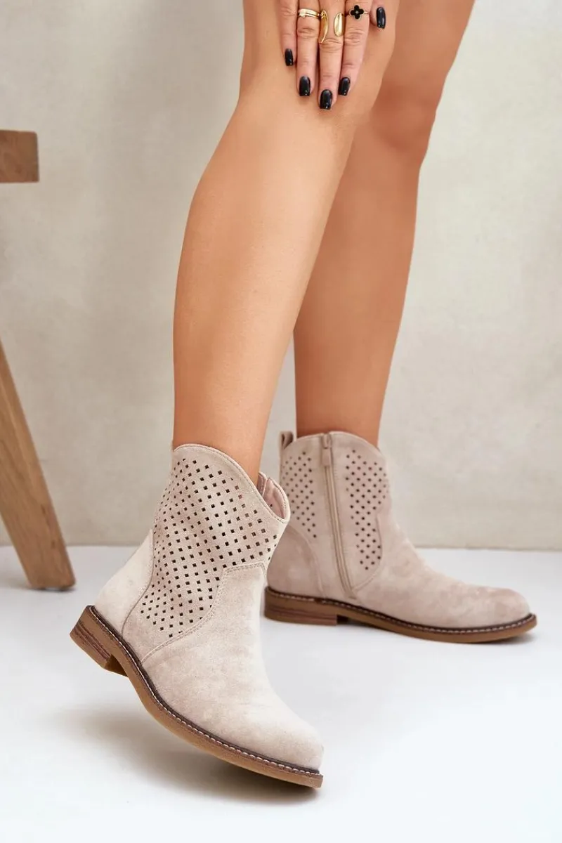 Botki damskie wykonane z eko zamszu to idealny wybór na wiosenne dni. Ażurowa cholewka nadaje im lekkości i zapewnia przewiewność, a zaokrąglone noski dodają subtelności. Model osadzony na płaskim obcasie gwarantuje wygodę noszenia przez cały dzień. Dzięki praktycznemu zapięciu na zamek zakładanie i zdejmowanie butów jest niezwykle łatwe. Skórzana wkładka dba o komfort stóp, czyniąc te botki doskonałym rozwiązaniem zarówno do codziennych, jak i bardziej eleganckich stylizacji. Połączenie stylu i funkcjonalności w jednym! Przy wyborze rozmiaru prosimy sugerować się tabelą rozmiarów.