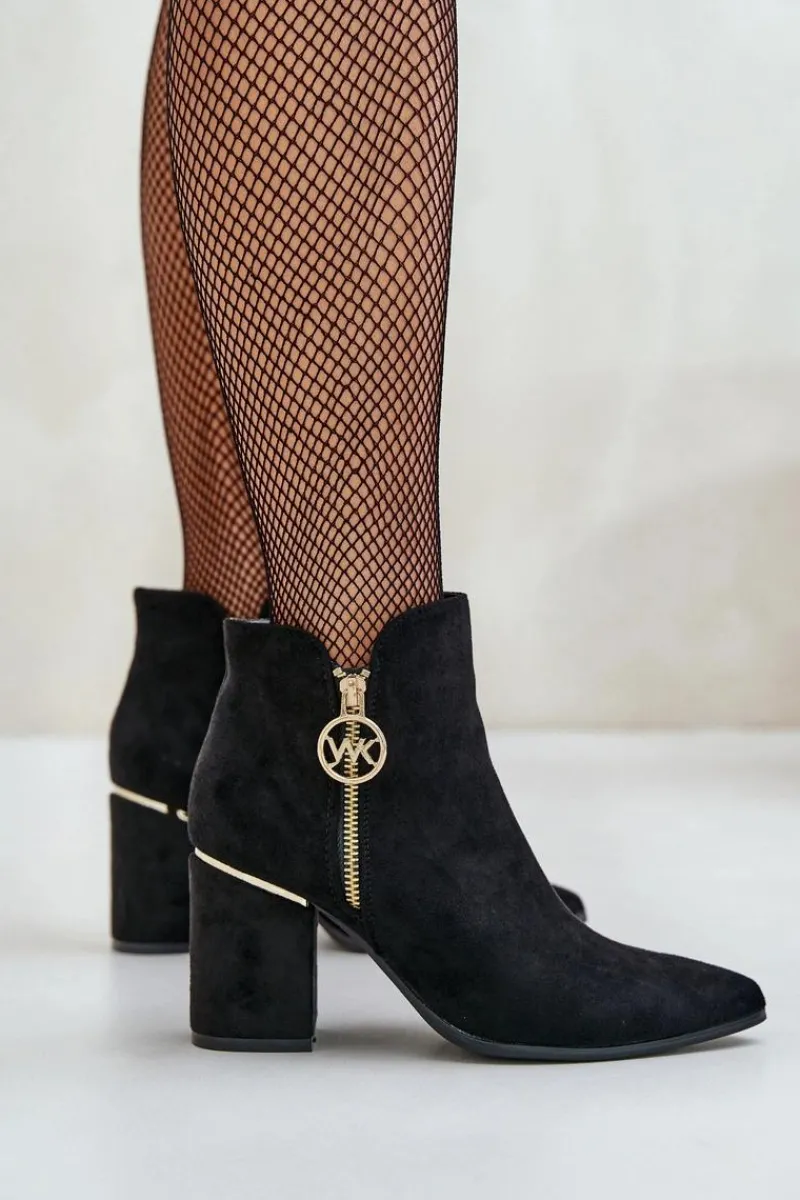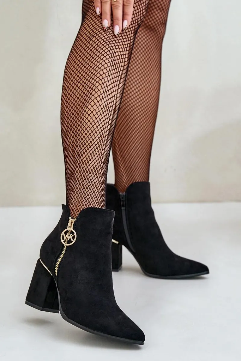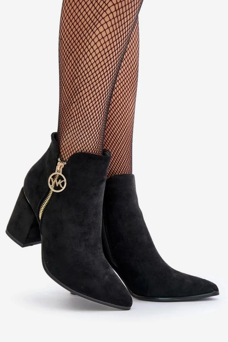 Eleganckie botki z eko zamszu, osadzone na obcasie typu słupek. Wyróżniają się spiczastymi noskami, które nadają im szyku. Wnętrze jest ocieplone, zapewniając komfort w chłodniejsze dni. Zapinane na zamek z boku, dodatkowo ozdobione złotym zamkiem, co dodaje wyjątkowego stylu. Przy wyborze rozmiaru prosimy sugerować się tabelą rozmiarów.