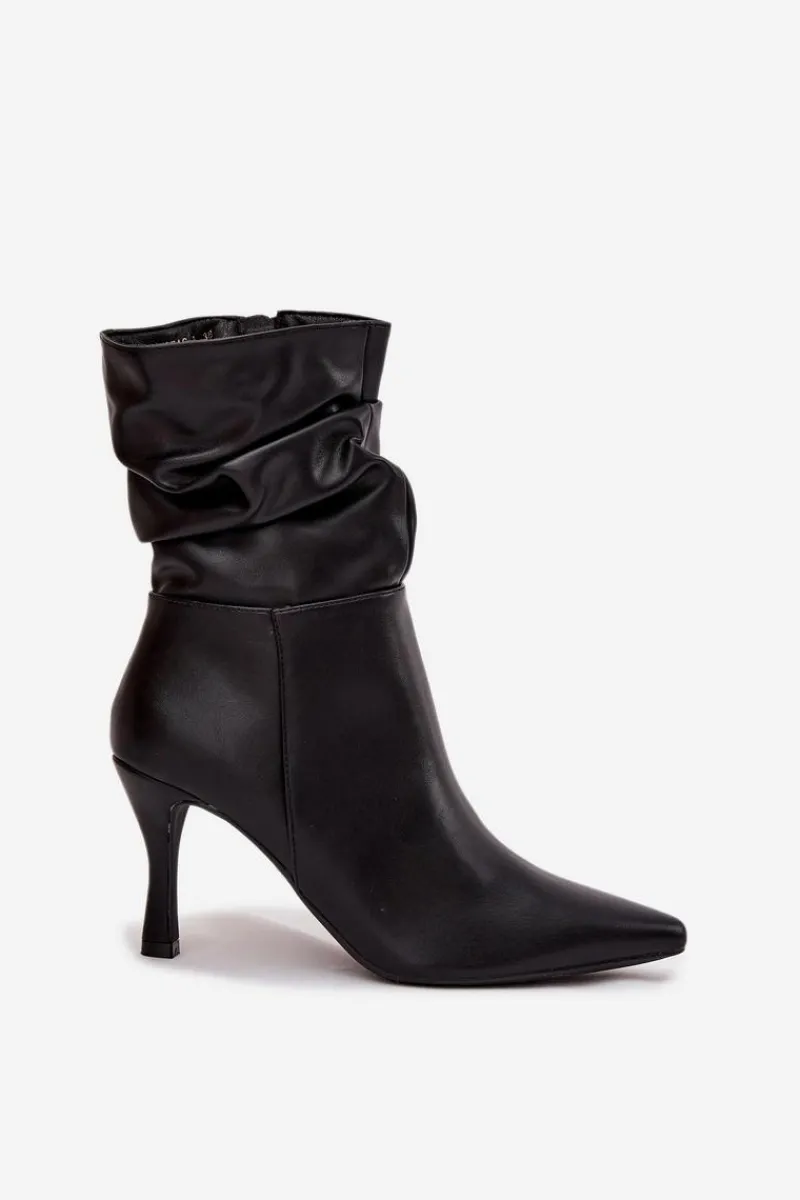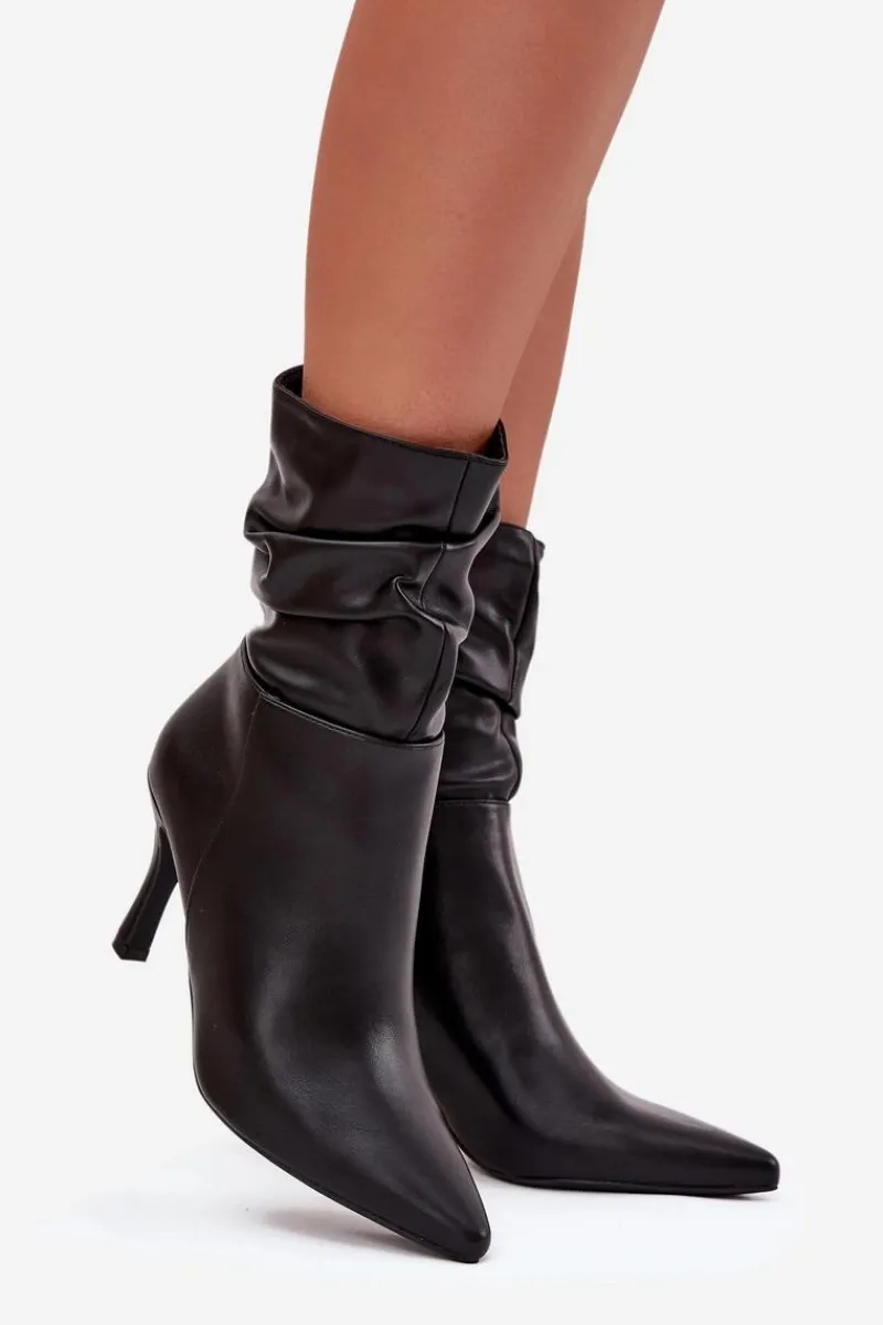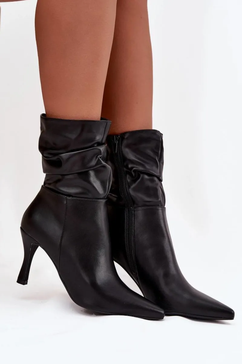Eleganckie botki damskie z marszczoną cholewką to propozycja pełna kobiecego charakteru. Model ze szpiczastymi noskami i smukłą szpilką podkreśla nogi i dodaje stylu każdej stylizacji. Zamek z boku ułatwia szybkie zakładanie i idealne dopasowanie do stopy, czyniąc botki świetnym wyborem na wieczorne wyjścia i eleganckie okazje. Przy wyborze rozmiaru prosimy sugerować się tabelą rozmiarów.