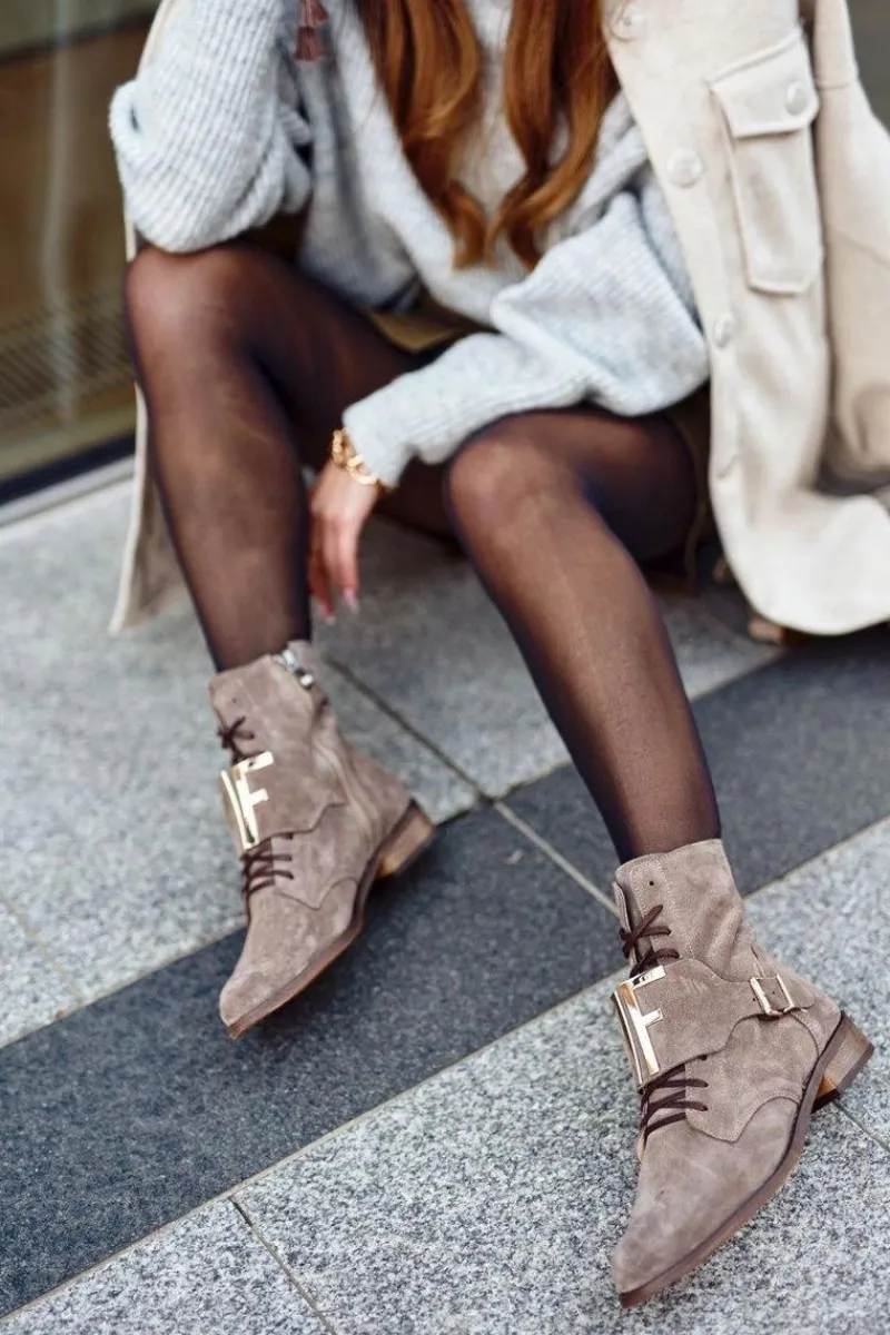 Buty zostały wykonane z naturalnego zamszu. Zdobienie w postaci dużej klamry oraz złotych literek pięknie podkreśla ich wyjątkowy styl. Zakładanie ułatwi wszyty na boku suwak, natomiast o lepsze dopasowanie zadbają sznurowadła. Botki oparte na delikatnym płaskim obcasie. Przy wyborze rozmiaru prosimy sugerować się tabelą rozmiarów.