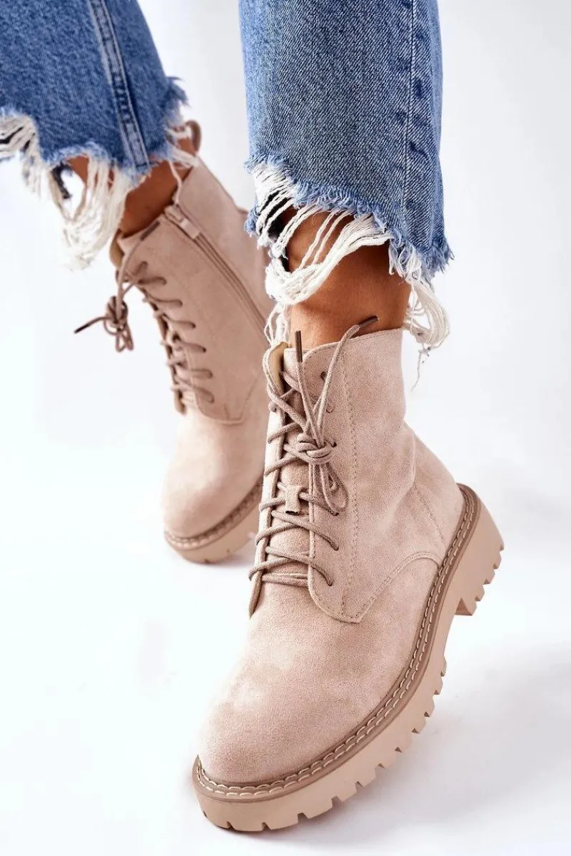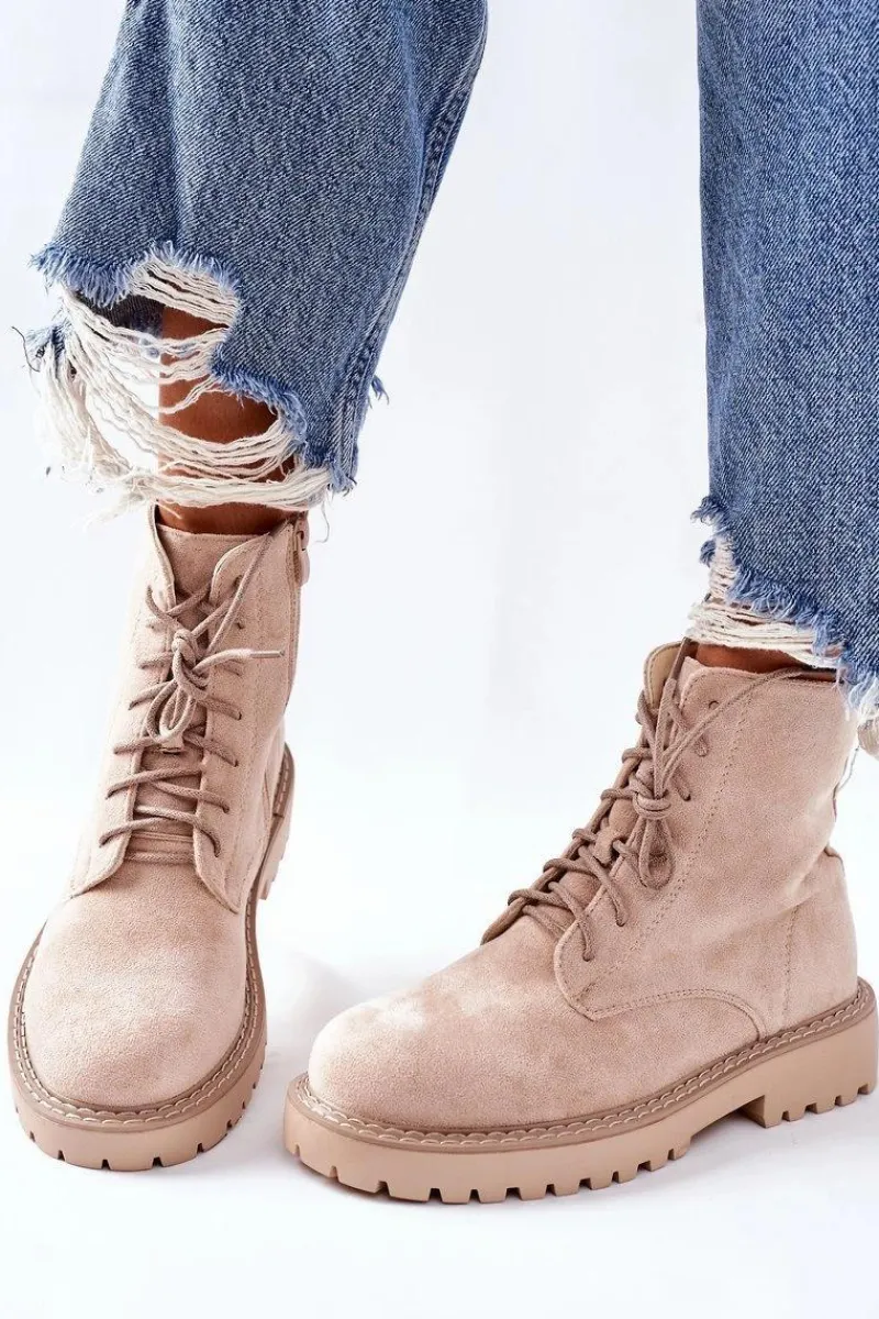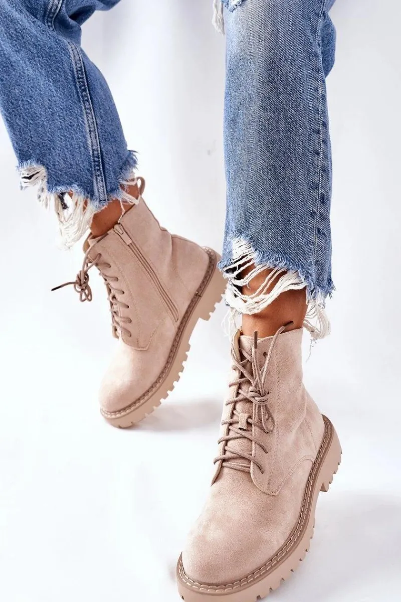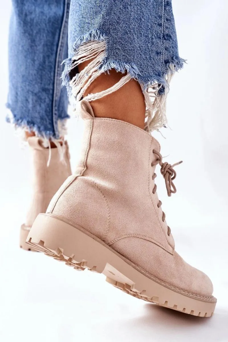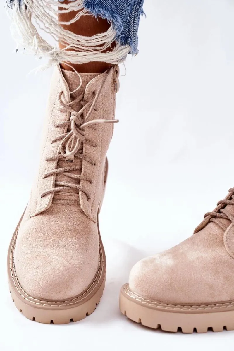 Botki damskie wykonane z zamszowej skóry ekologicznej. Posiadają zapinanie na zamek z boku. Przy wyborze rozmiaru prosimy sugerować się tabelą rozmiarów.