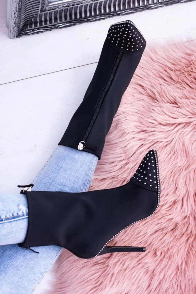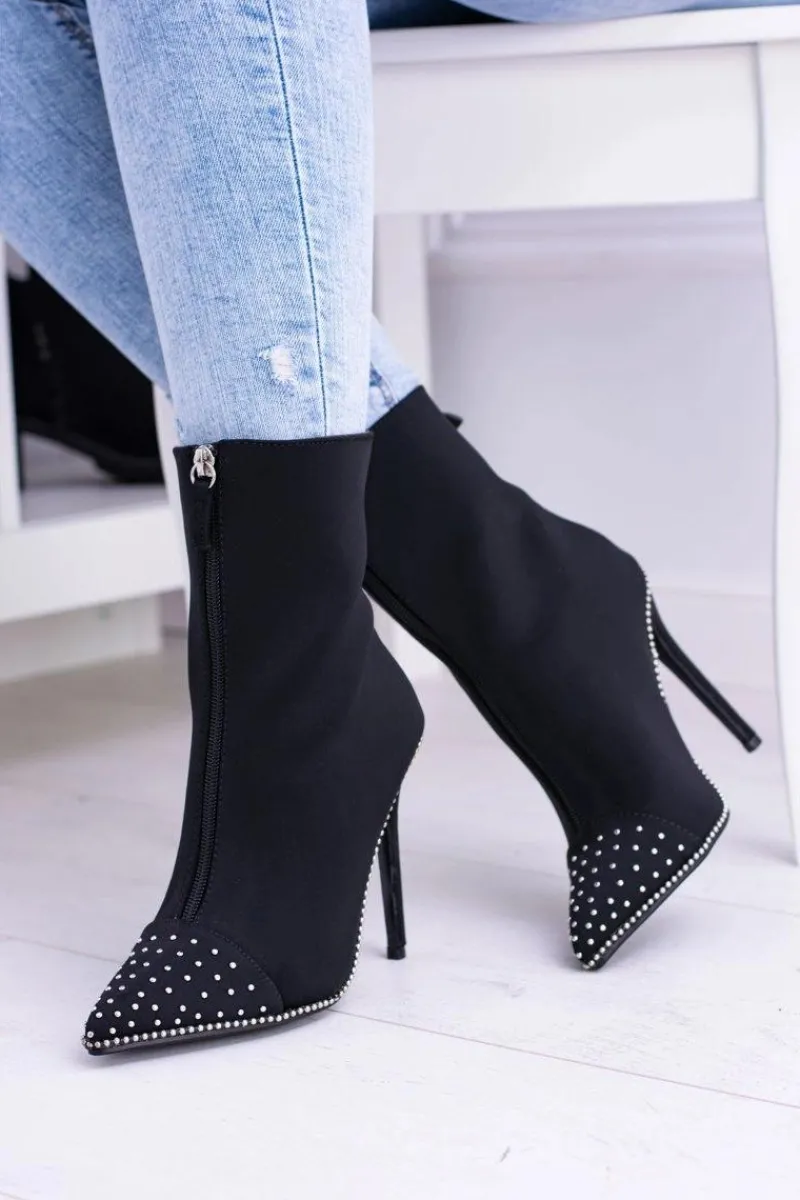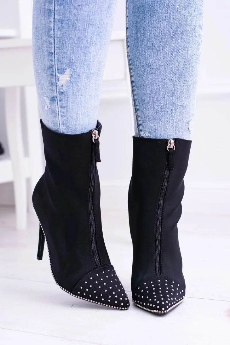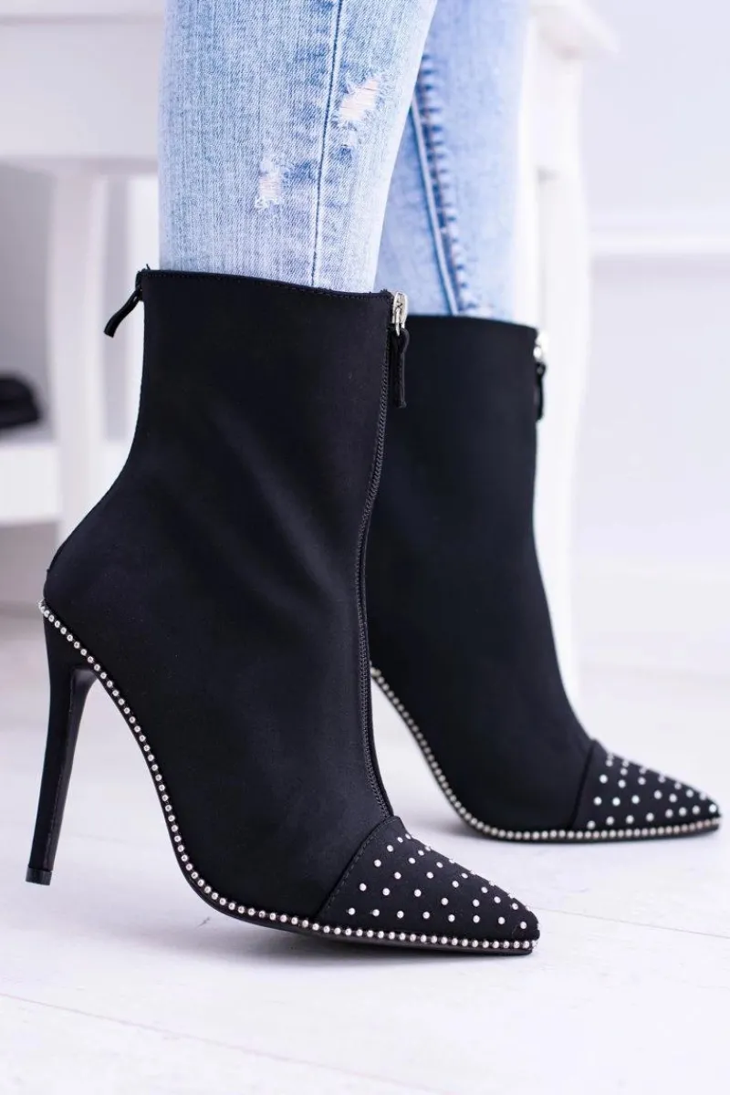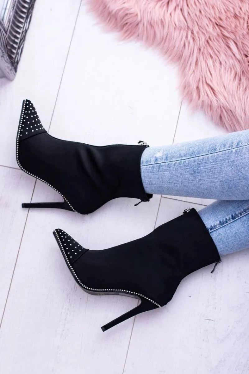 Niezwykle modne botki w tym sezonie! Wyjątkowy styl i eleganckie wykonanie sprawiają że są jednym z najbardziej rozchwytywanych modeli tego sezonu!Wierzch wykonany z miękkiego zamszu. Zastosowanie delikatnej wyściółki oraz stabilnej szpilki podniesie uczucie komfortu. Niezwykle eleganckie botki ze srebrnym i delikatnym zdobieniem – to coś co musisz mieć! Nie czekaj dłużej i kup teraz w doskonałej cenie!
