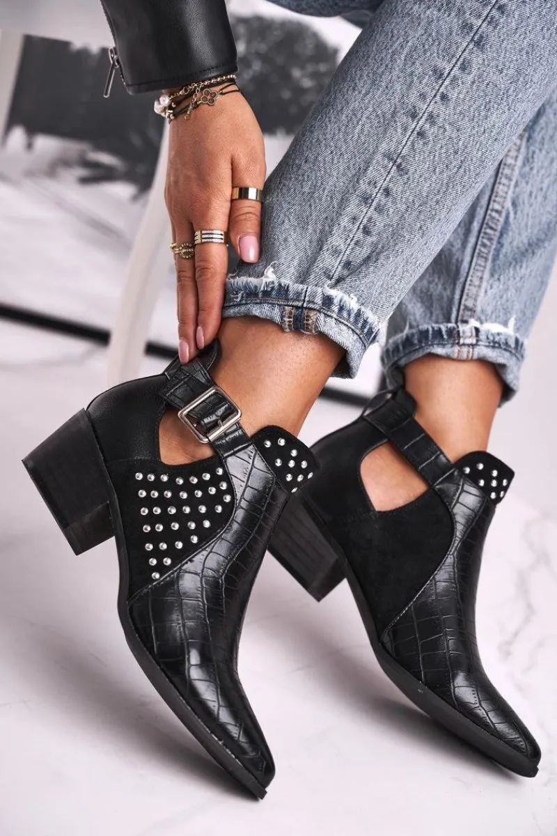Czarne botki w klasycznej wersji z noskiem w szpic. Posiadają wcięcia na boku cholewki oraz klamrę co ułatwi ich zakładanie. Osadzone na niewysokim obcasie co podkreśli Twoją sylwetkę. Przy wyborze rozmiaru prosimy sugerować się tabelą rozmiarów.