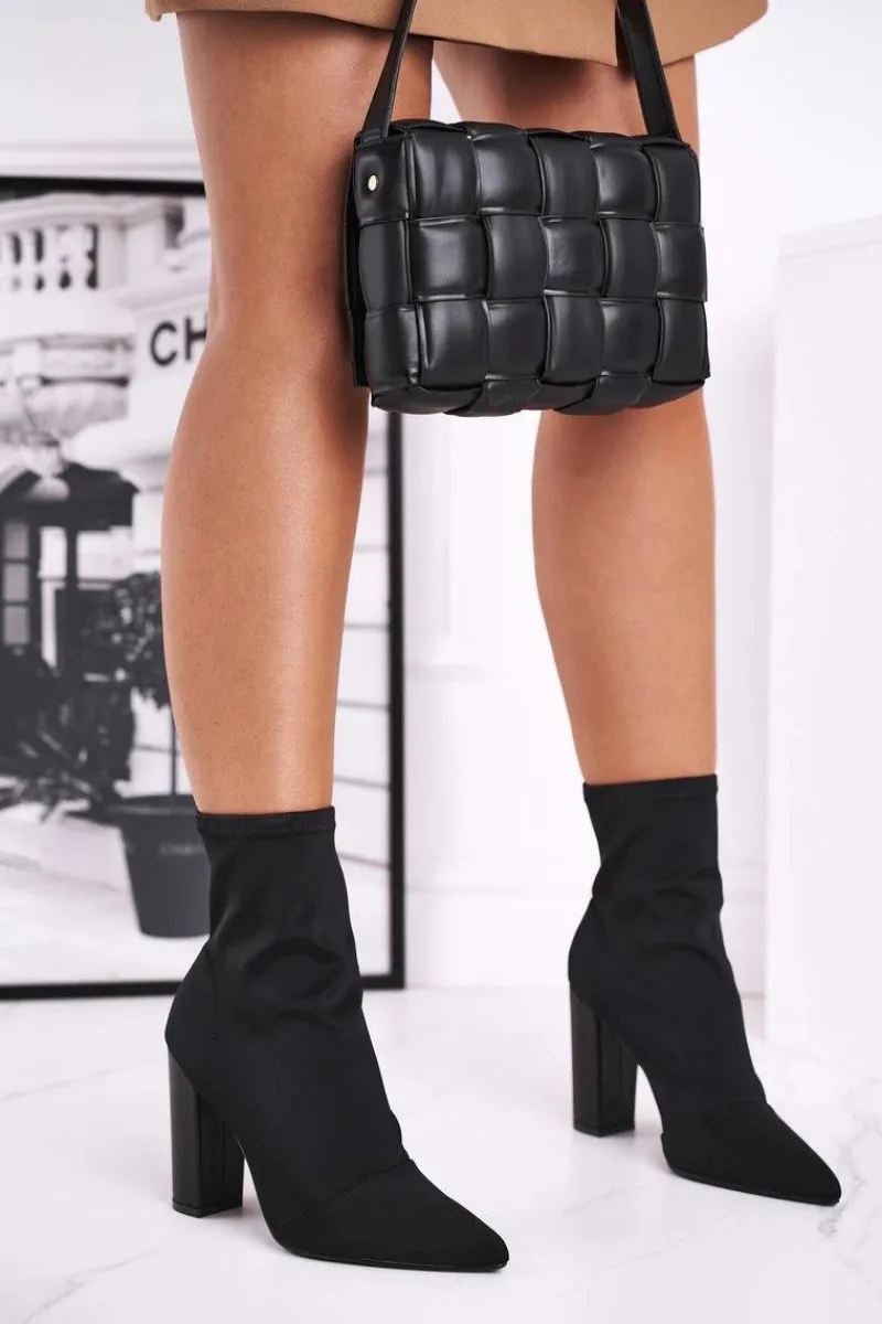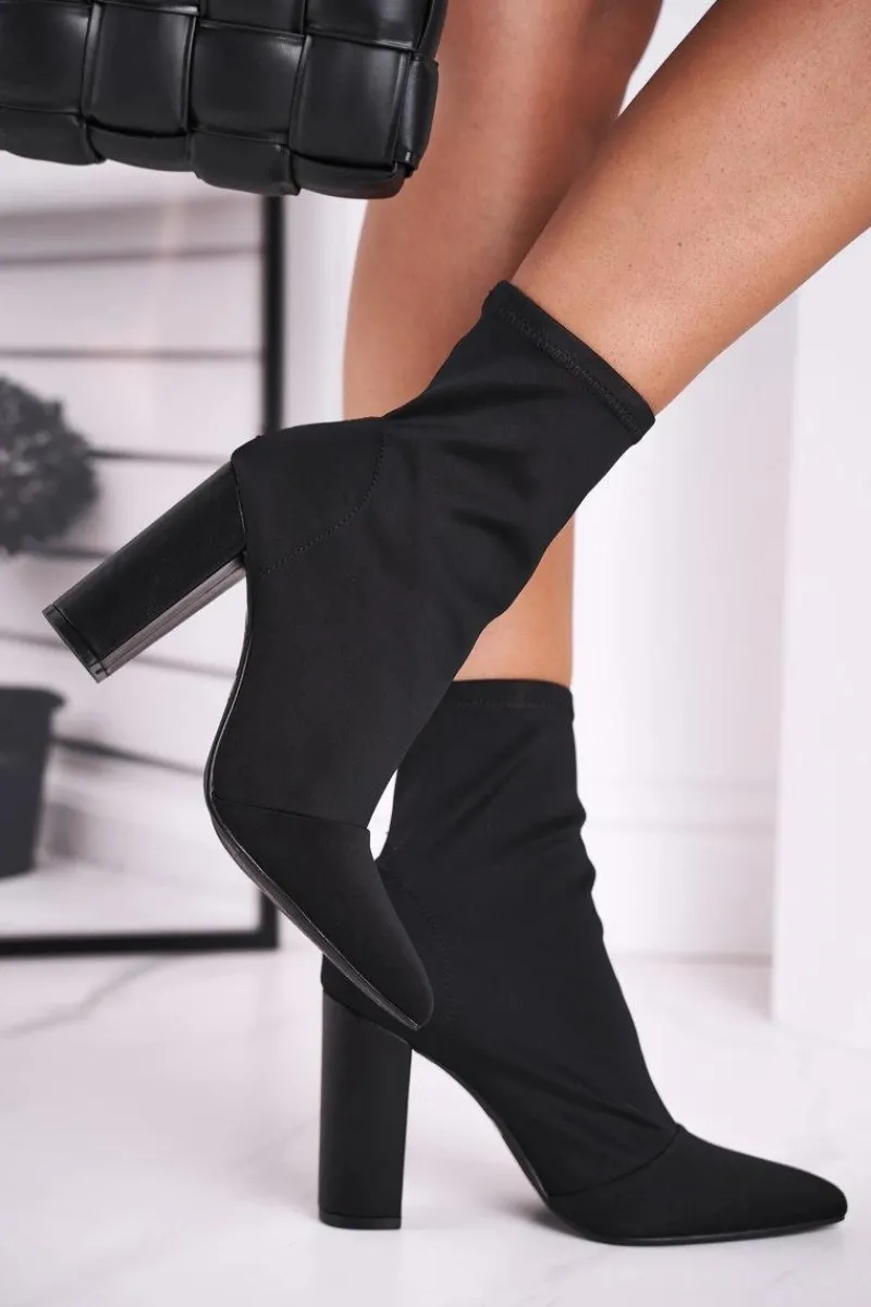 Czarne botki wykonane z materiału Lycra z noskiem w szpic. Elastyczna cholewka dopasowuje się do stopy, dzięki czemu są niezwykle wygodne. Osadzone na stabilnym słupku. Przy wyborze rozmiaru prosimy sugerować się tabelą rozmiarów.