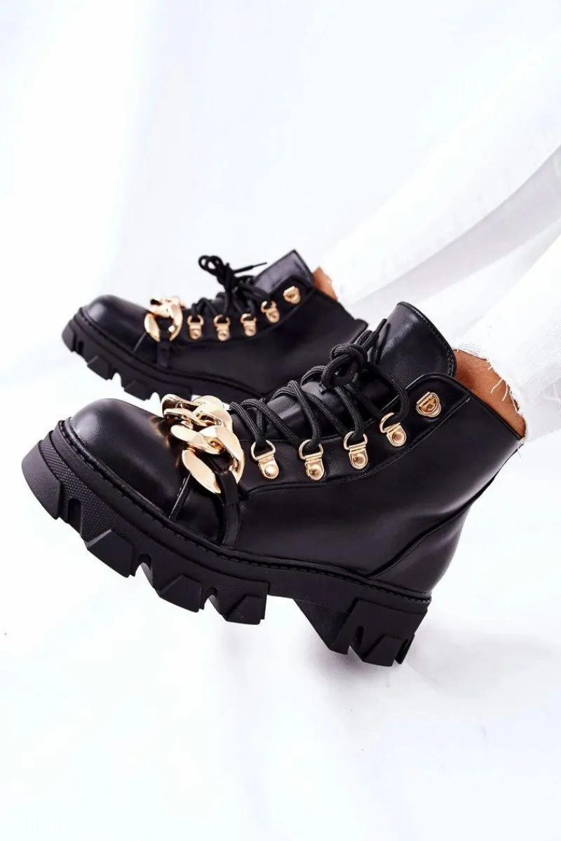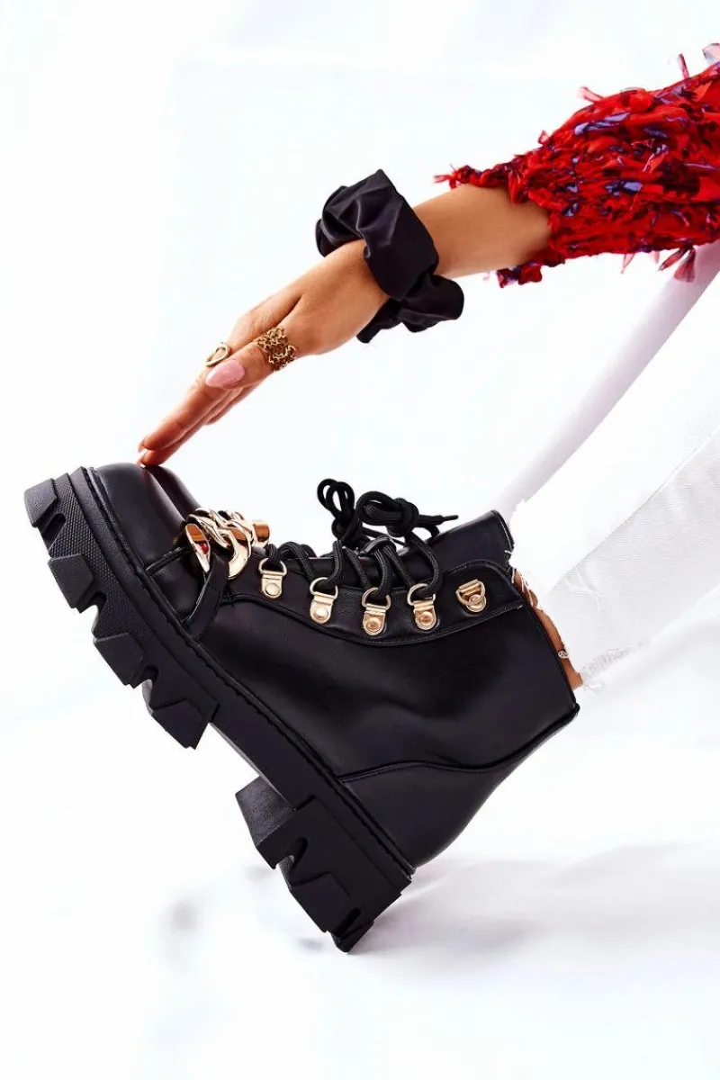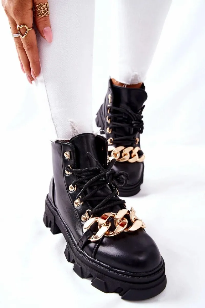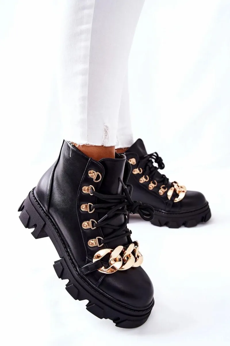 Buty, które są nieodłącznym elementem jesienno-zimowych stylizacji. Botki w całości zostały wykonane ze skóry ekologicznej. Gruba podeszwa oraz złote zdobienia w postaci łańcucha i złotych oczek, Wnętrze buta pokryte delikatnym ociepleniem w postaci koca obuwniczego. Przy wyborze rozmiaru prosimy sugerować się tabelą rozmiarów.