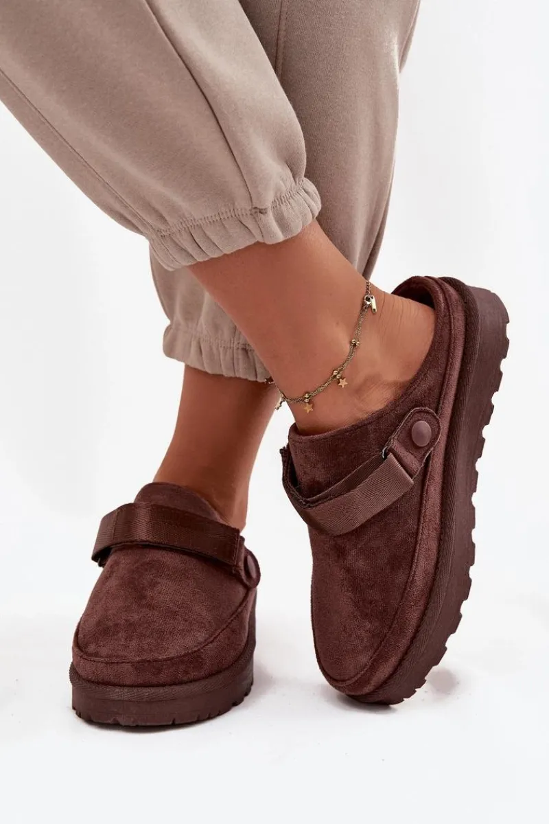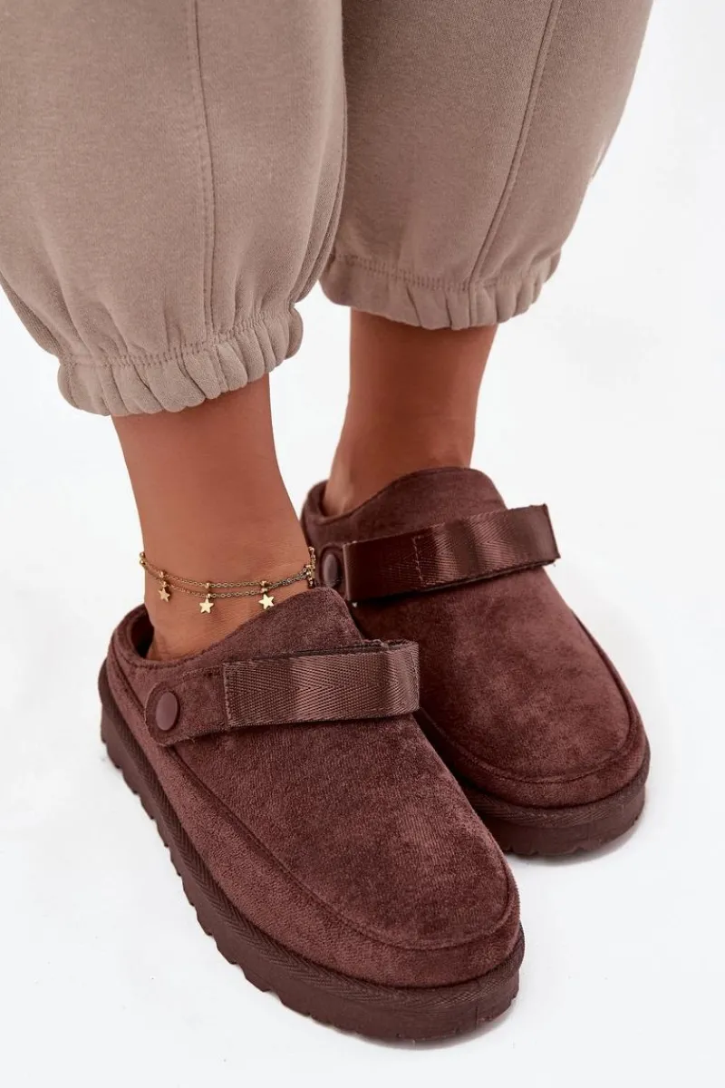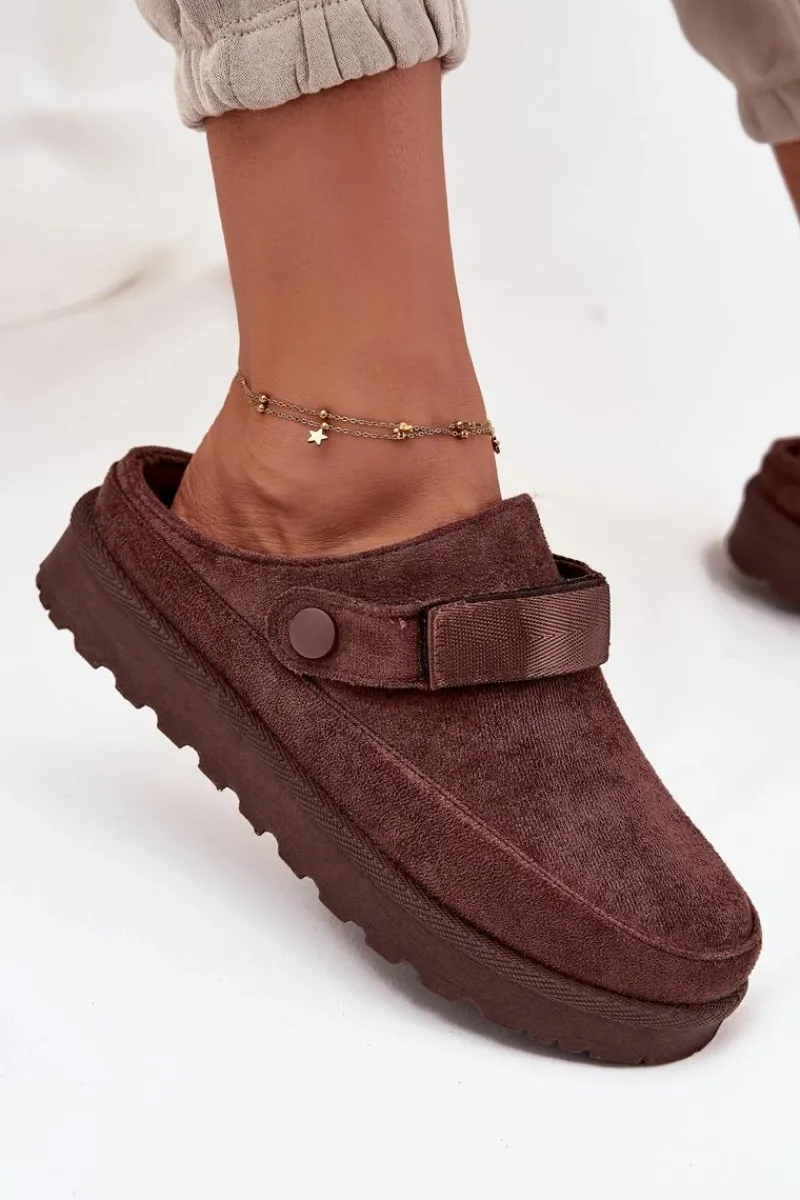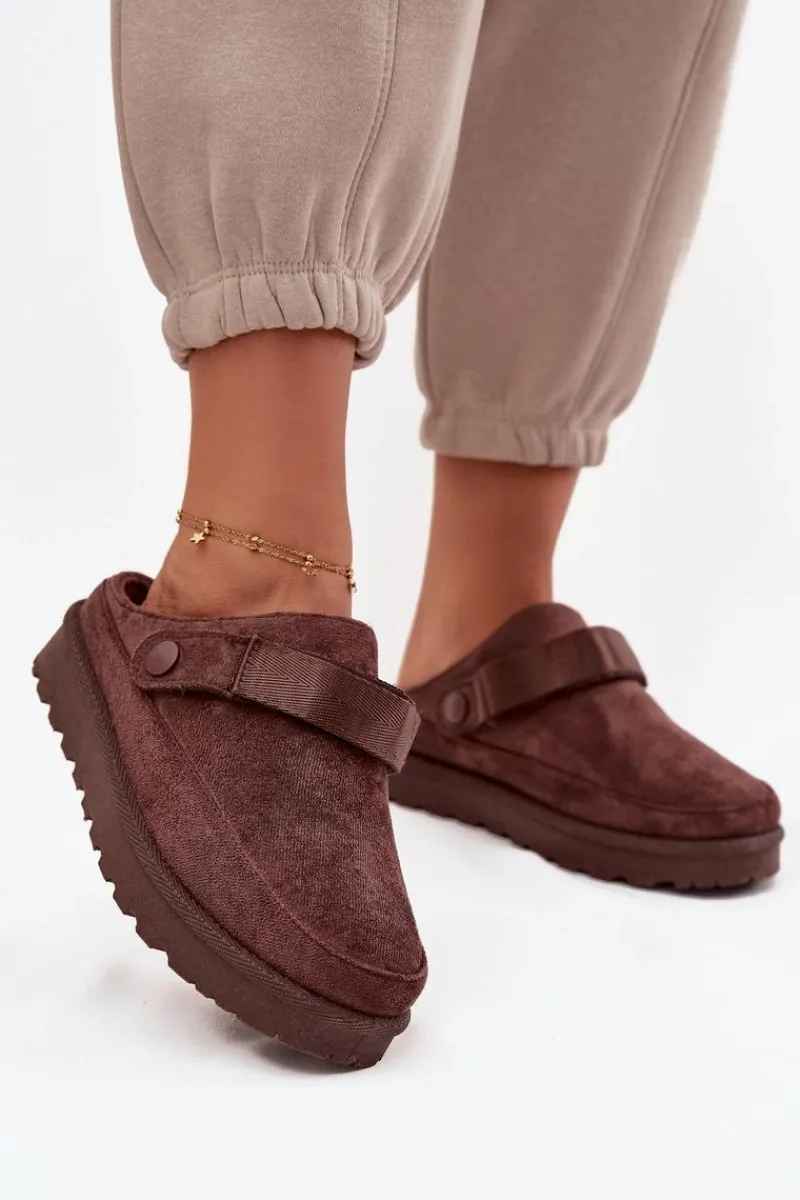 Damskie klapki wykonane z eko zamszu. Osadzone na platformie. Wnętrze ocieplone przyjemnym futerkiem, co zapewnia komfort w chłodniejsze dni. Dodatkowo posiadają ruchomy pasek zapinany na rzep, który stabilizuje piętę i umożliwia idealne dopasowanie. Idealne na co dzień, łączą styl z funkcjonalnością. Przy wyborze rozmiaru prosimy sugerować się tabelą rozmiarów.