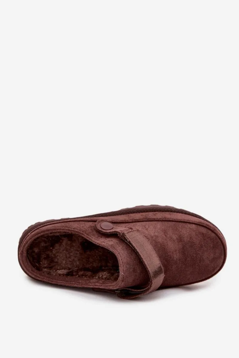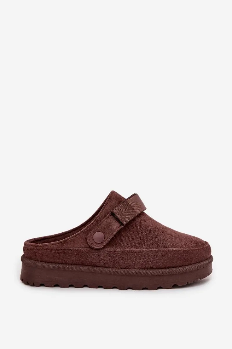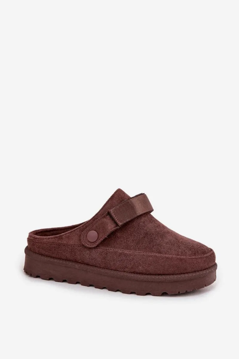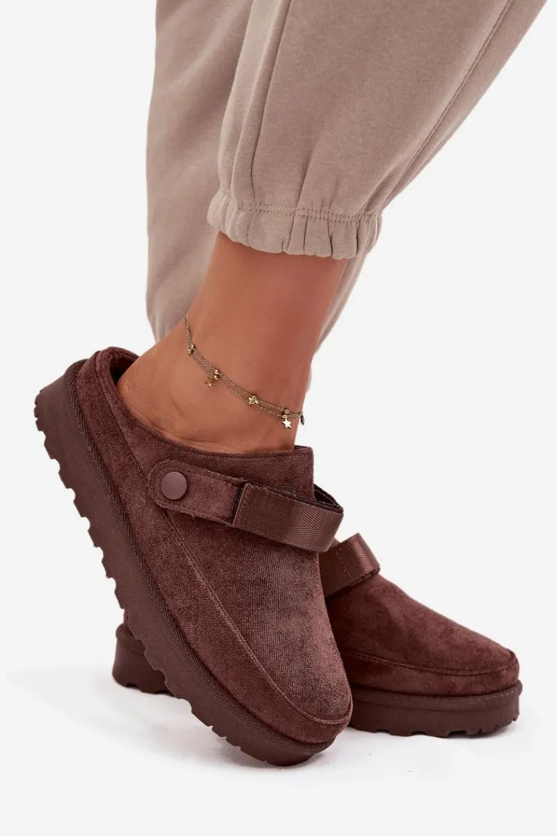 Damskie klapki wykonane z eko zamszu. Osadzone na platformie. Wnętrze ocieplone przyjemnym futerkiem, co zapewnia komfort w chłodniejsze dni. Dodatkowo posiadają ruchomy pasek zapinany na rzep, który stabilizuje piętę i umożliwia idealne dopasowanie. Idealne na co dzień, łączą styl z funkcjonalnością. Przy wyborze rozmiaru prosimy sugerować się tabelą rozmiarów.