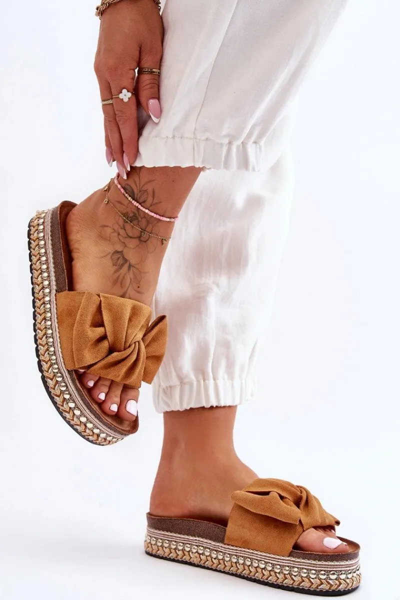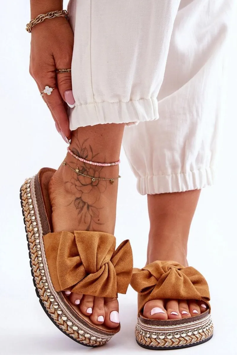 Klasyczne, damskie klapki zostały osadzone na masywnej platformie ze zdobieniami w postaci sznureczków oraz ćwieków. Wykonane z eko zamszu. Na przodzie znajduje się ozdoba w postaci kokardy. Profilowana wkładka jest wykonana z przyjemnego w dotyku eko zamszu. Te klapki to idealny model na lato! Przy wyborze rozmiaru prosimy sugerować się tabelą rozmiarów.