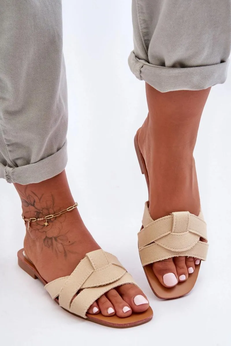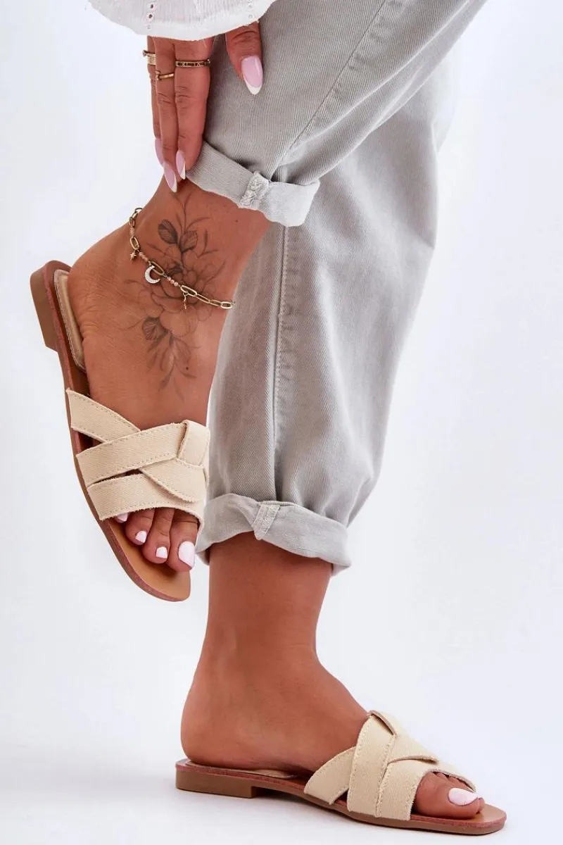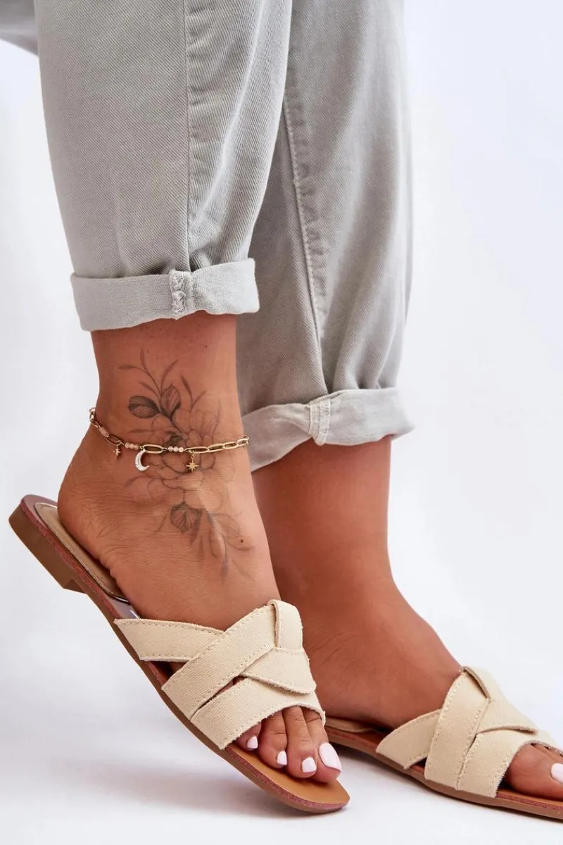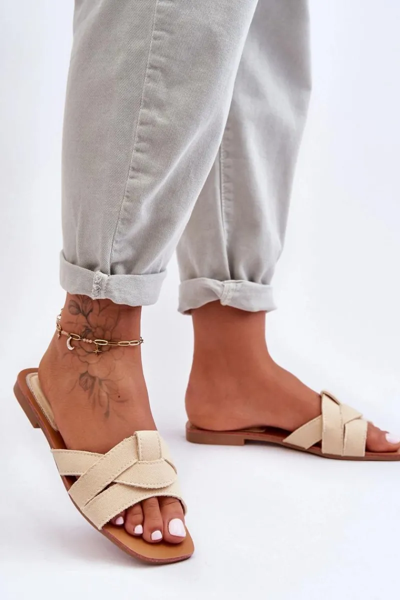 Damskie klapki na płaskim obcasie z gumową, antypoślizgową podeszwą świetnie sprawdzą się podczas codziennego użytkowania. Cholewka została wykonana z materiału tekstylnego, natomiast wkładka z połączenia tworzywa sztucznego i materiału. Ten klasyczny model charakteryzuje się przeplatanymi paskami. Prezentowany model zapewni wysoki komfort, nawet w najgorętsze dni! Przy wyborze rozmiaru prosimy sugerować się tabelą rozmiarów.
