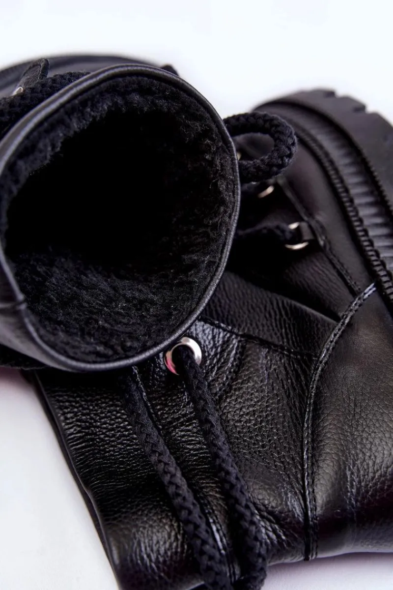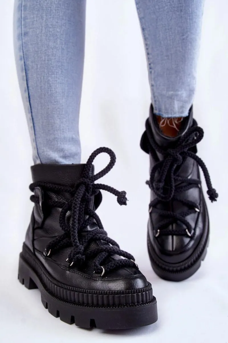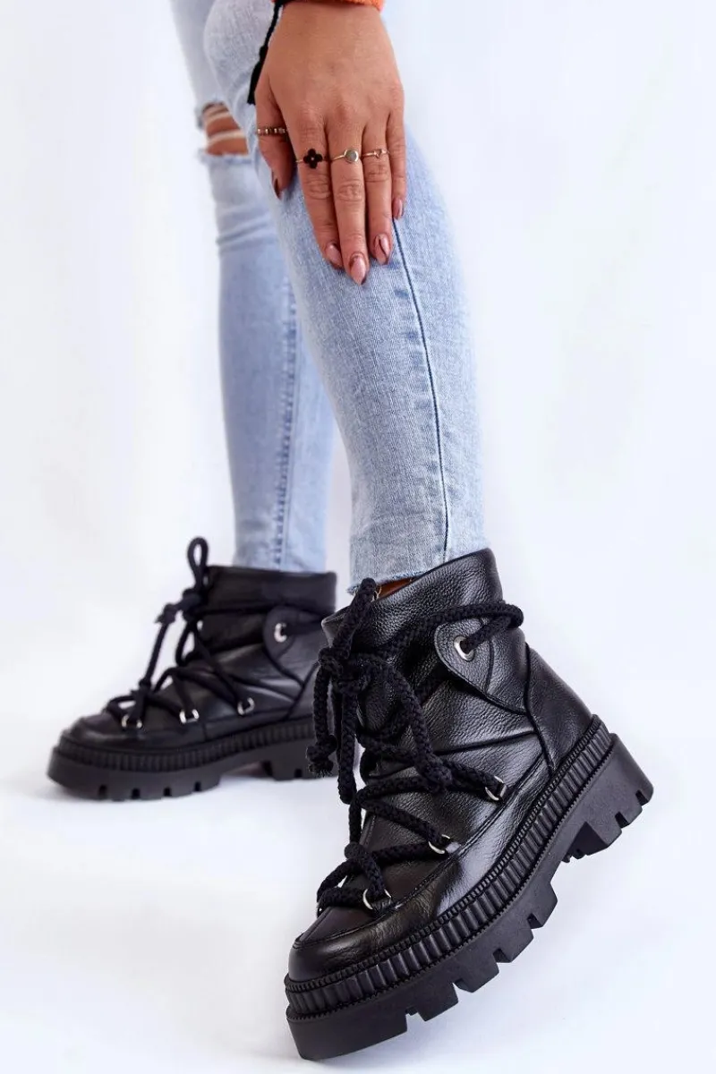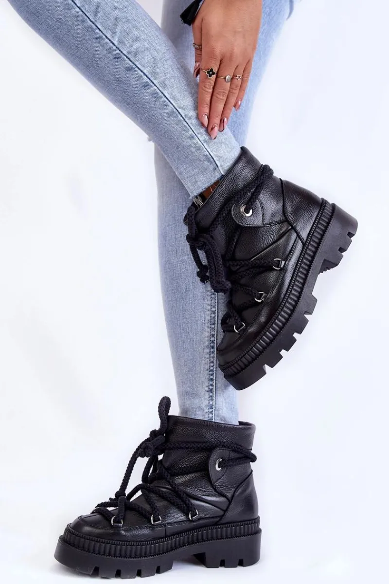 Świetne, damskie śniegowce zostały wykonane z wysokiej jakości skór. Model posiada grube, solidne sznurowanie. Botki zostały osadzone na płaskim obcasie oraz platformie ze żłobieniami. Śniegowce posiadają ocieplenie w postaci futerka oraz usztywniany zapiętek. Ten model z pewnością przyda się każdej miłośniczce ciepłego i wygodnego obuwia! Przy wyborze rozmiaru prosimy sugerować się tabelą rozmiarów.