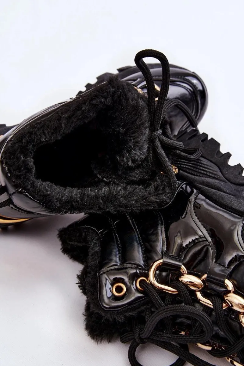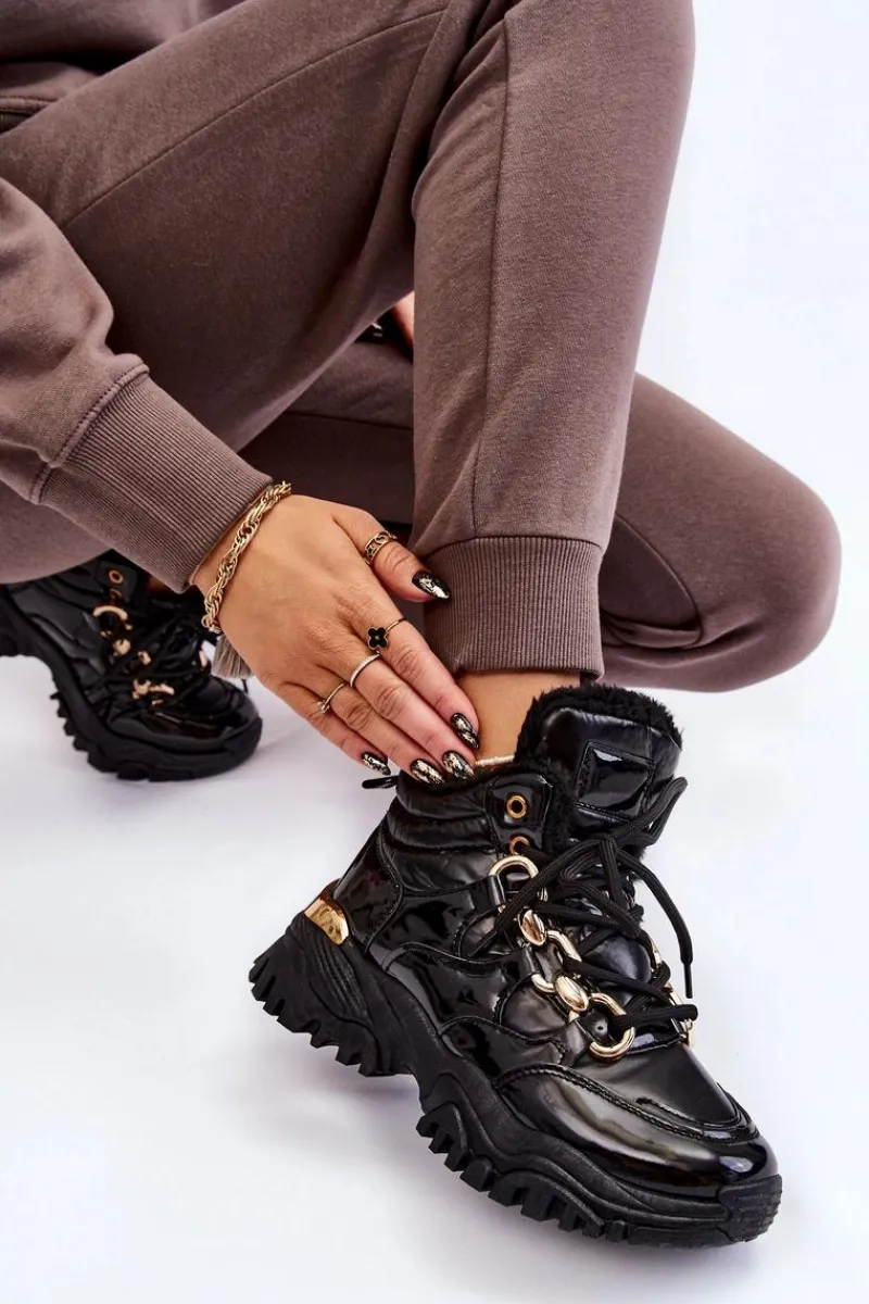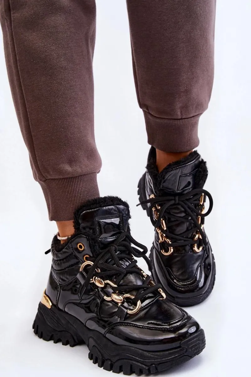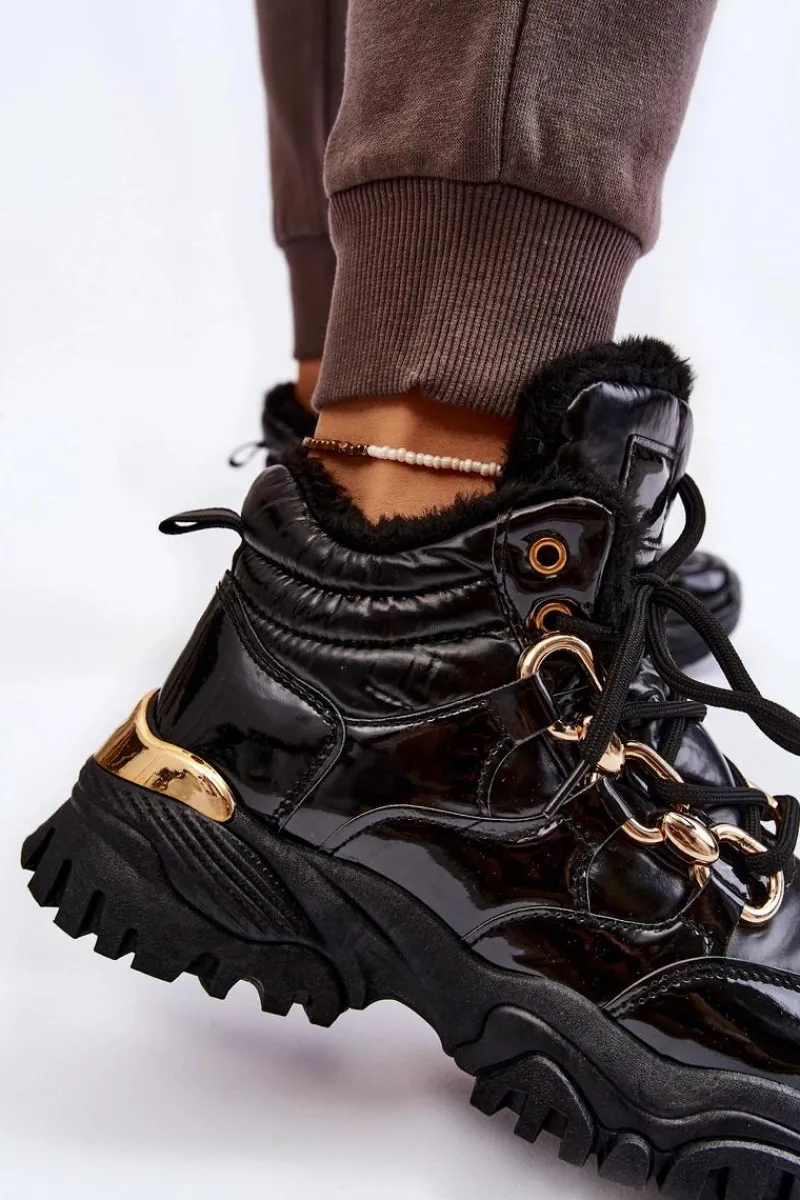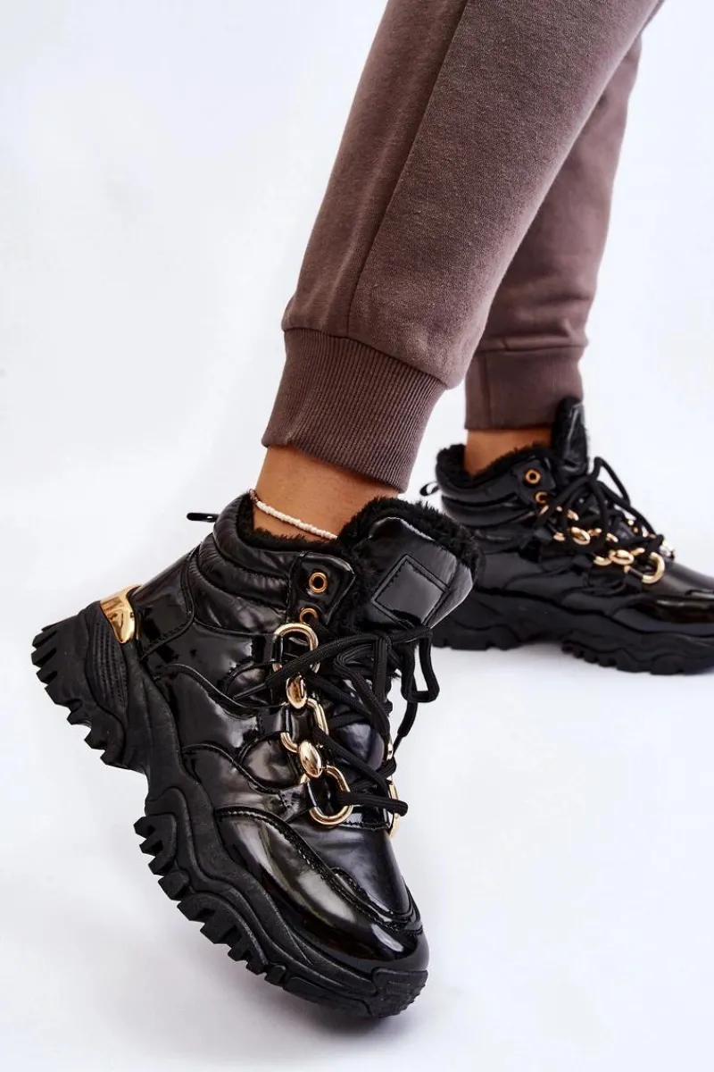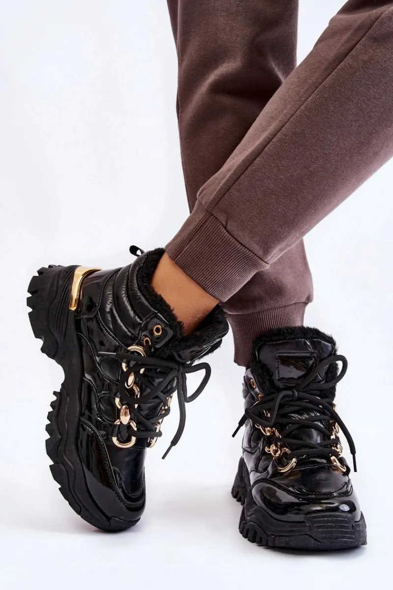Trapery damskie to idealny wybór na jesienno-zimowe dni. Posiadają ocieplenie w postaci grubego futerka. Model ten został wykonany z połączenia eko skóry oraz tworzywa sztucznego. Ten modny fason ocieplanych butów sportowych został osadzony na płaskim obcasie i masywnej platformie ze żłobieniami. Wyższa cholewka za kostkę sprawi, że będzie Ci w nich niezwykle ciepło. Przy wyborze rozmiaru prosimy sugerować się tabelą rozmiarów.