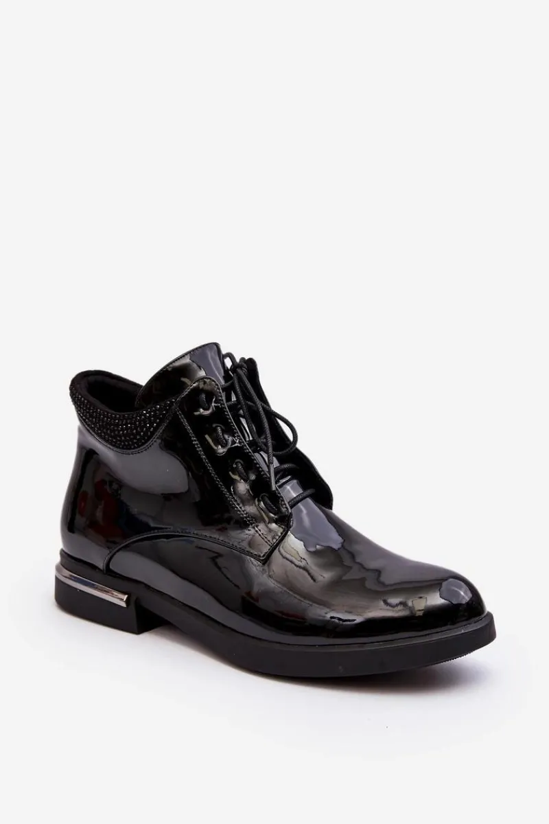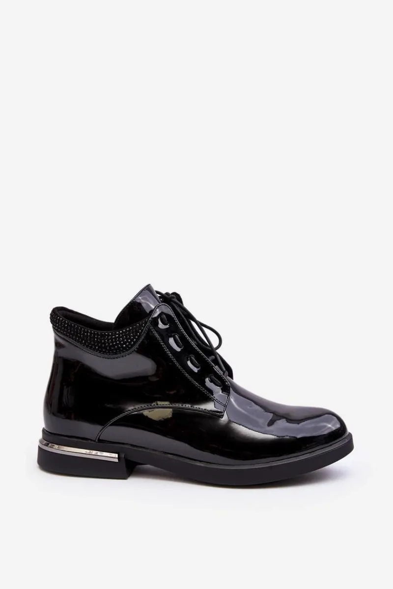 Półbuty damskie zostały wykonane z eko skóry. Osadzone są na płaskim obcasie z lustrzanym elementem, który dodaje im subtelnego blasku. Nosek butów jest zaokrąglony. Ten elegancki model świetnie sprawdzi się w wielu stylizacjach! Koniecznie powinnaś mieć go w swojej szafie! Podczas wyboru rozmiaru prosimy sugerować się tabelą rozmiarów.