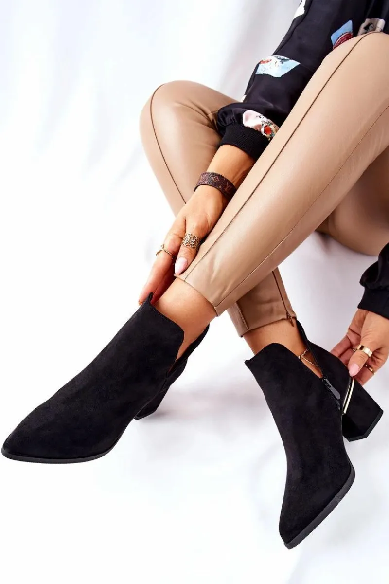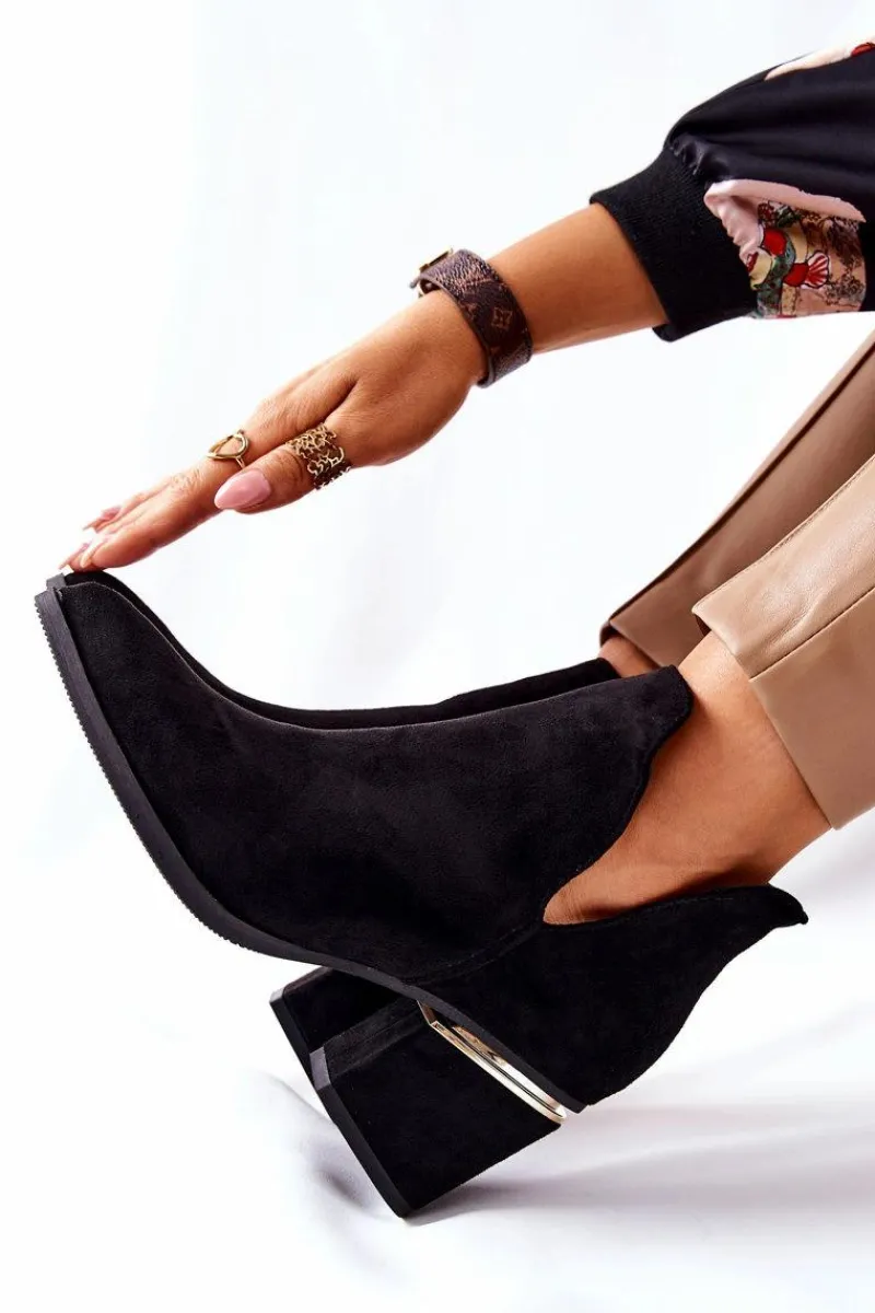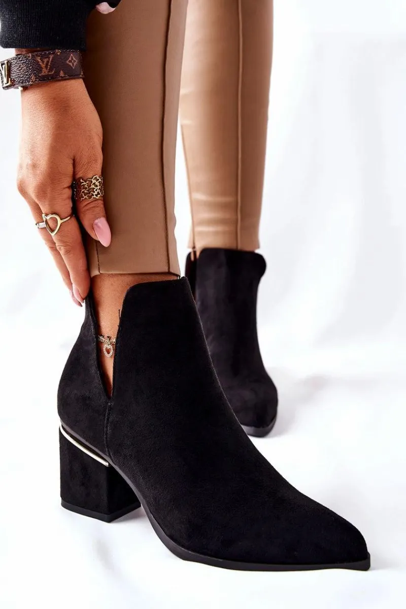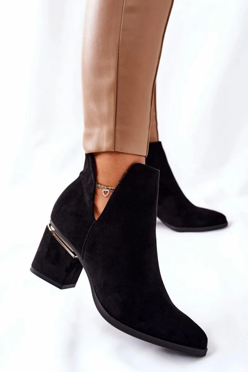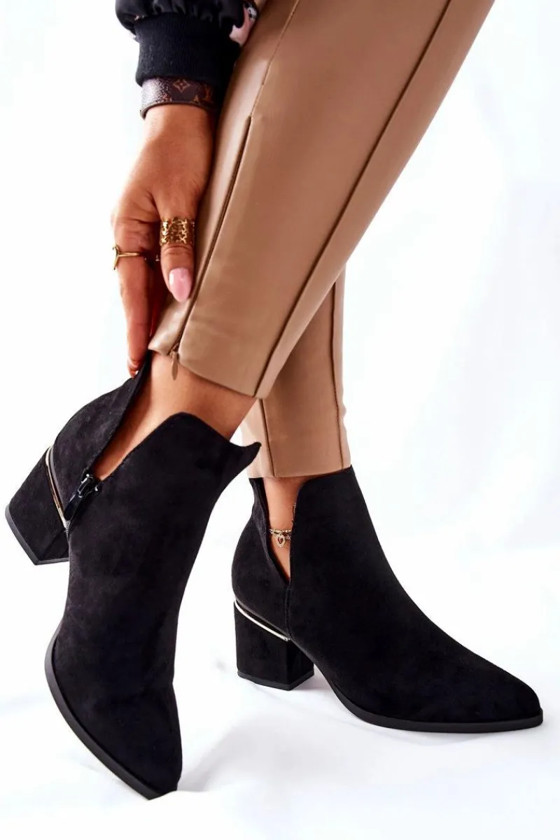 Klasyczne botki, dostępne w kilku kolorach. Cholewka z wycięciami na boku, wykonana z ekologicznego zamszu. Dzięki złotemu zdobieniu na słupku świetnie się prezentują w każdej stylizacji. Na boku znajduje się delikatny suwak, ułatwiający zakładanie. Przy wyborze rozmiaru prosimy sugerować się tabelą rozmiarów.