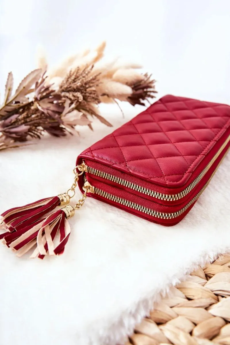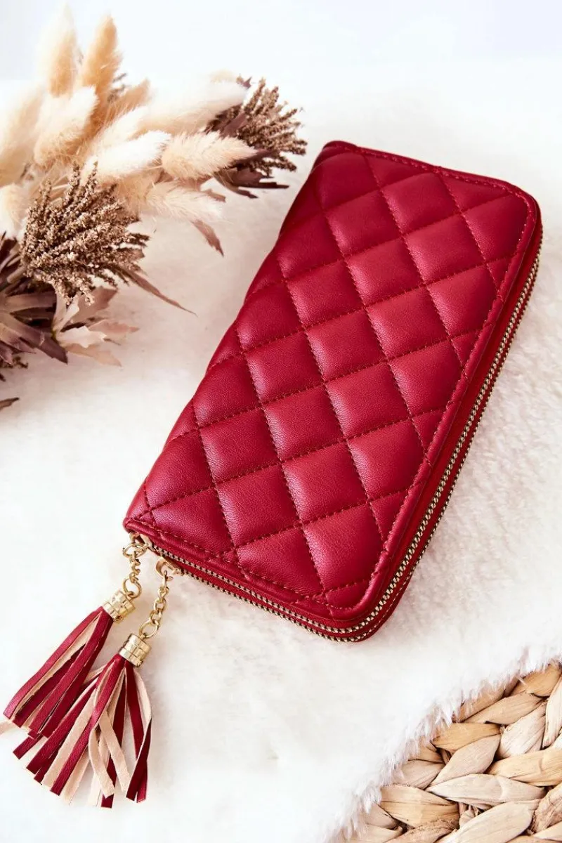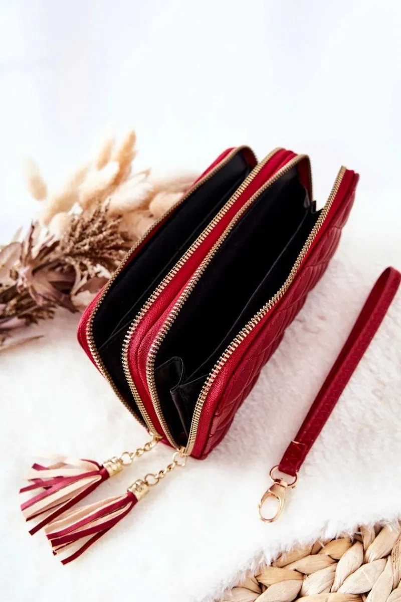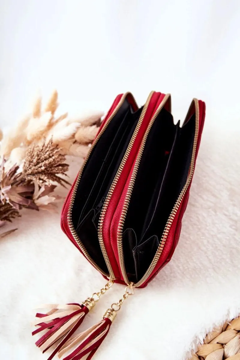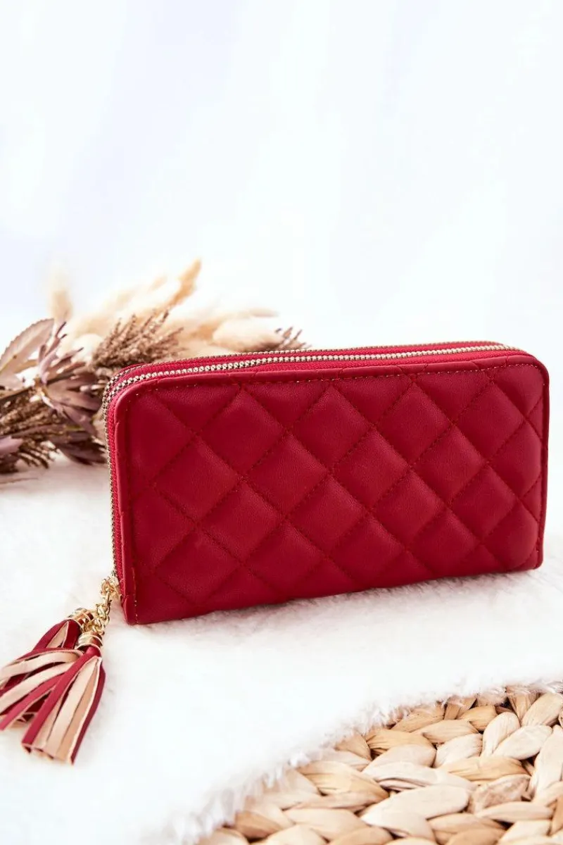 Duży i praktyczny portfel zapinany z zewnątrz na dwa zamki błyskawiczne. W jednej z przegródek można znaleźć miejsce na bilony, banknoty oraz wizytówki, natomiast w drugiej można umieścić niewielkiego smartfona lub banknoty czy dokumenty. Z zewnątrz portfel został wykonany z pikowanej eko skóry, a przy zamkach znajdują się frędzelki. Dodatkowo w zestawie jest dołączony paseczek.