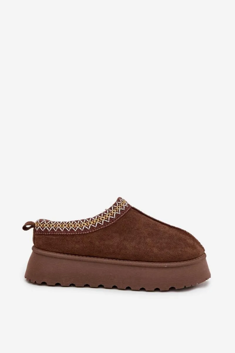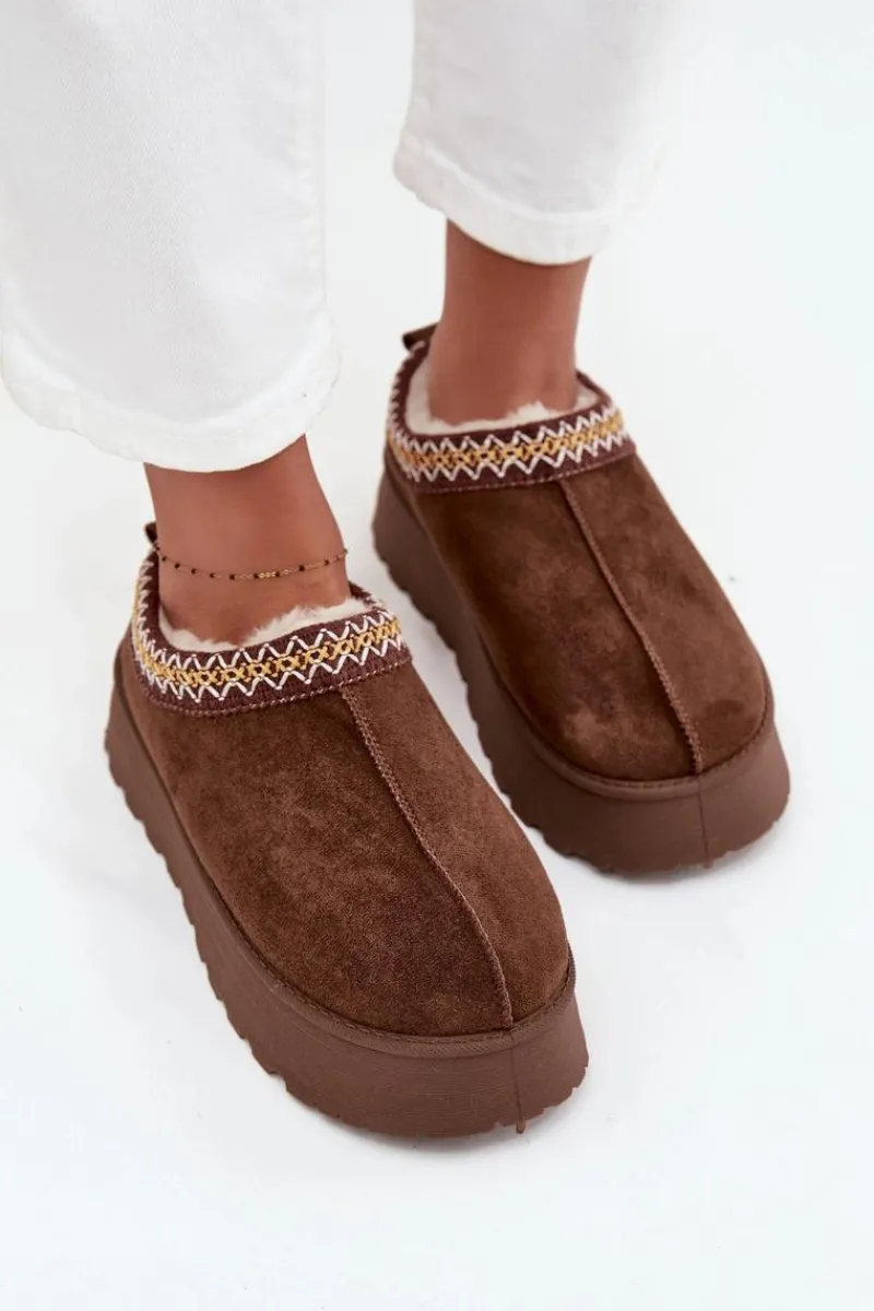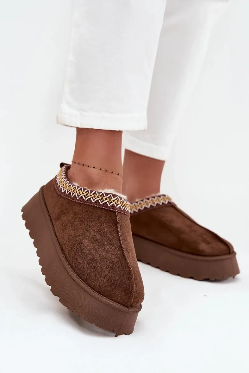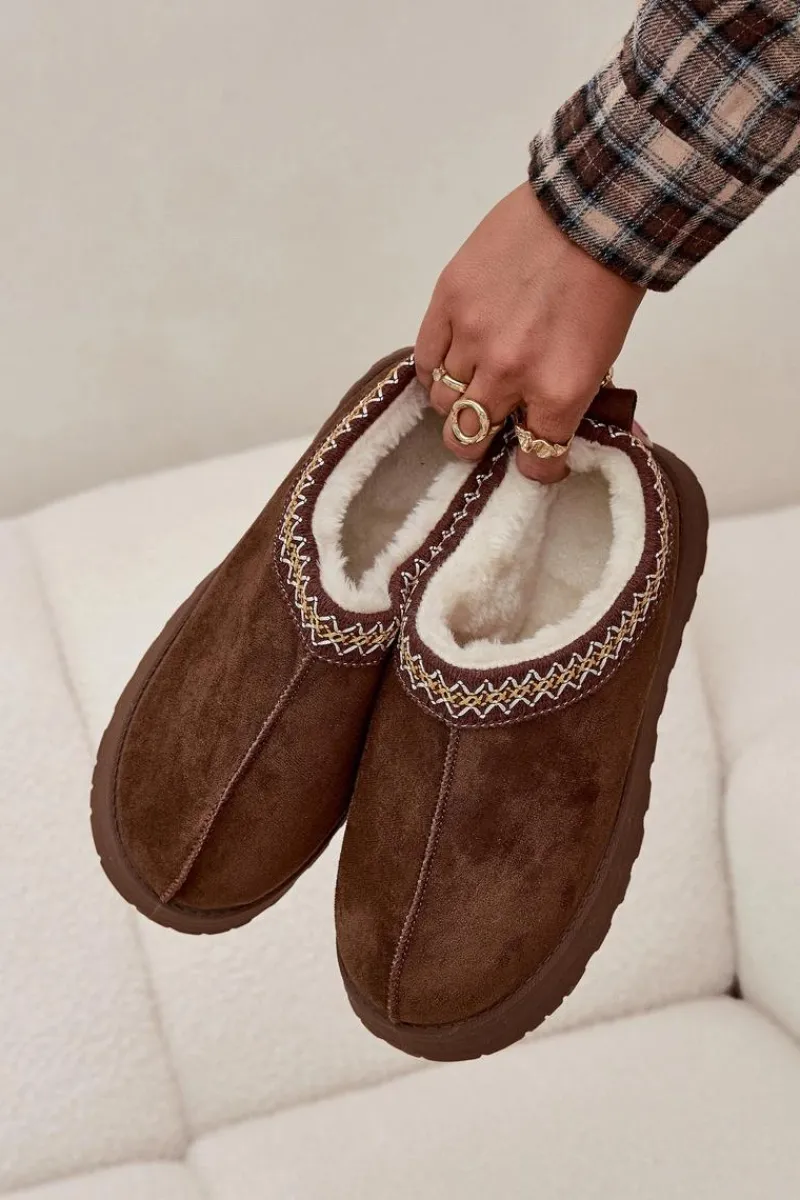 Stylowe kapcie wykonane z eko zamszu to doskonały wybór na chłodniejsze dni. Osadzone na platformie, z zakrytymi noskami i ocieplane miękkim futerkiem, zapewniają komfort i ciepło. Górę cholewki zdobi subtelny haft, który nadaje im eleganckiego charakteru. Idealne do codziennego użytku w domu oraz szybkie wyjścia na zewnątrz. Przy wyborze rozmiaru prosimy kierować tabelą rozmiarów.