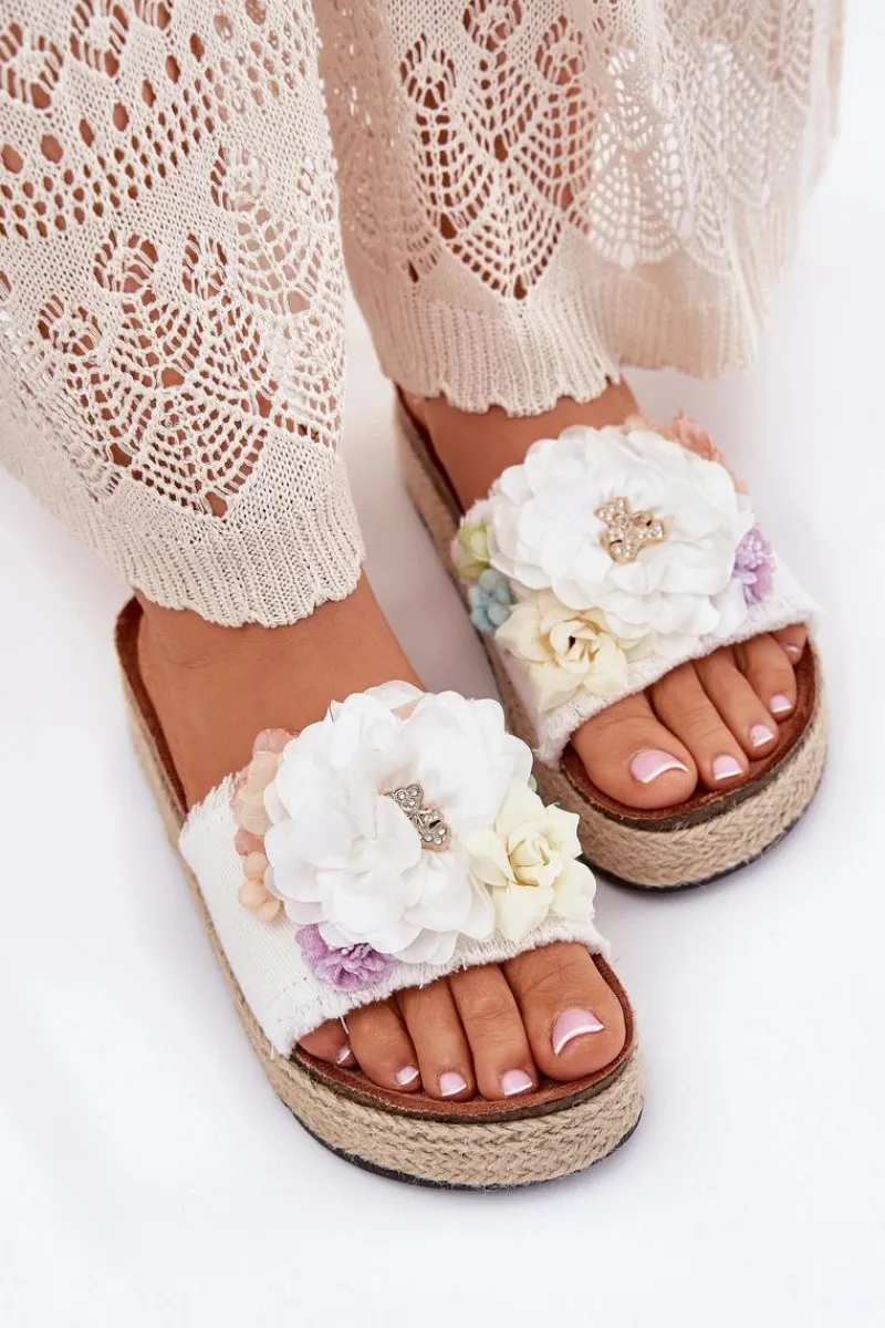 Damskie klapki z urokliwymi ozdobami w postaci materiałowych kwiatów i przypinką w kształcie misia to wyjątkowa propozycja, która doda charakteru każdej stylizacji. Osadzone na masywnej platformie ozdobionej jutową plecionką, łączą wygodę z modnym wyglądem. Profilowana, eko zamszowa wkładka zapewnia komfort przez cały dzień. Ten model z pewnością przyciągnie uwagę i wyróżni Cię z tłumu! Idealne na letnie dni, łączą styl z funkcjonalnością. Przy wyborze rozmiaru prosimy sugerować się tabelą rozmiarów.
