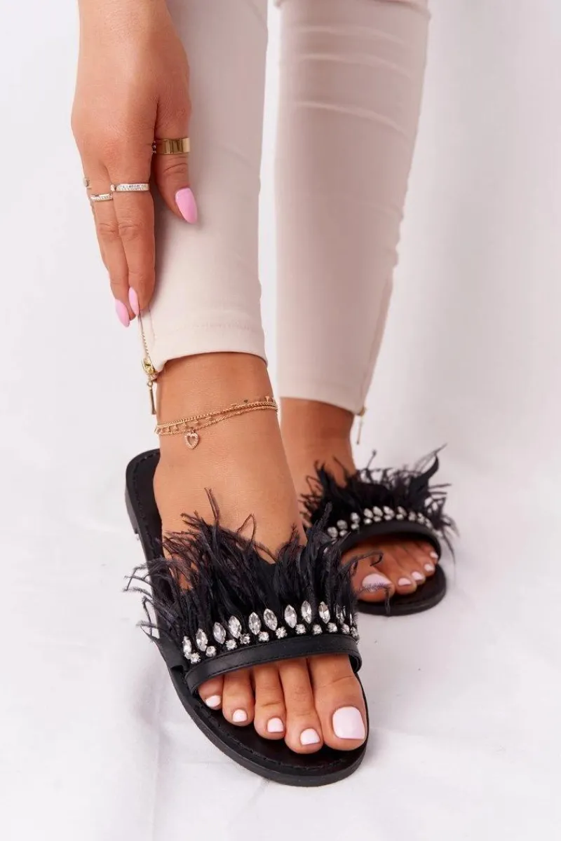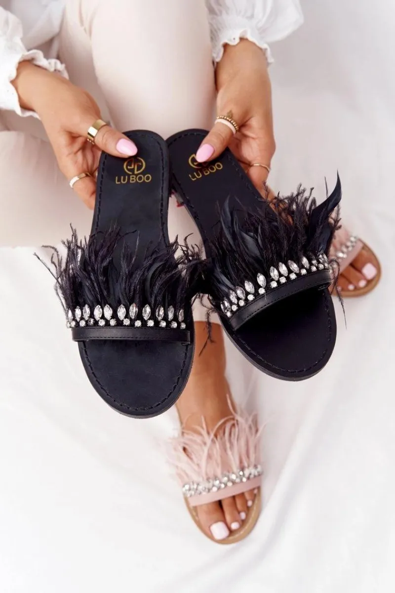 Klapki damskie marki LU BOO ozdobione piórami oraz srebrnymi kamieniami. Klapki to świetna propozycja dla kobiet ceniących sobie komfort w letnie dni! Koniecznie sprawdź całą naszą kolekcję butów marki LU BOO. Przy wyborze rozmiaru prosimy sugerować się tabelą rozmiarów.