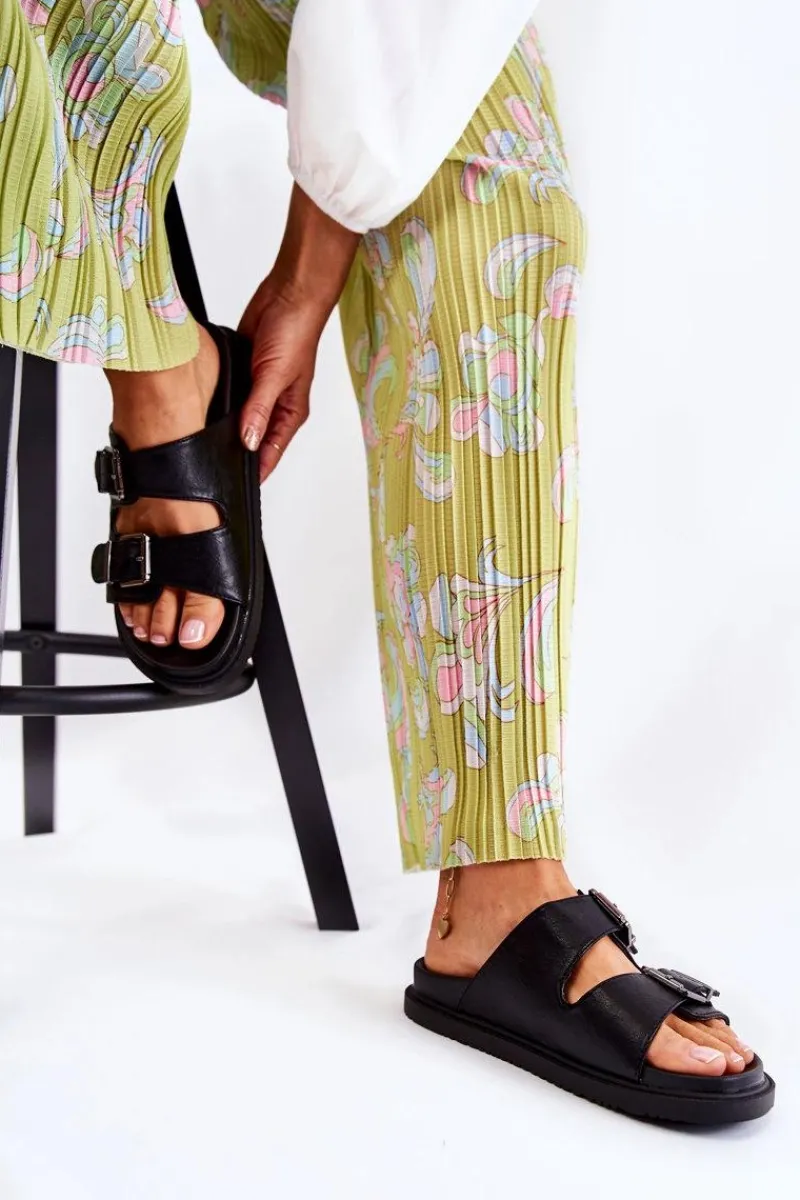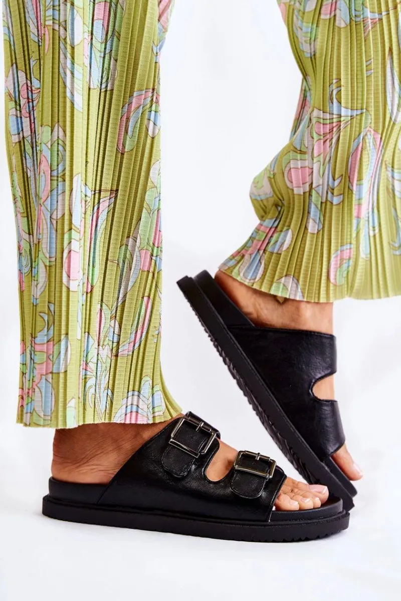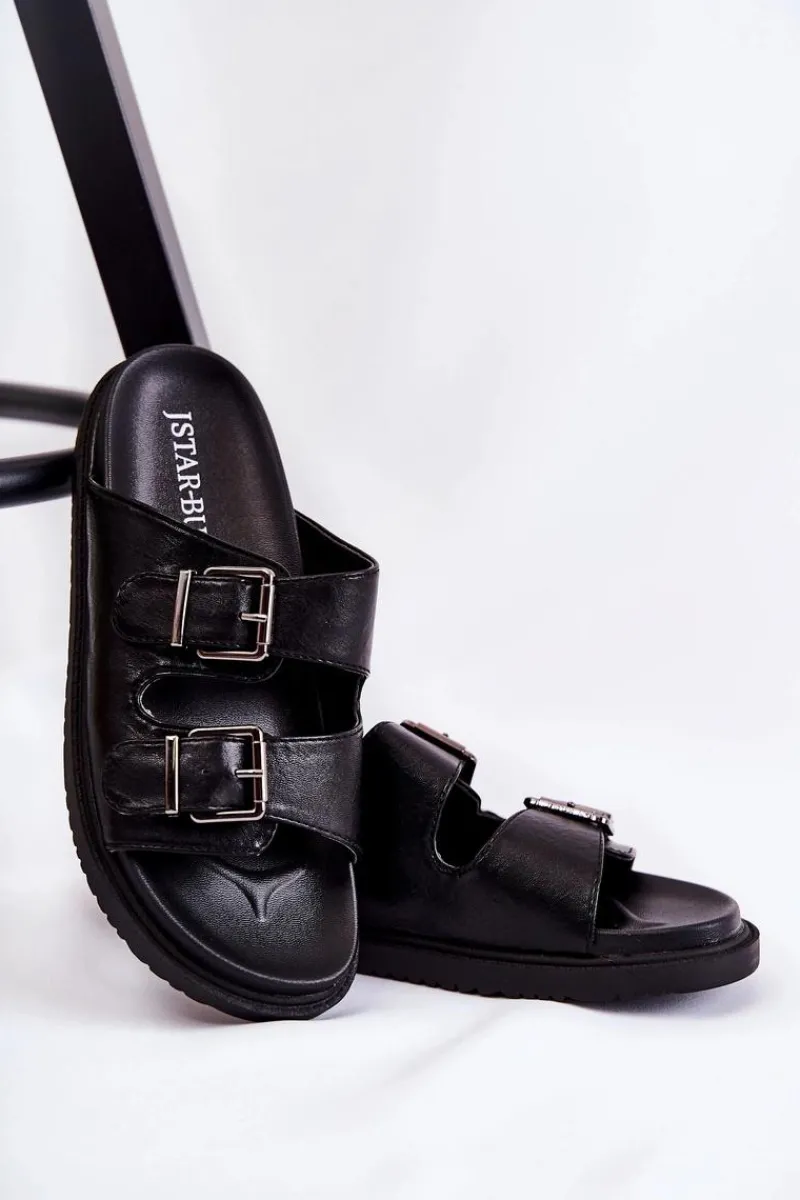 Klasyczne klapki wsuwane wykonane z eko skóry. Osadzone na płaskiej, grubszej podeszwie. Posiadają z przodu dwa regulowane paski ze sprzączką. Wygodna, profilowana wkładka z gumowego tworzywa. Idealne na co dzień! Model z odkrytym, zaokrąglonym noskiem. Świetne obuwie na lato! Przy wyborze rozmiaru prosimy sugerować się tabelą rozmiarów.