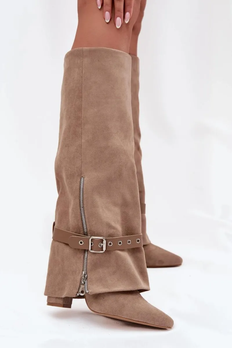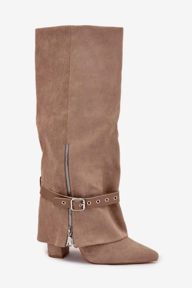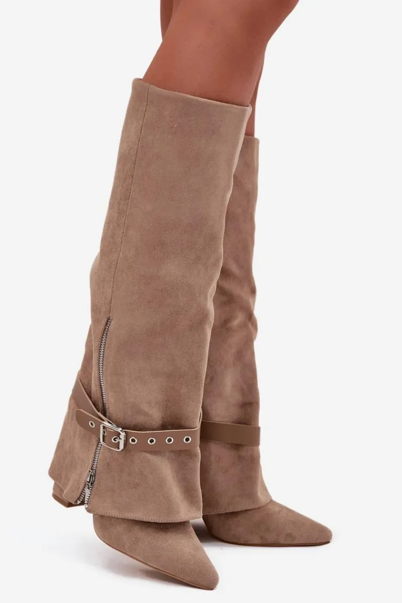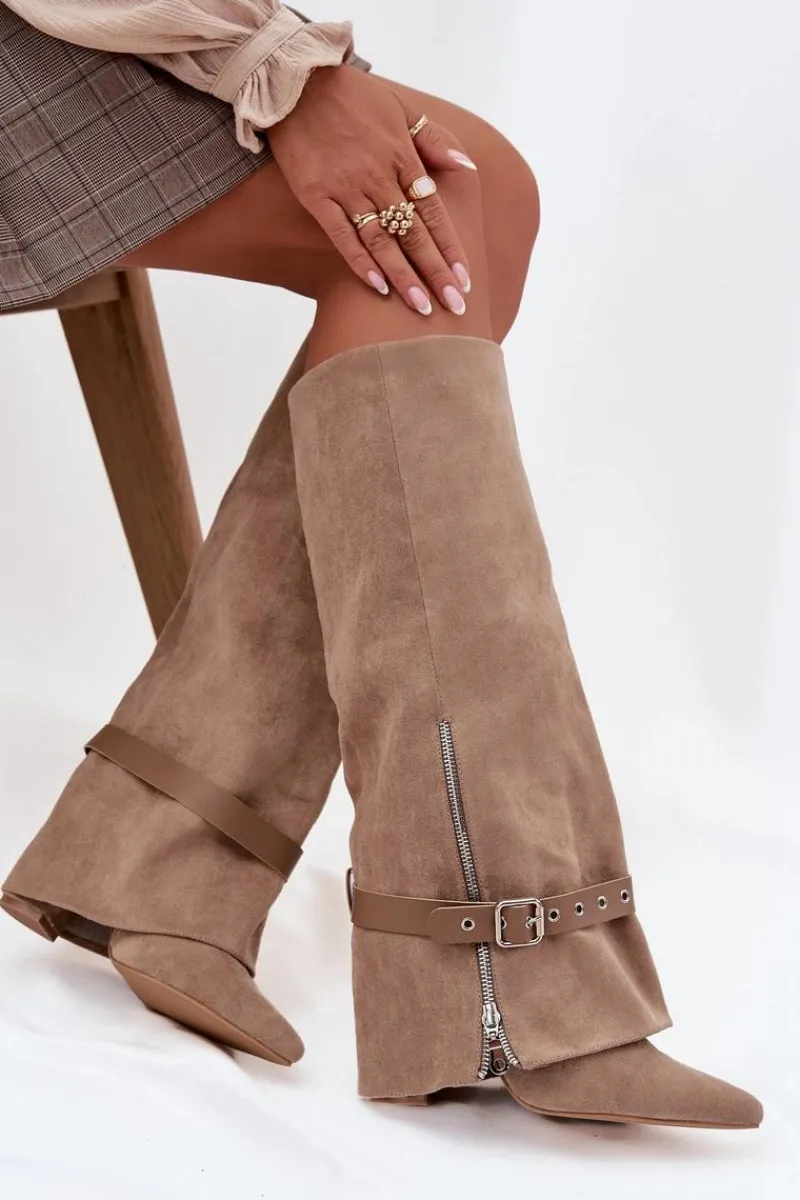 Wsuwane kozaki damskie przed kolano to elegancka i stylowa propozycja, która łączy klasykę z nowoczesnym akcentem. Model ze szpiczastymi noskami i obcasem typu słupek subtelnie wysmukla sylwetkę, a cholewka nachodząca na obcas nadaje całości wyjątkowego charakteru. Dodatkowy pasek z ozdobną klamrą można ściągnąć lub dowolnie ustawić, zmieniając styl butów i dopasowując je do różnych stylizacji. Idealne do sukienek, spódnic, jak i eleganckich zestawów casualowych, wprowadzają modny, kobiecy akcent do każdej garderoby. Przy wyborze rozmiaru prosimy sugerować się tabelą rozmiarów.