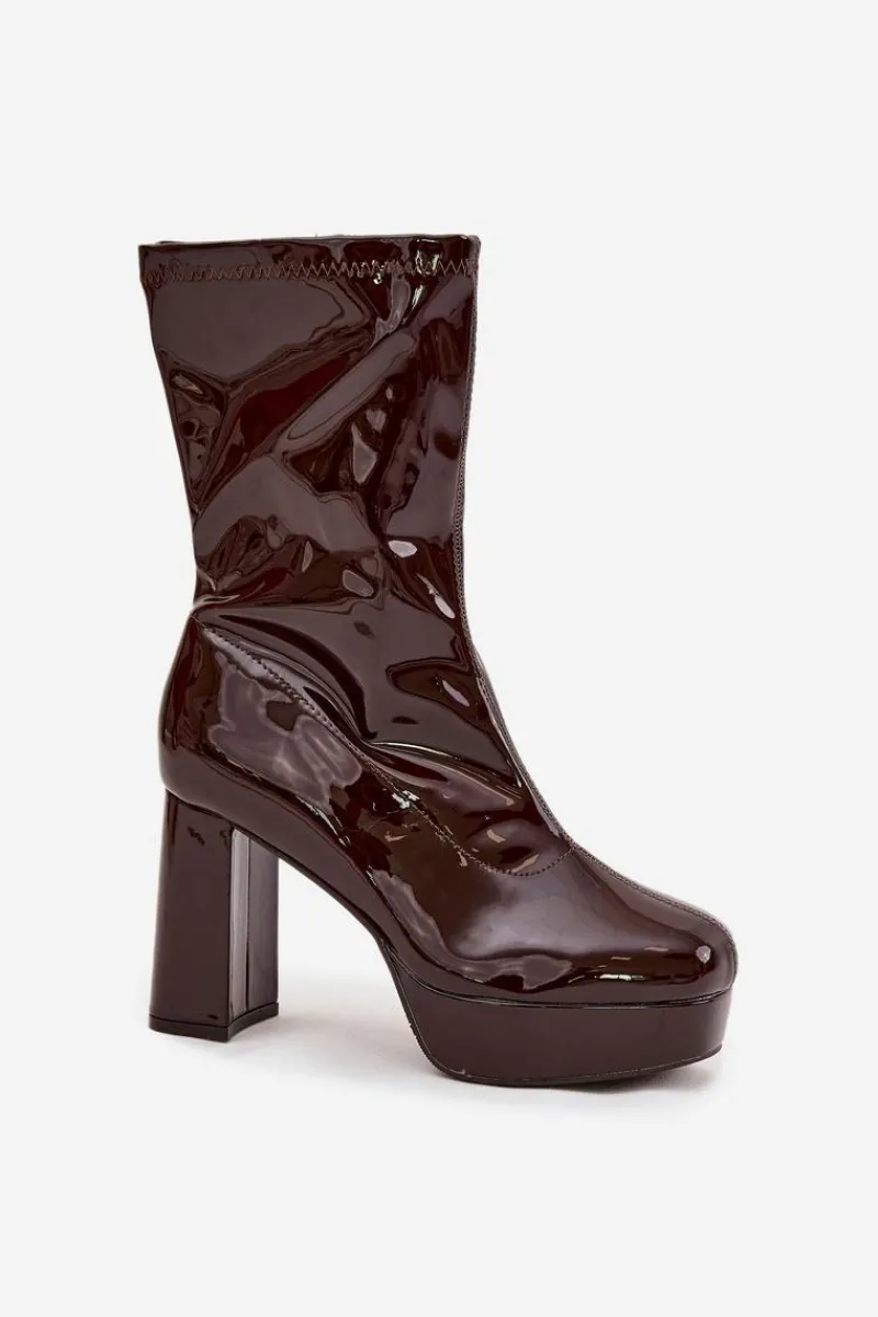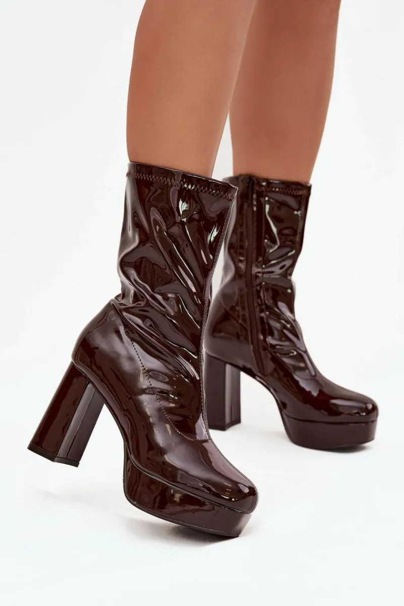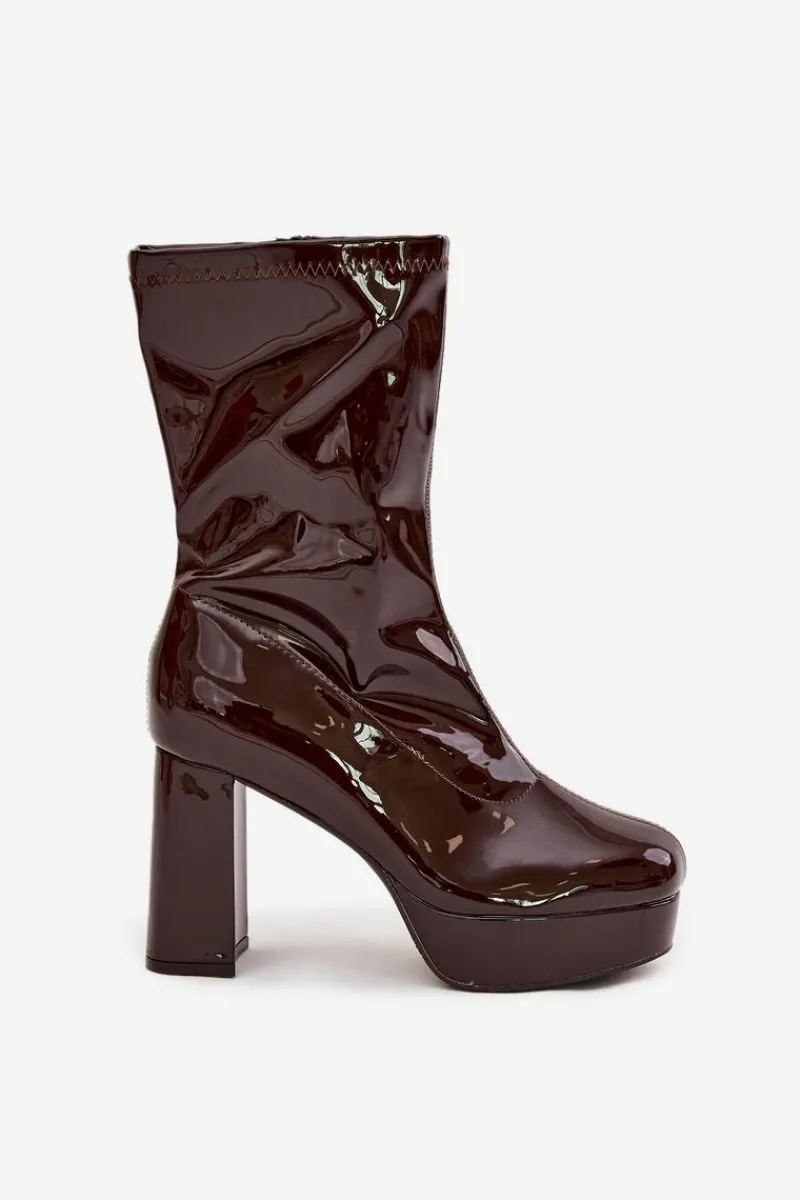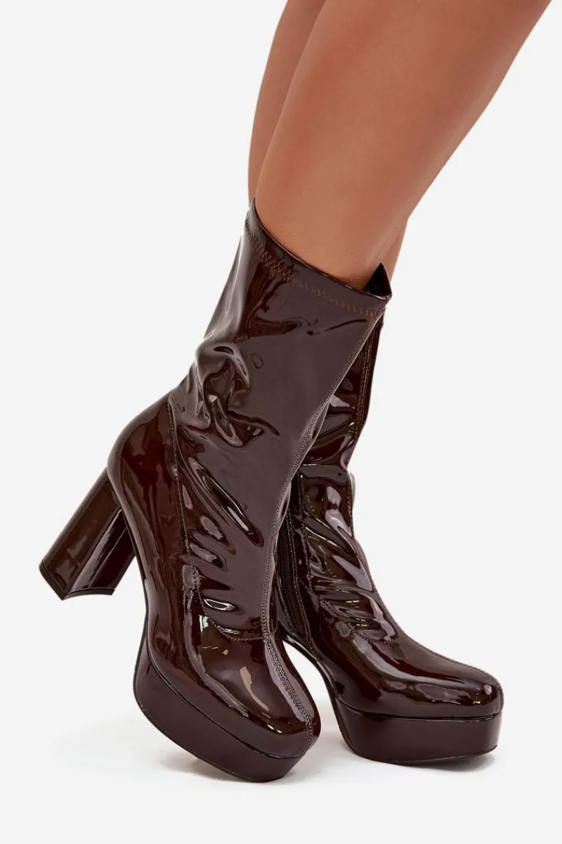 Botki damskie wykonane z eko skóry. Wyróżniają się połyskującym wykończeniem oraz dekoracyjnymi przeszyciami na cholewce, które dodają im charakteru. Osadzone na stabilnym słupkowym obcasie i praktycznej platformie, optycznie wysmuklają sylwetkę, a jednocześnie zapewniają komfort noszenia. Buty zapinane są na zamek, co ułatwia zakładanie i zdejmowanie. Wnętrze zostało ocieplone na wysokości stopy, dzięki czemu sprawdzą się w chłodniejsze dni. To idealny model do stylizacji zarówno ze spodniami, jak i sukienką.