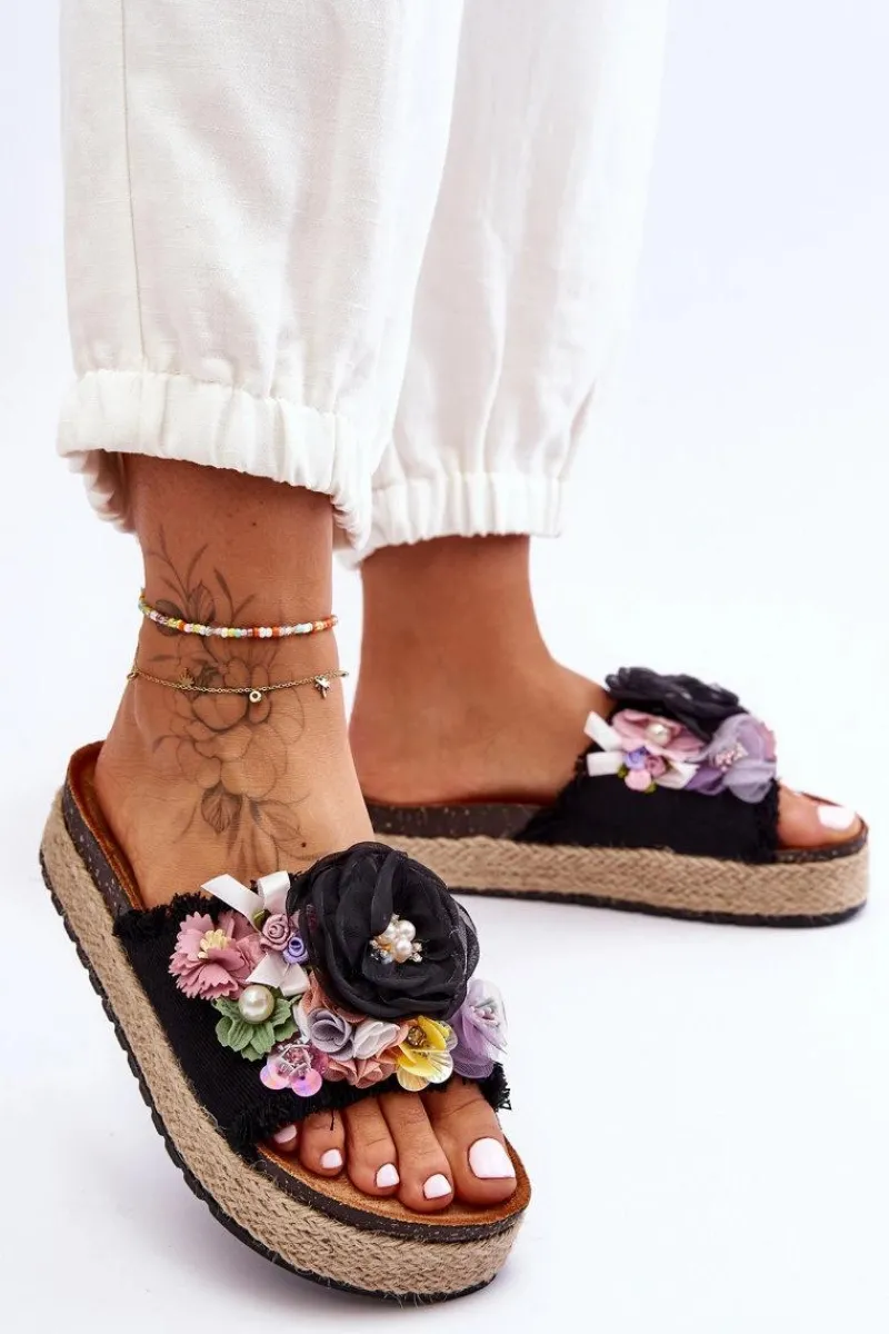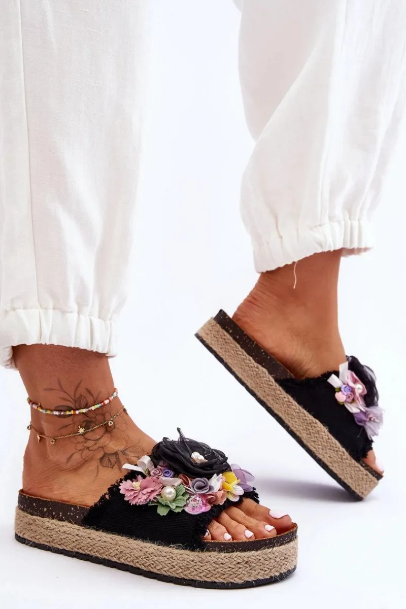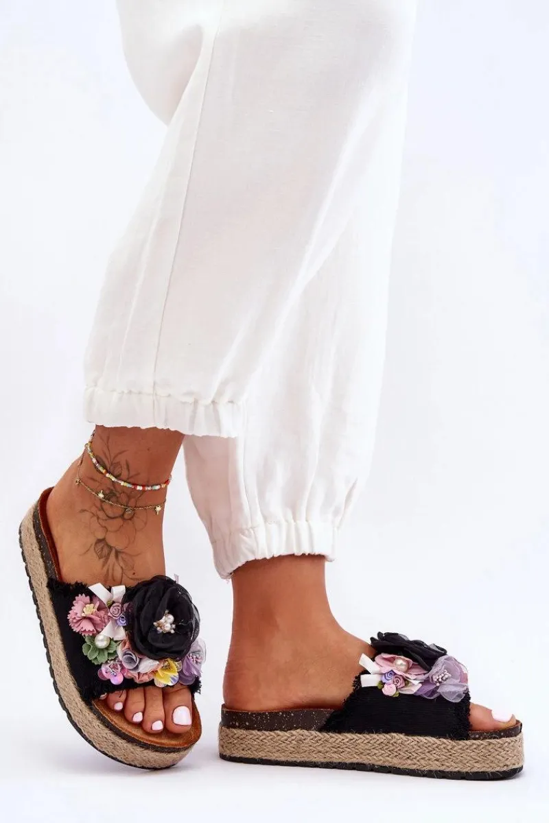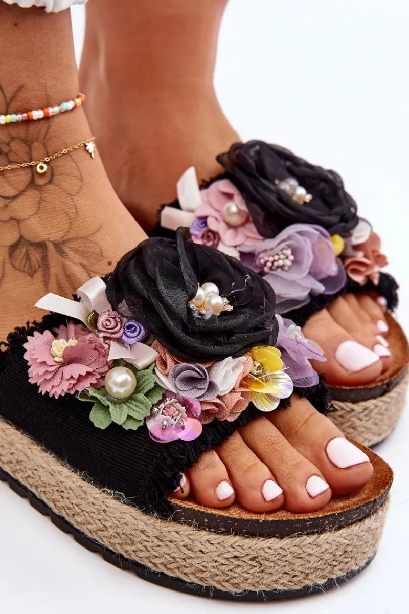 Niepowtarzalne, damskie klapki z cudnymi ozdobami w postaci materiałowych kwiatów i perełek. Osadzone na masywnej platformie ozdobionej jutową plecionką. Klapki posiadają profilowaną, eko zamszową wkładkę. Ten model z pewnością wyróżni Cię z tłumu! Przy wyborze rozmiaru prosimy sugerować się tabelą rozmiarów.