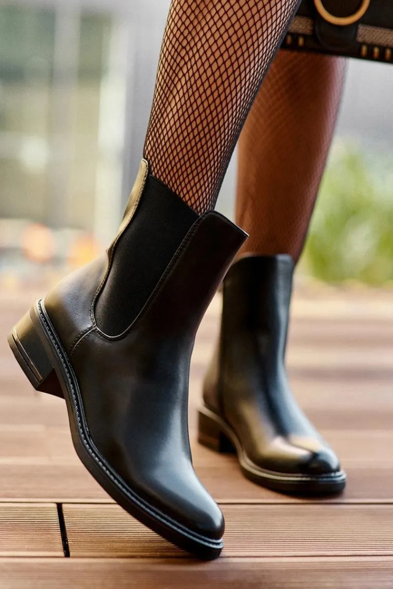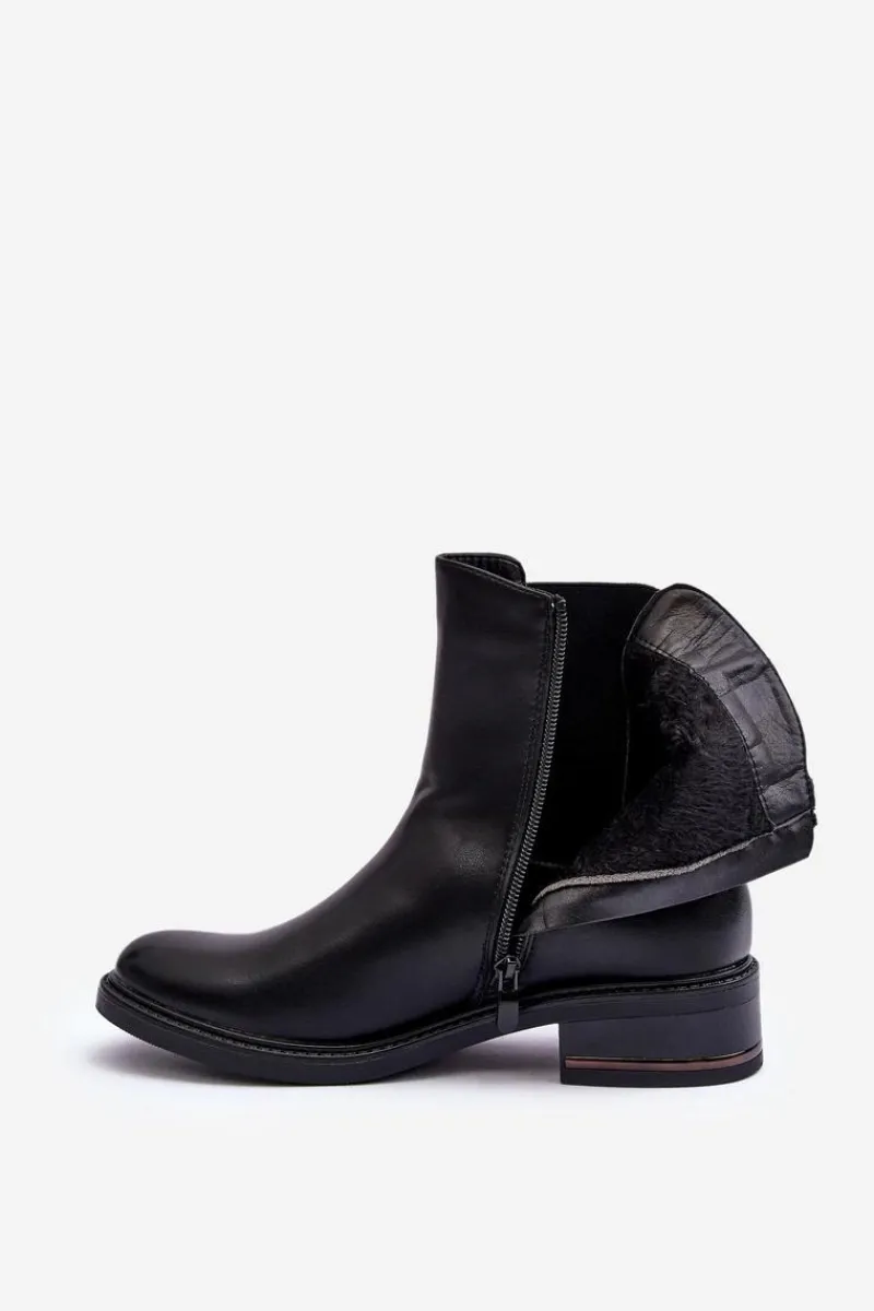 Klasyczne botki damskie z cholewką za kostkę. Osadzone na płaskim, stabilnym obcasie. Model wykonany z eko skóry. Idealne do jesiennych stylizacji! Przy wyborze rozmiaru prosimy sugerować się tabelą rozmiarów.
