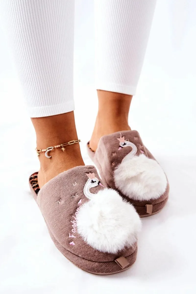 Klasyczne papcie wykonane z materiału. Posiadają ocieplenie w postaci przyjemnego w dotyku koca obuwniczego. Wkładka materiałowa. Z przodu papci widnieje piękny łabędź z futrzanym tułowiem. Posiadają grubą platformę, która świetnie izoluje od zimnego podłoża. Koniecznie musisz je mieć! Przy wyborze rozmiaru prosimy sugerować się tabelą rozmiarów.