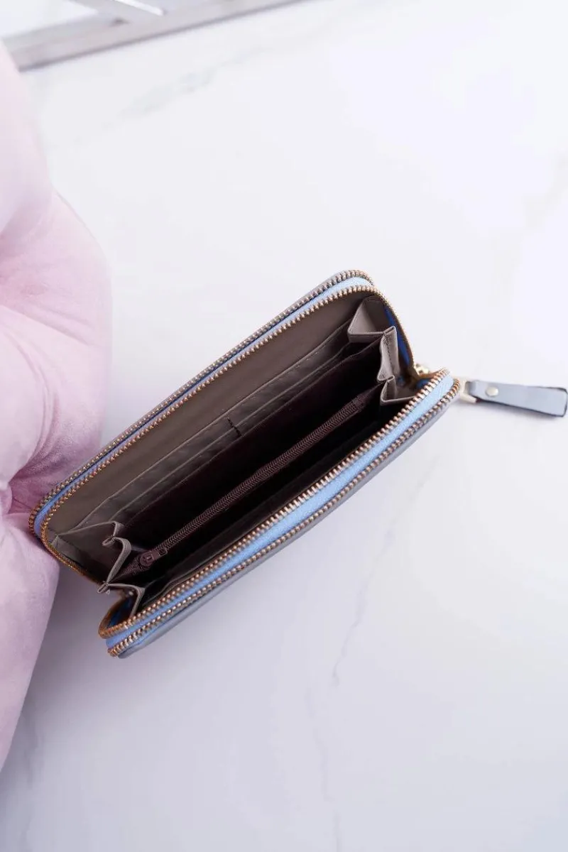 Przedstawiamy piękne portfele dla eleganckich Pań, dostępne w kilku cudownych kolorach. Produkty te charakteryzuje wyjątkowa prostota i elegancją. Wykonywane są przy użyciu najwyższej klasy materiałów. Staranne i piękne wykończenie każdego portfela oddaje niesamowitą dbałość o detale oraz modowy gust. Portfel posiada zapinanie na złoty suwak. Pięknym zdobieniem jest przeszycie złotym suwakiem wokół portfela. Wewnątrz znajdują się trzy duże komory z czego jedna zapinana jest na zamek oraz dużo kieszonek na karty.