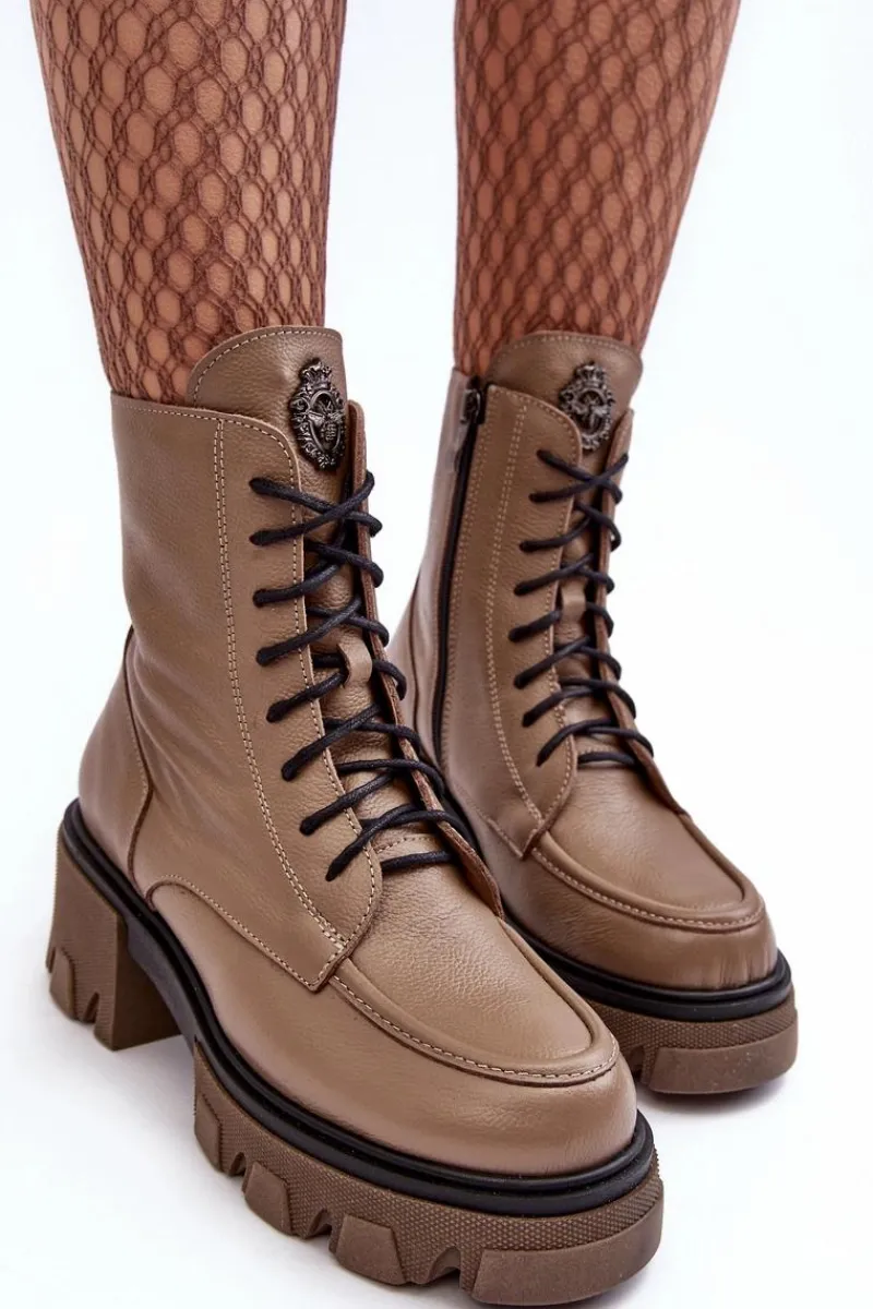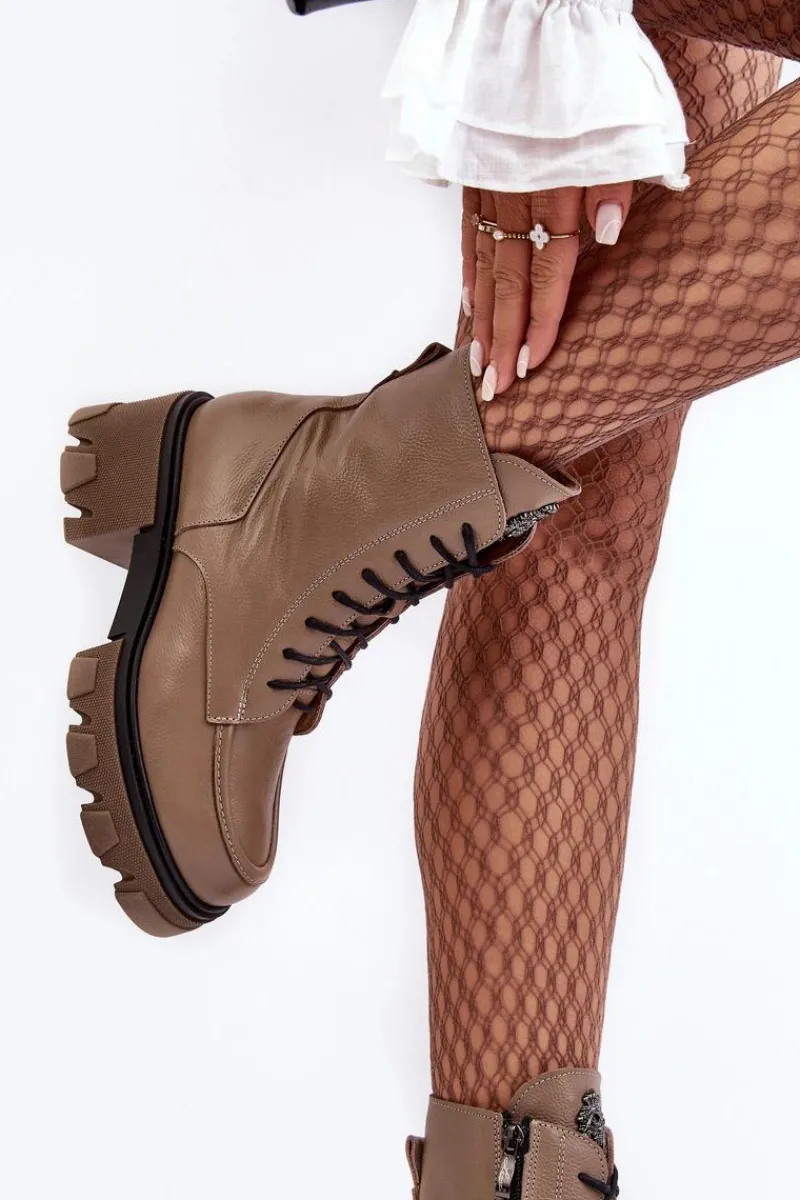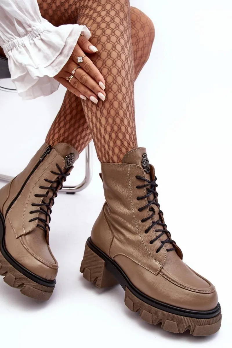Modne, damskie botki zostały wykonane z wysokiej jakości naturalnych skór. Posiadają klasyczne sznurowanie oraz suwak z boku cholewki. Zapiętek jest usztywniany. Botki osadzono na platformie i masywnym, płaskim obcasie. Podeszwa jest antypoślizgowa. Botki wewnątrz zostały ocieplone kocem obuwniczym. Wkładka jest miękka i wygodna podczas użytkowania. Przy wyborze rozmiaru prosimy sugerować się tabelą rozmiarów.