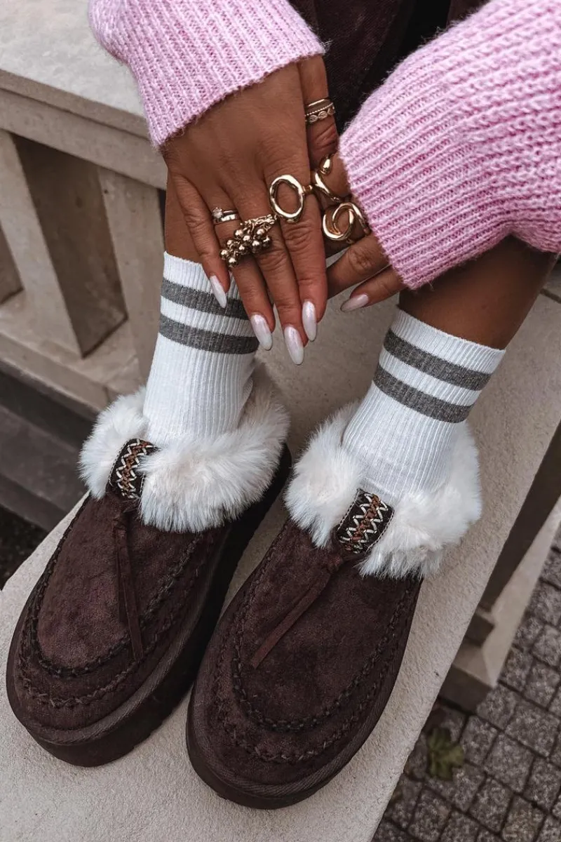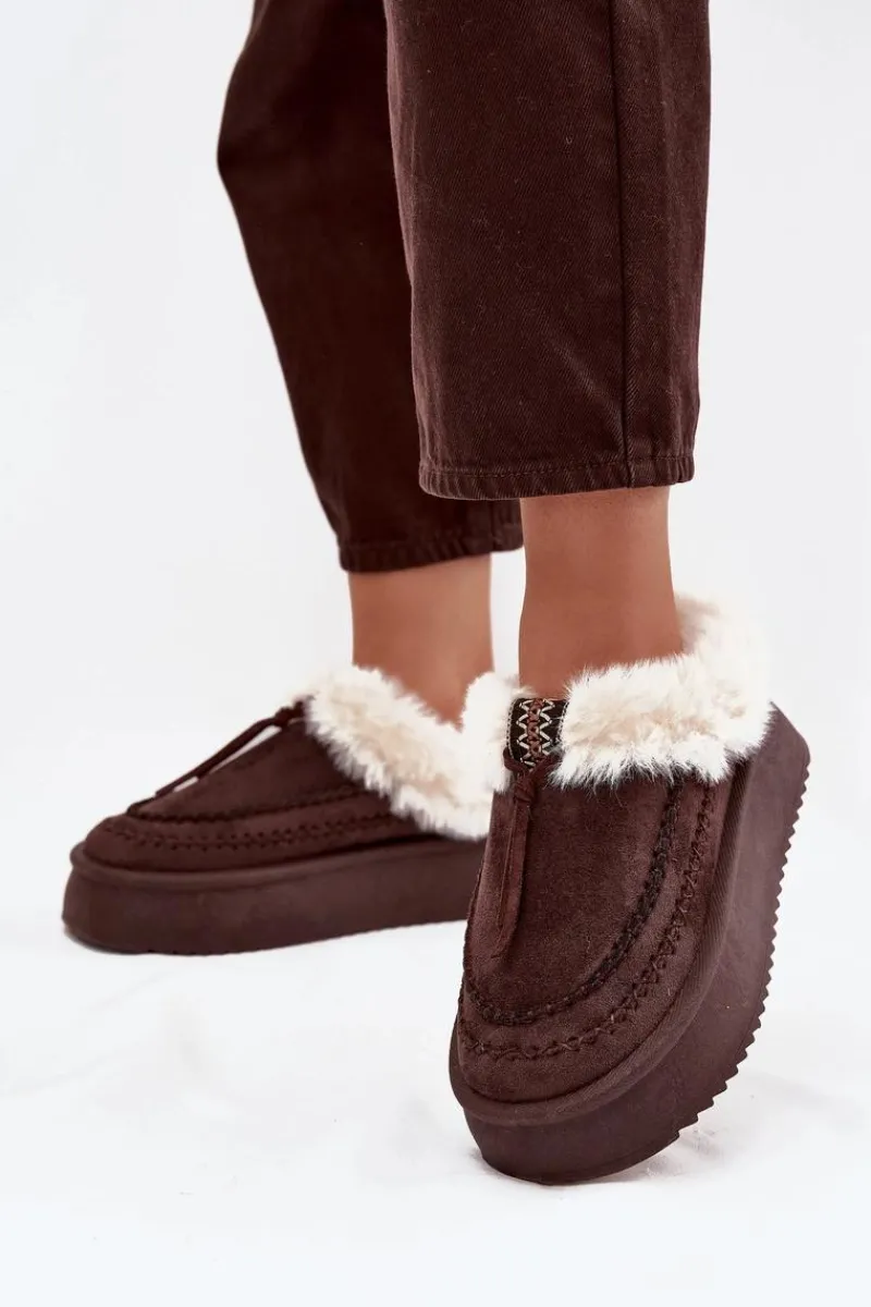 Śniegowce damskie wykonane z eko zamszu to idealne połączenie stylu i wygody na zimowe dni. Osadzone na platformie, która delikatnie wysmukla sylwetkę i doskonale izoluje od chłodnego podłoża, gwarantują komfort podczas noszenia. Górna część cholewki ozdobiona została miękkim futerkiem i dekoracyjnym paseczkiem, co nadaje całości modnego, zimowego charakteru. Wnętrze butów również ocieplone jest futerkiem, zapewniając ciepło i przyjemne otulenie stóp nawet w mroźne dni. To stylowe śniegowce, które świetnie sprawdzą się w codziennych zimowych stylizacjach.