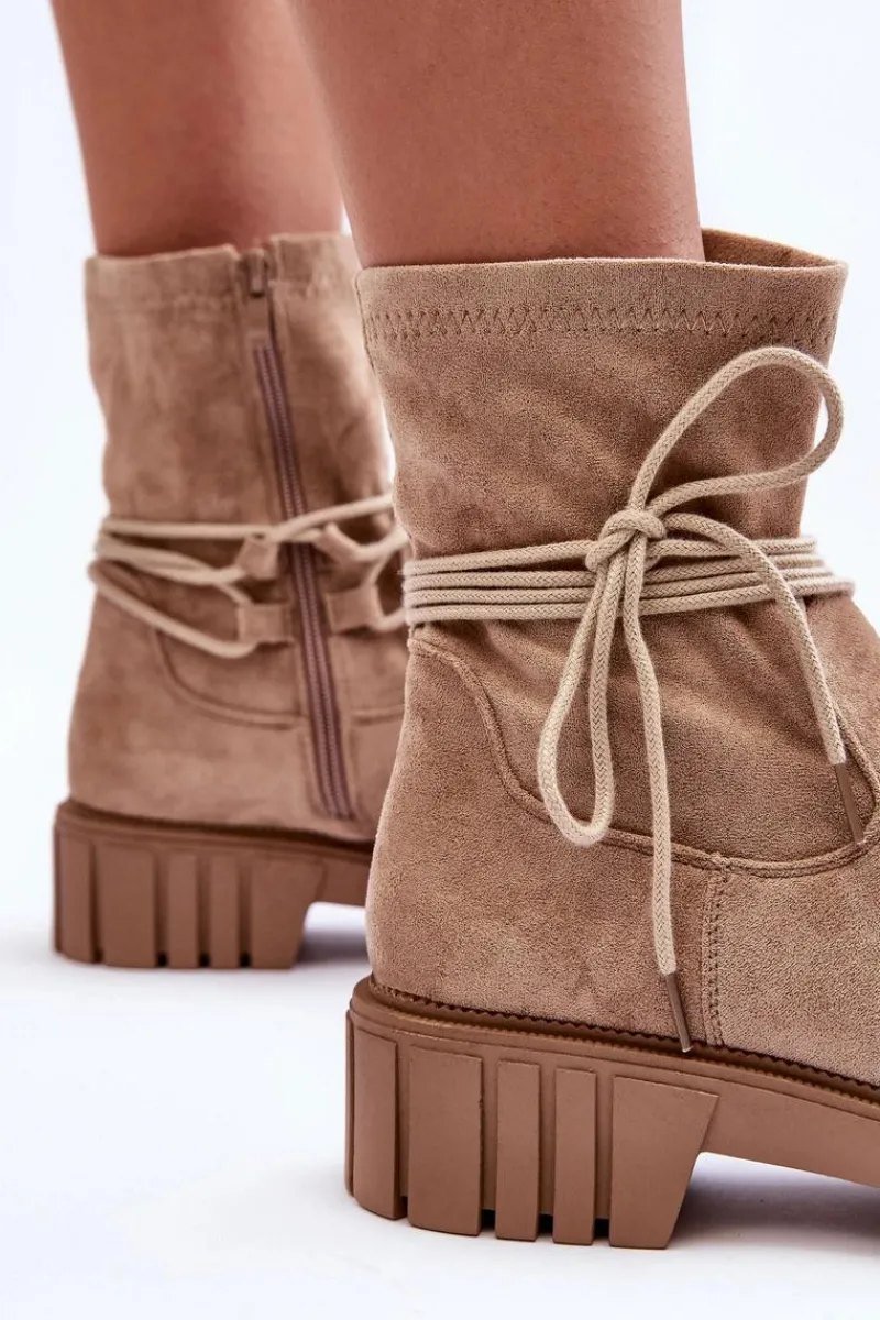Klasyczne botki damskie zostały wykonane z miłego w dotyku eko zamszu. Zapinane są z boku cholewki na suwak. Cholewka wzbogacona została wiązaniem. Botki posiadają usztywniany zapiętek. Osadzone na platformie oraz masywnym, płaskim obcasie. Przy wyborze rozmiaru prosimy sugerować się tabelą rozmiarów.