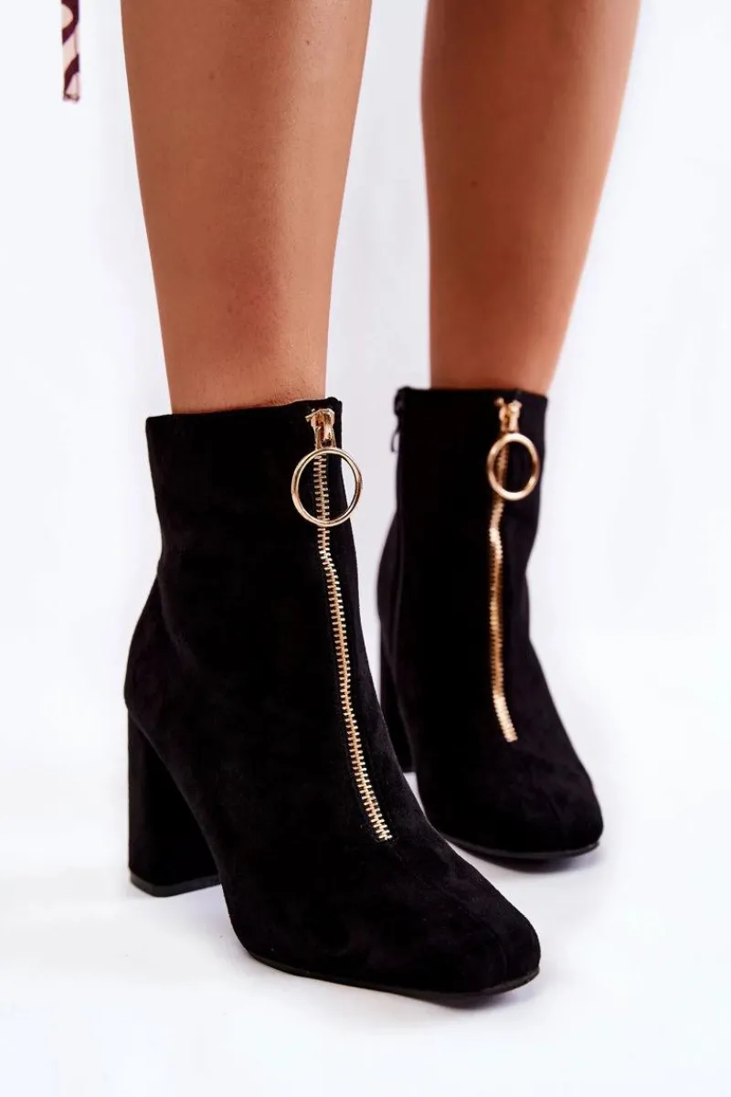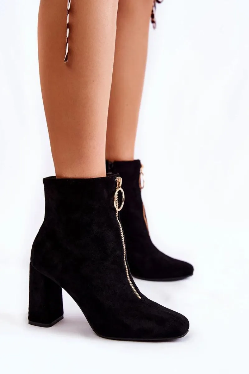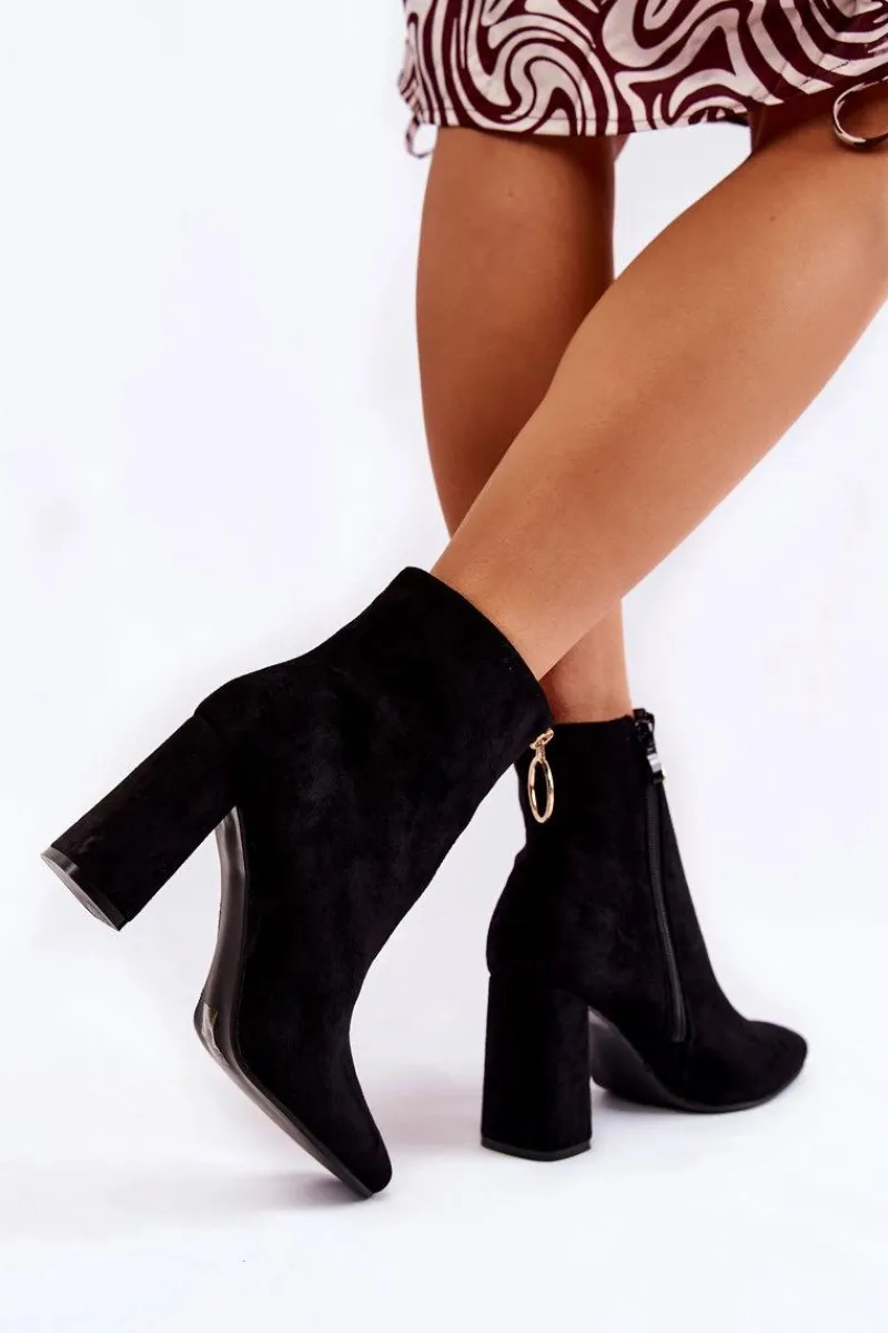 Modne botki posiadają cholewkę zasłaniającą kostkę oraz kwadratowy nosek. Wykonane z eko zamszu. Posiadają zapięcie na zamek błyskawiczny. Od wysokości śródstopia znajduje się ozdobny suwak z zawieszką. Osadzone na obcasie w postaci słupka. Wewnątrz zostały ocieplone kocem obuwniczym, natomiast wkładka została wykonana z eko skóry. Przy wyborze rozmiaru prosimy sugerować się tabelą rozmiarów.
