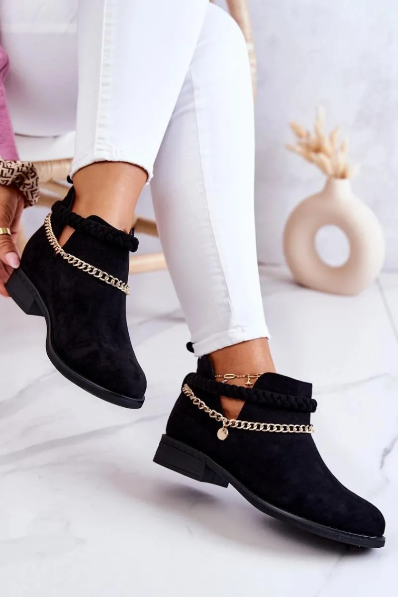 Botki damskie wykonane z eko zamszu ozdobione łańcuszkiem oraz plecionym paseczkiem w postaci warkoczyka. Posiadają płaski obcas. W środku znajduje się materiałowa wkładka. Z boku cholewki posiadają wycięcia. Idealne na wiosenno-letnią porę! Tego modelu nie powinno zabraknąć w Twojej szafie! Koniecznie musisz je mieć! Przy wyborze rozmiaru prosimy sugerować się tabelą rozmiarów.