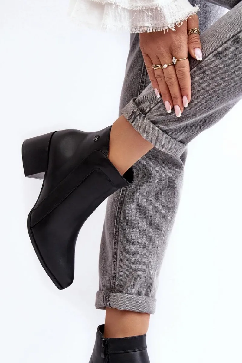 Botki damskie wykonane z eko skóry. Osadzone na niskim obcasie. Środek ocieplony kocem obuwniczym. Model ten zapinany jest na suwak z boku. Cholewka wzbogacona przeszyciami oraz małą ozdobą. Noski w szpic optycznie wysmuklą nogi. Dodatkowo zapiętek w tym obuwiu jest usztywniony. Świetny model, który będzie pasować do wielu jesienno-zimowych stylizacji! Przy wyborze rozmiaru prosimy sugerować się tabelą rozmiarów.