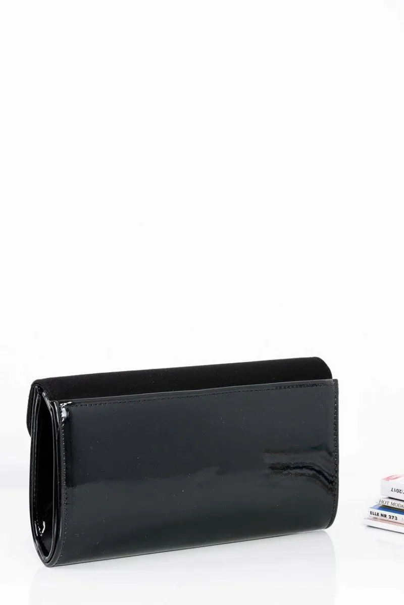 Niezwykła damska torebka-kopertówka, którą można nosić na dwa sposoby, w ręku oraz na ramieniu dzięki doczepianemu złotemu łańcuszkowi, które nadaje jej jednocześnie eleganckiego wyglądu. Nie można oderwać od niej oczu. Wygodne zapinanie dzięki zatrzaskowi. Wewnątrz znajduje się jedna duża komora oraz jedna mała kieszonka na drobiazgi. Wykonana z delikatnego w dotyku ekozamszu oraz lakierowanej ekoskóry.. Dostępna w kilku kolorach!