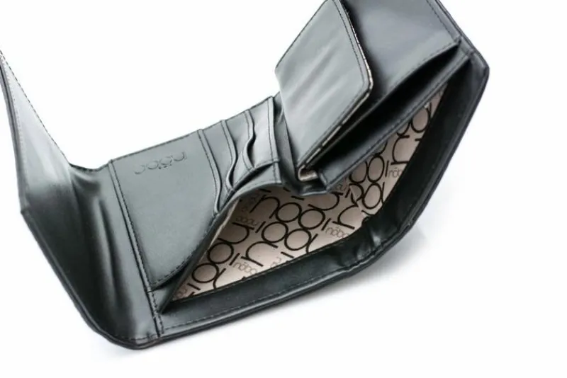 Dopełnieniem każdej kobiecej stylizacji jest nie tylko torebka i buty ale również dobrze dobrany portfel. Portfele renomowanej firmy NOBO są cenione przez wszystkie kobiety. Prezentowany model wykończony jest wysokiej jakości skórą ekologiczną o delikatnie chropowatej fakturze. Portfel zapinany jest na solidny nap. Wewnątrz znajduje się 5 kieszonek na karty, 1 duża komora na banknoty oraz 1 przegródka na bilon, która również zapinana jest na nap.
