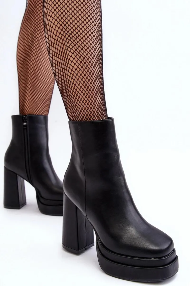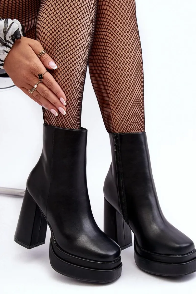 Masywne botki damskie wykonane z eko skóry. Osadzone na wysokim obcasie w postaci słupka i platformie. Noski w kwadrat. Zapiętek jest usztywniony. Model ten zapinany jest na suwak z boku. Botki te doskonale sprawdzą się w jesiennych stylizacjach. Przy wyborze rozmiaru prosimy kierować się tabelą rozmiarów
