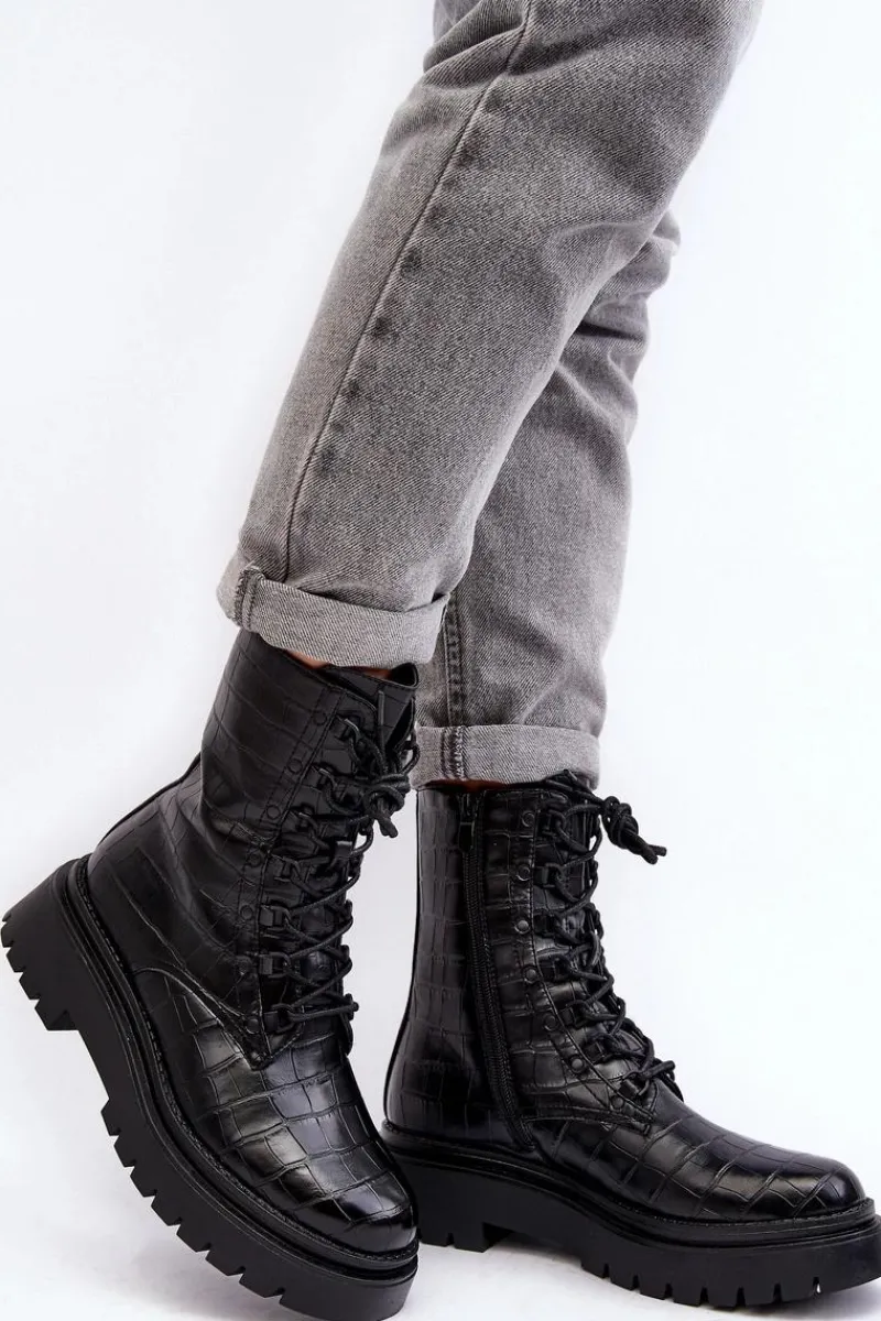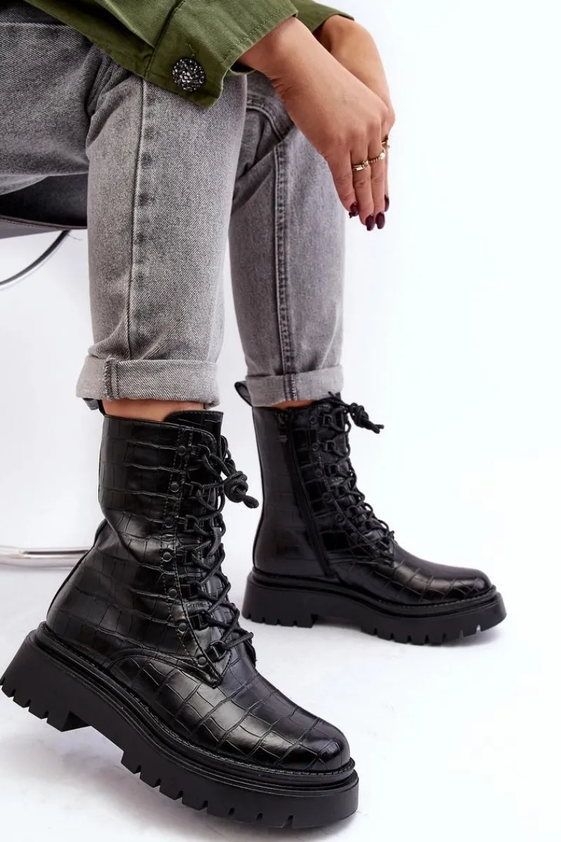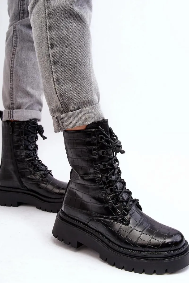 Botki damskie wykonane z eko skóry. Osadzone na płaskim obcasie oraz grubej podeszwie, co gwarantuje stabilność i komfort noszenia. Zamek z boku cholewki oraz dodatkowe sznurowanie, zapewnia idealne dopasowanie. Noski zaokrąglone. Środek ocieplony kocem obuwniczym. Doskonale sprawdzą się w różnych jesienno-zimowych stylizacjach! Przy wyborze rozmiaru prosimy sugerować się tabelą rozmiarów.
