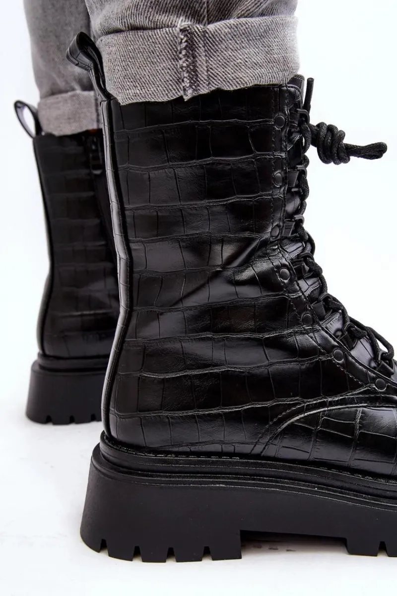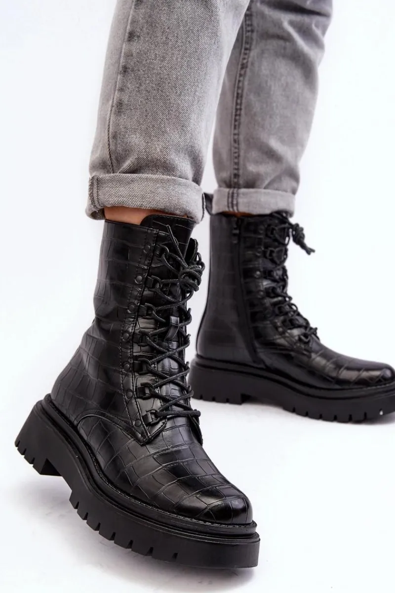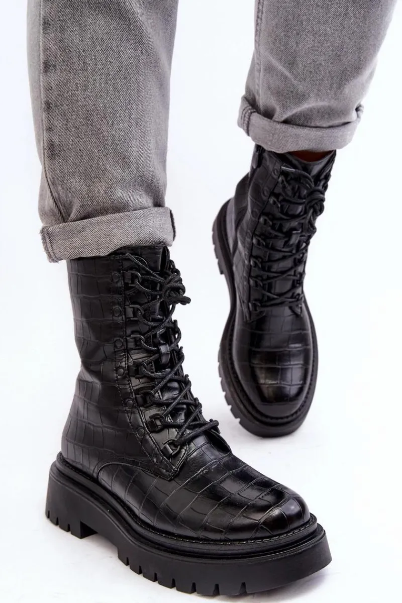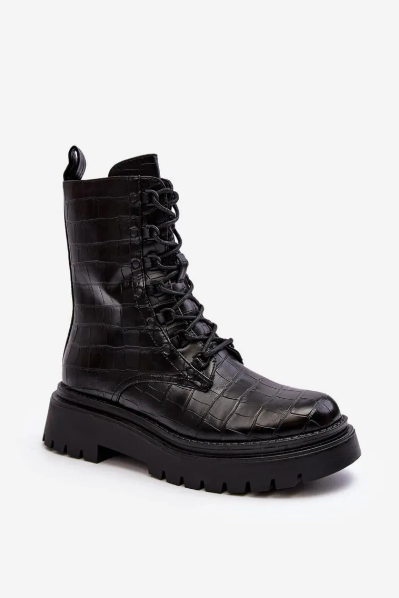 Botki damskie wykonane z eko skóry. Osadzone na płaskim obcasie oraz grubej podeszwie, co gwarantuje stabilność i komfort noszenia. Zamek z boku cholewki oraz dodatkowe sznurowanie, zapewnia idealne dopasowanie. Noski zaokrąglone. Środek ocieplony kocem obuwniczym. Doskonale sprawdzą się w różnych jesienno-zimowych stylizacjach! Przy wyborze rozmiaru prosimy sugerować się tabelą rozmiarów.