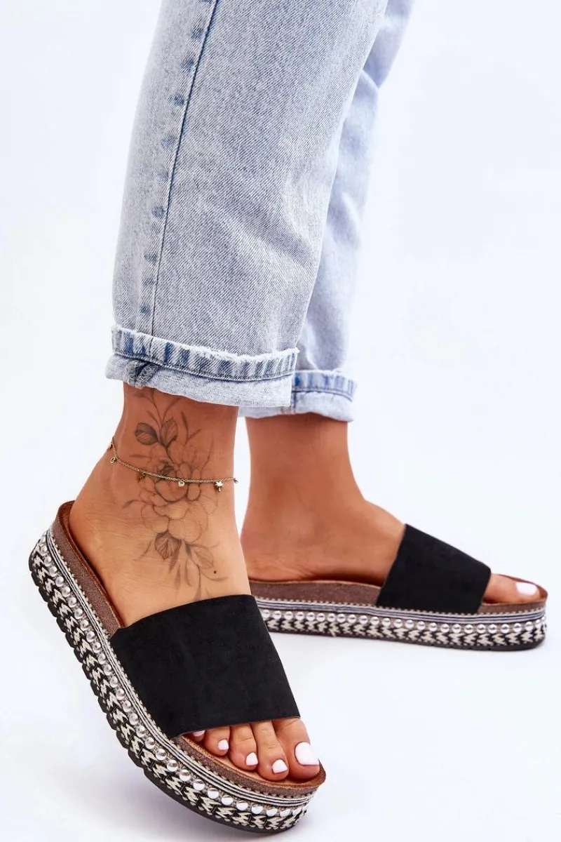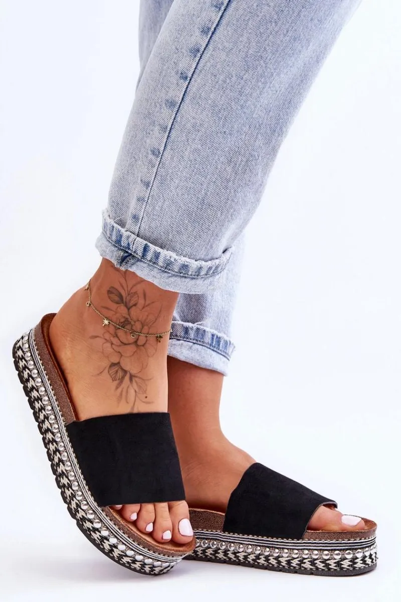 Damskie klapki zostały osadzone na masywnej platformie ze zdobieniami w postaci sznureczków oraz ćwieków. Profilowana wkładka jest wykonana z przyjemnego w dotyku eko zamszu. Platforma została ozdobiona sznureczkami oraz ćwiekami. Nosek jest odkryty i zaokrąglony. Ten model powinien być Twój! Przy wyborze rozmiaru prosimy sugerować się tabelą rozmiarów.