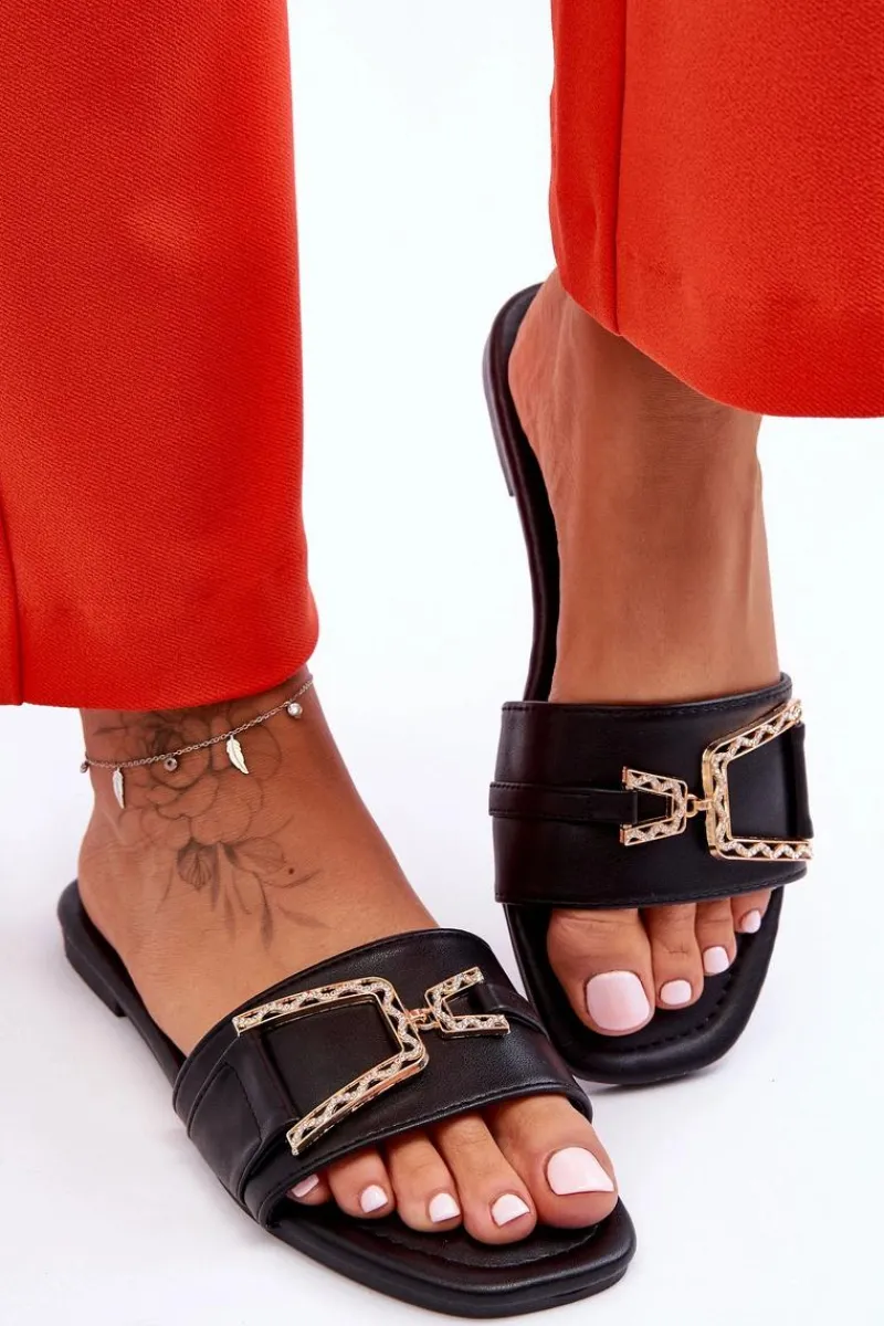 Damskie klapki zostały wykonane z eko skóry. Posiadają na przodzie ozdobę z tworzywa sztucznego z dżetami imitującymi cyrkonie. Klapki osadzono na delikatnym, płaskim obcasie. Wkładka jest wygodna w użytkowaniu i została wykonana z eko skóry. Nosek w tym obuwiu jest odkryty i lekko kwadratowy. Ten model powinien być Twój! Przy wyborze rozmiaru prosimy sugerować się tabelą rozmiarów.