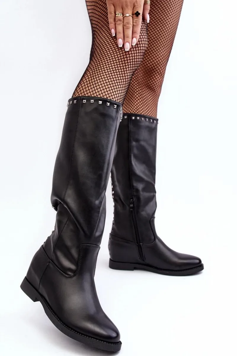 Modne kozaki damskie z cholewką przed kolano. Wykonane z eko skóry. Osadzone na płaskim obcasie. Noski w migdał. Zapiętek usztywniony. Cholewka ozdobiona ćwiekami. Model wsuwany z dodatkowym krótkim suwakiem na dole. Przy wyborze rozmiaru prosimy kierować tabelą rozmiarów.