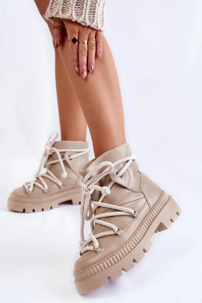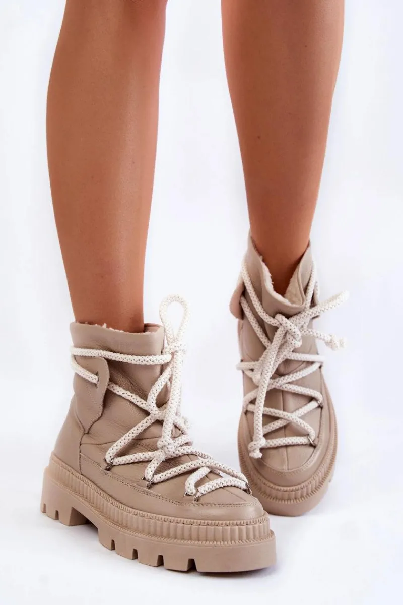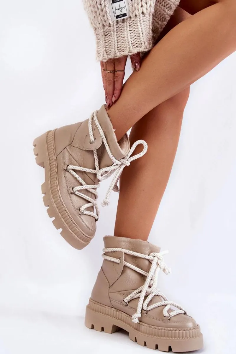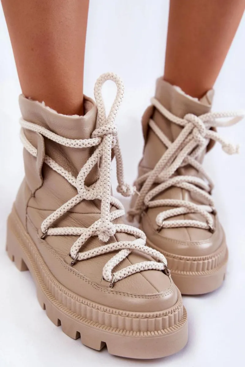 Świetne, damskie śniegowce zostały wykonane z wysokiej jakości skór. Model posiada grube, solidne sznurowanie. Botki zostały osadzone na płaskim obcasie oraz platformie ze żłobieniami. Śniegowce posiadają ocieplenie w postaci futerka oraz usztywniany zapiętek. Ten model z pewnością przyda się każdej miłośniczce ciepłego i wygodnego obuwia! Przy wyborze rozmiaru prosimy sugerować się tabelą rozmiarów.